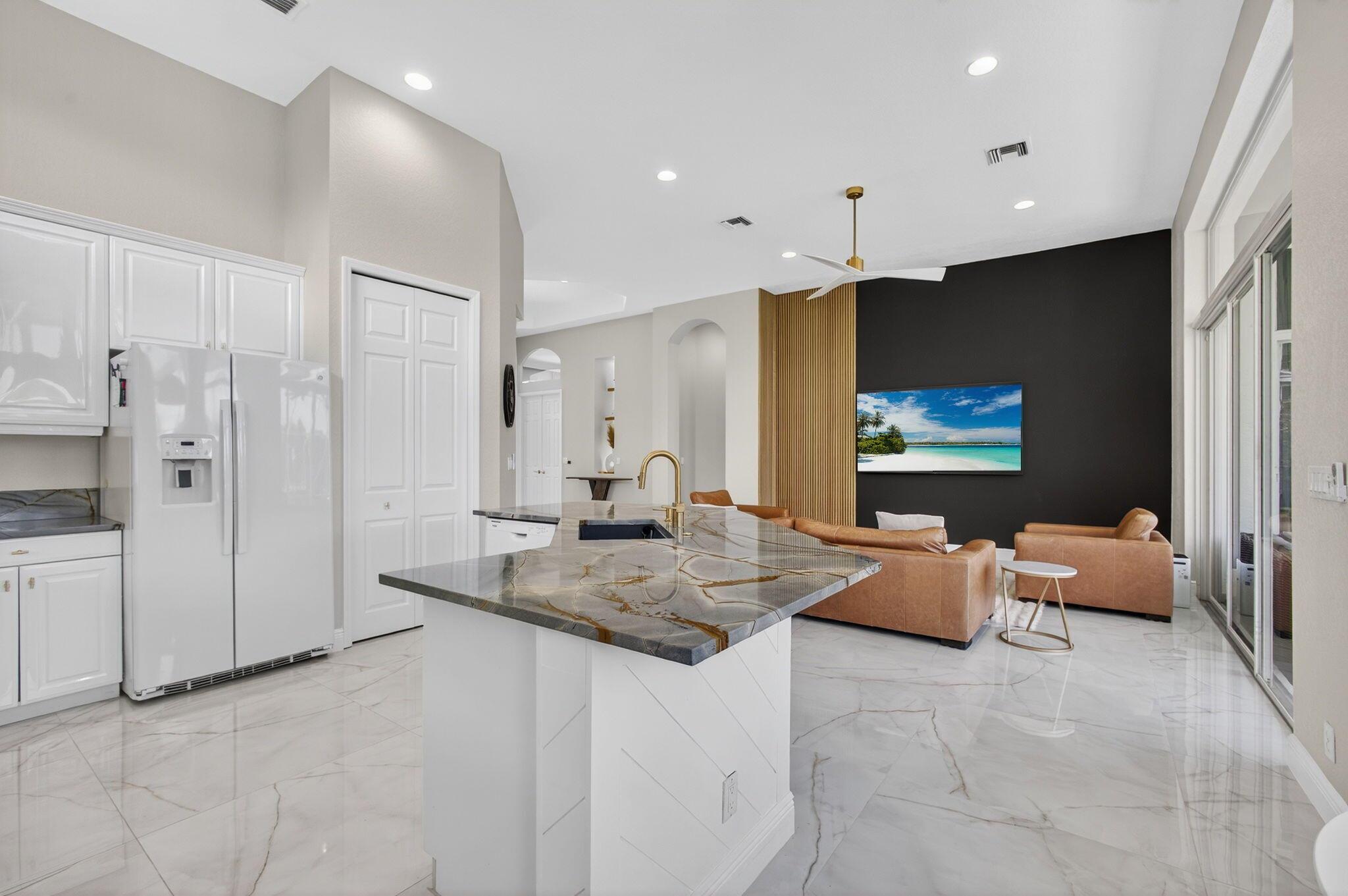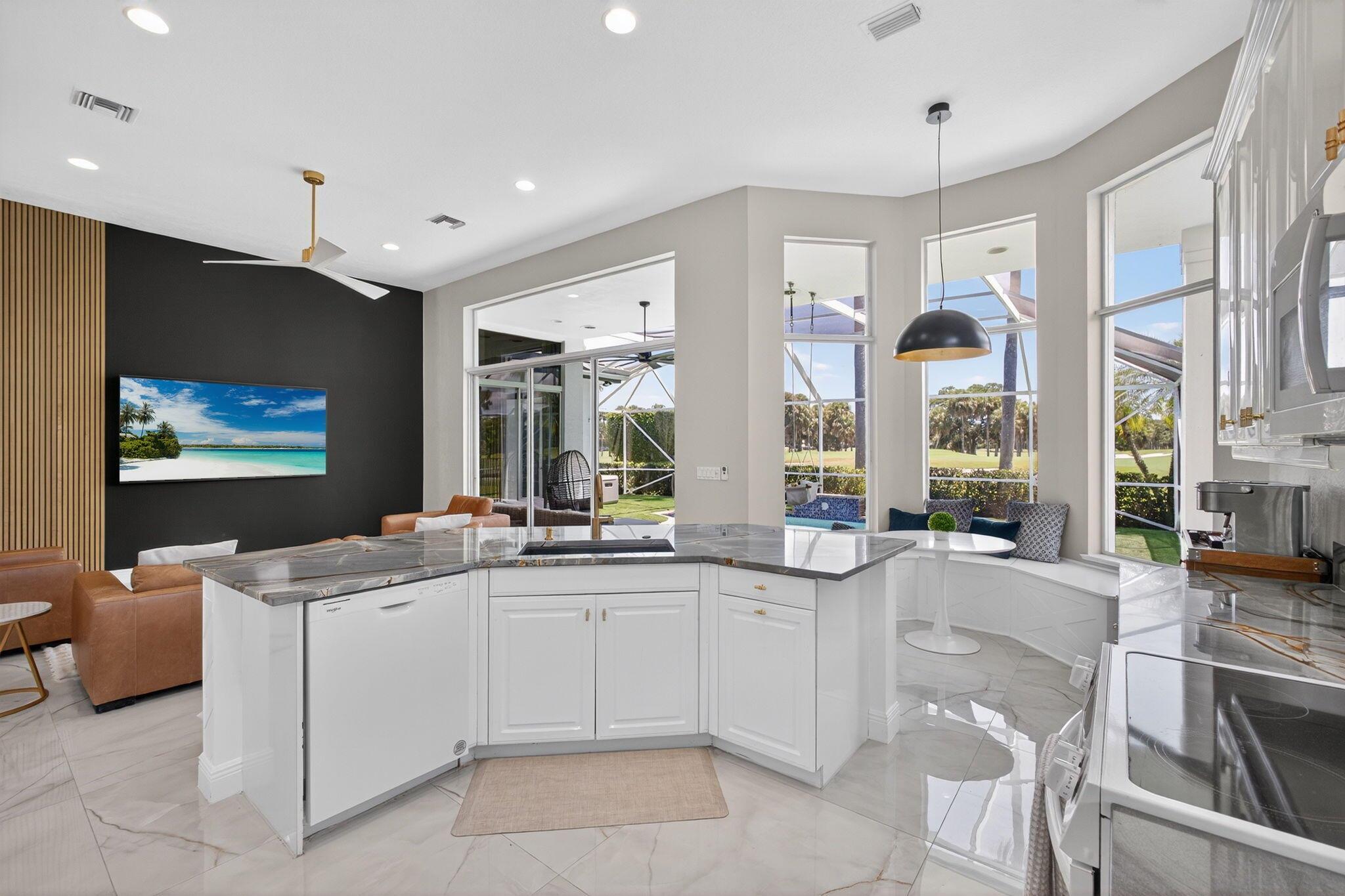 Set on a private cul-de-sac in the boutique Ironhorse community, this updated 4-bedroom, 4-bath ranch styled home offers panoramic views of the preserve, & the renowned Arthur Hills Championship golf course, with no mandatory membership. Be captivated by the 12-ft ceilings with abundant natural light, elegant new porcelain tile floors throughout, a brand-new roof (2024), new A/C, new pool heater, new water heater, new pool pump, new impact double front door, new tesla charger, new rock garden, extended driveway & fresh interior & exterior paint.The open-concept kitchen with quartz countertops, a built-in breakfast nook, & a shiplap-accented island, flowing into spacious living areas framed by custom wood panel media wall & sweeping golf views, while the primary suite boasts custom his &