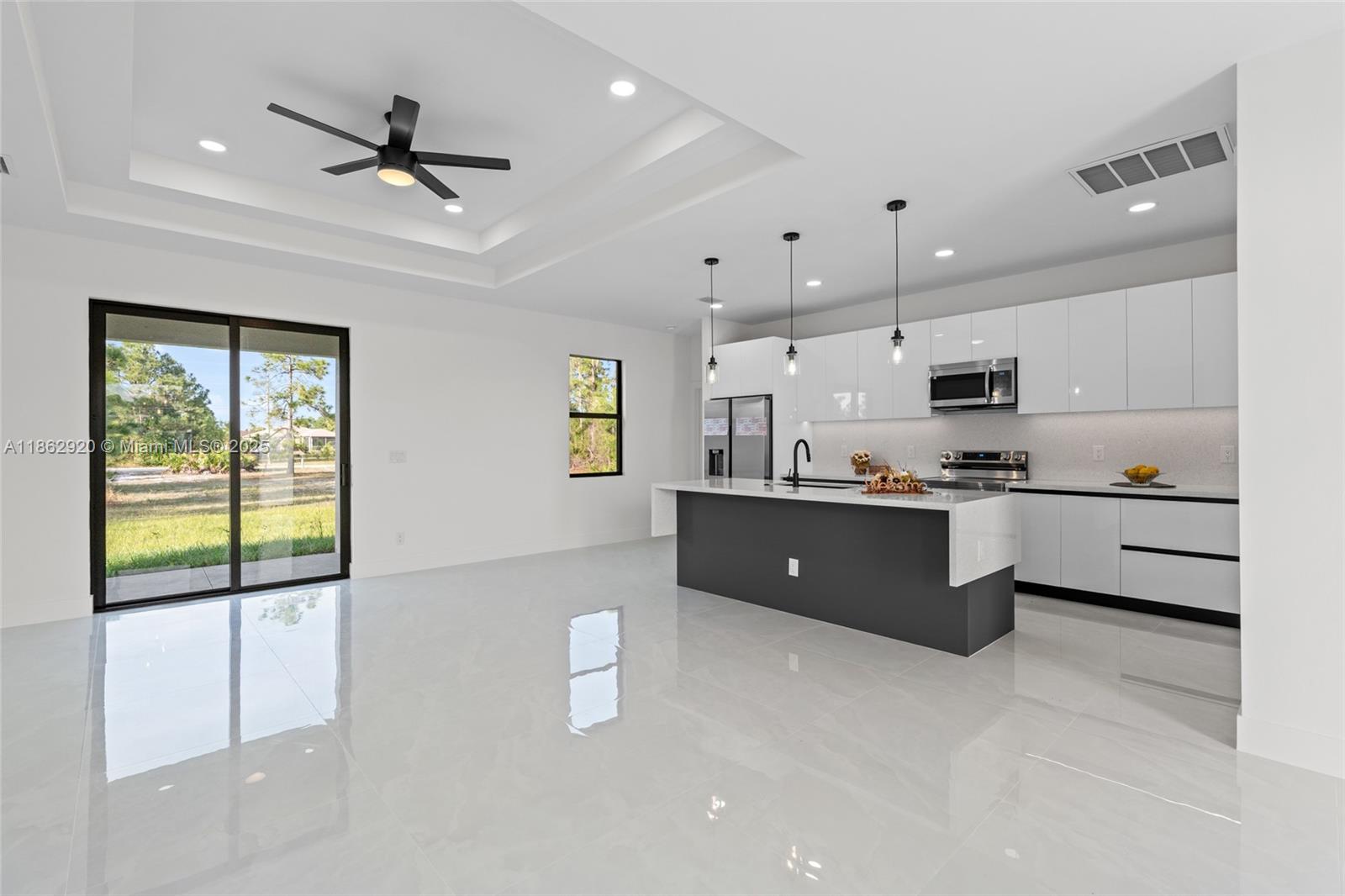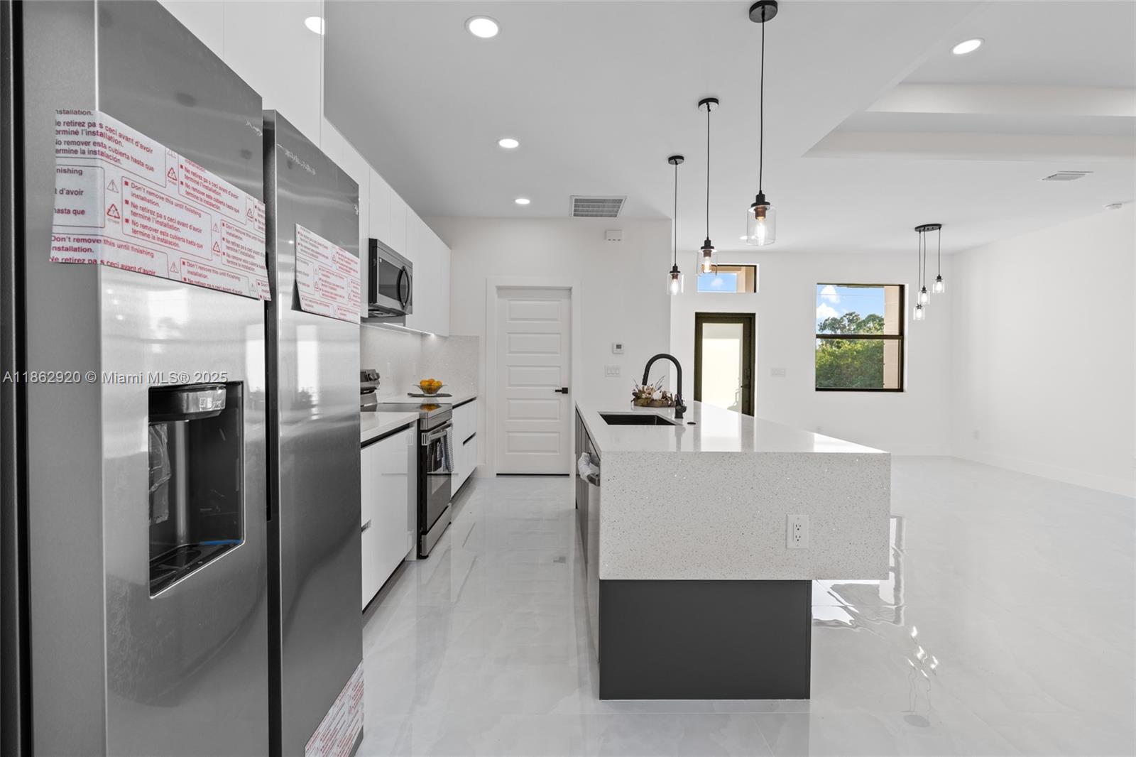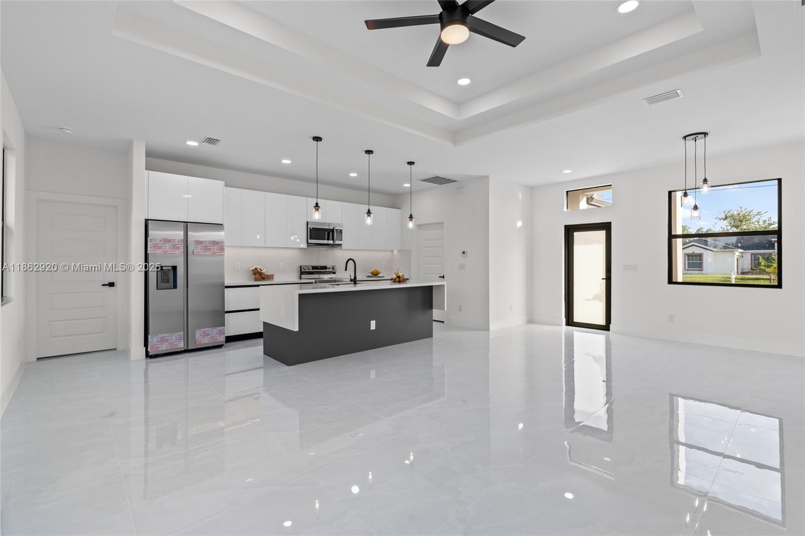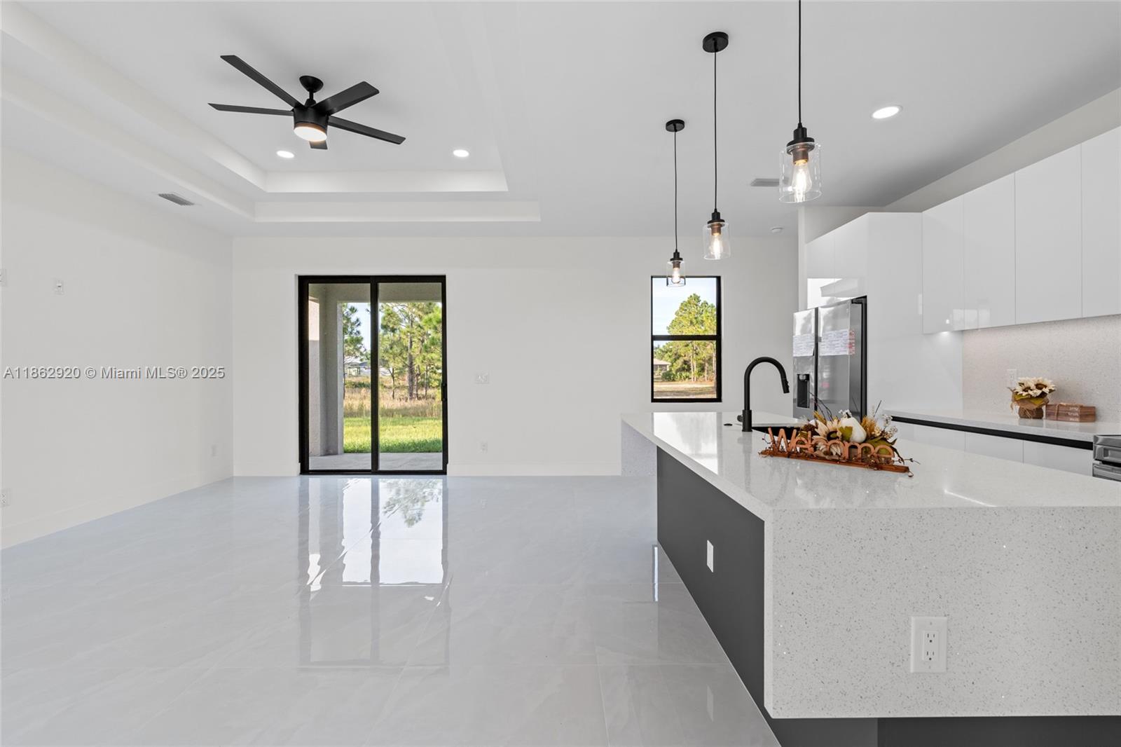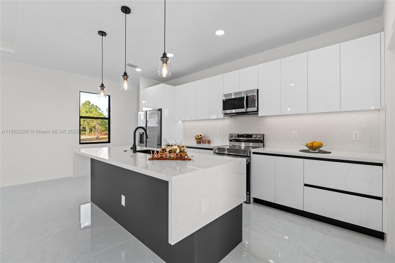 Discover this contemporary new construction home featuring 3 bedrooms and 2 bathrooms, perfectly situated on a desirable lot in Lehigh Acres, Florida. This stunning residence offers spacious living with an open floor plan, an in-house laundry room and an abundance of natural light. Step inside to elegant porcelain flooring throughout, a sleek modern kitchen with quartz countertops, stainless steel appliances, contemporary cabinets, and fixtures. The impressive waterfall-edge island is perfect for both cooking and entertaining. Outside, enjoy a large driveway and walkway. Conveniently located near shopping, restaurants, and essential services, this home combines contemporary design with everyday practicality. Call today to schedule your private showing.