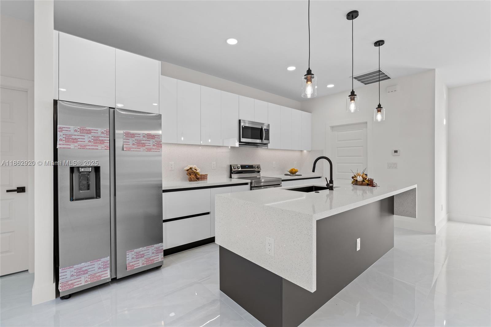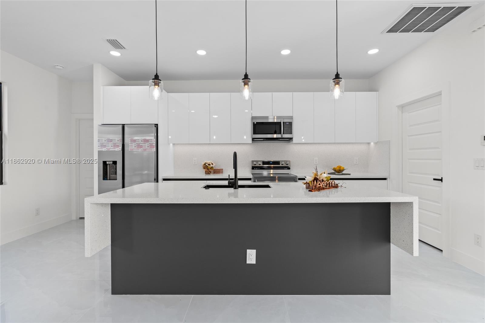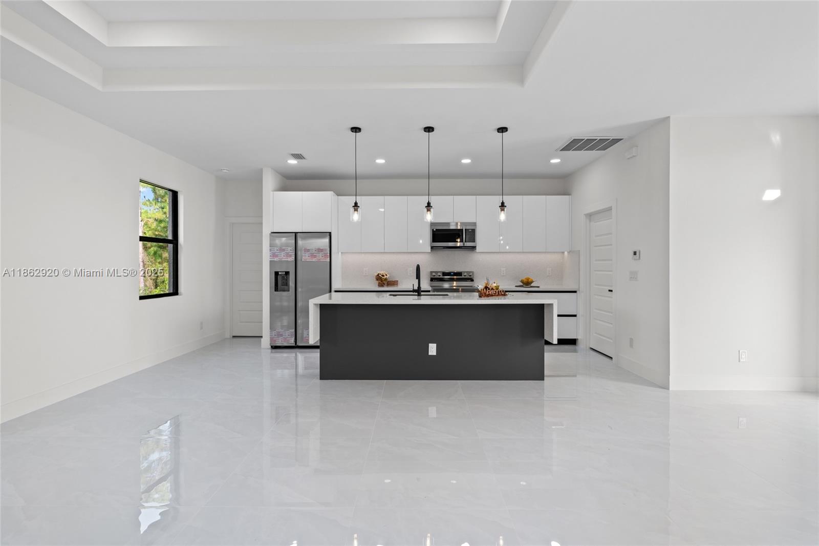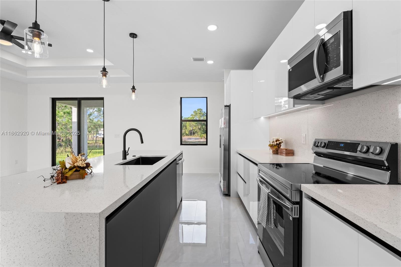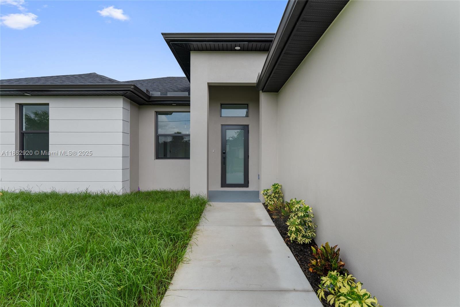 Discover this contemporary new construction home featuring 3 bedrooms and 2 bathrooms, perfectly situated on a desirable lot in Lehigh Acres, Florida. This stunning residence offers spacious living with an open floor plan, an in-house laundry room and an abundance of natural light. Step inside to elegant porcelain flooring throughout, a sleek modern kitchen with quartz countertops, stainless steel appliances, contemporary cabinets, and fixtures. The impressive waterfall-edge island is perfect for both cooking and entertaining. Outside, enjoy a large driveway and walkway. Conveniently located near shopping, restaurants, and essential services, this home combines contemporary design with everyday practicality. Call today to schedule your private showing.