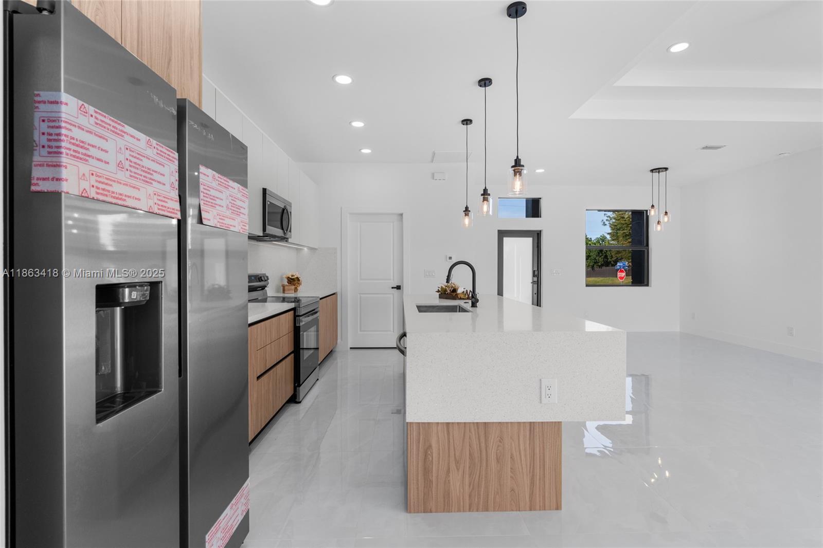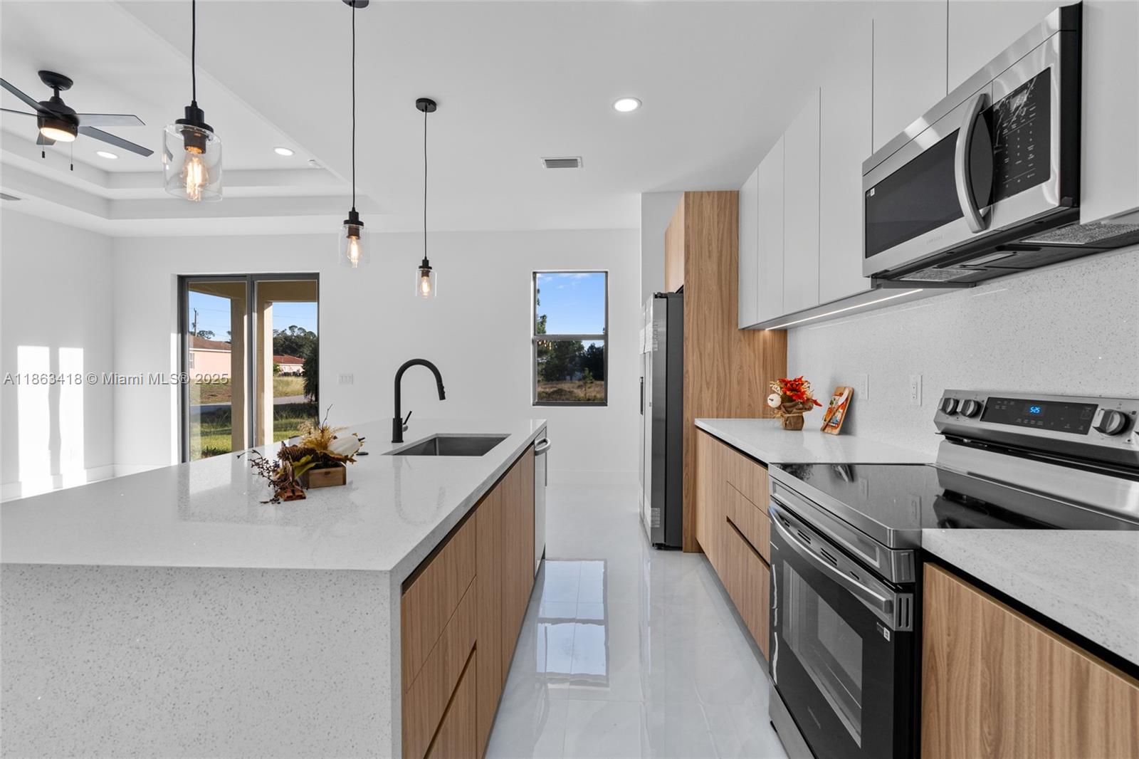 Stunning new contemporary construction home in Lehigh Acres, Florida, featuring 3 spacious bedrooms, 2 bathrooms. Thoughtfully designed for comfort and style, this home offer a functional layout with high-end finishes throughout. Inside, you'll find elegant porcelain flooring, sleek quartz countertops, and a chef-inspired kitchen complete with stainless steel appliances, modern fixtures, stylish cabinetry and kitchen under-cabinet lighting, making it perfect for both cooking and entertaining. It includes Premium upgrades as closet's carpentry in the laundry and master. Ideally situated on corner lot of over a quarter acre. Near shopping, dining, and essential amenities.