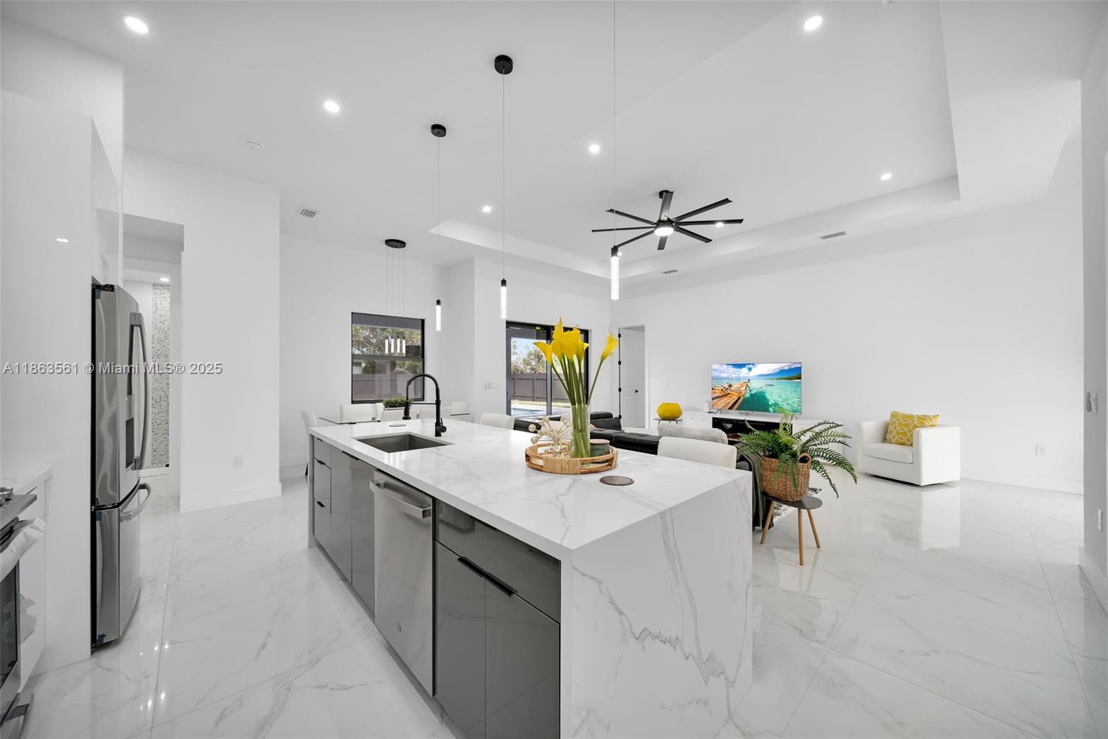 Experience modern Florida living in this 2024 new construction 4-bedroom, 2-bath home. The primary suite features dual walk-in closets and a tiled stand-up shower, while the second bath has backyard access. Enjoy a private saltwater pool with new heater. Porcelain tile flooring flows throughout, complemented by a 2-car garage, 4-car driveway, and storm-impact windows and doors. The chef’s kitchen boasts a Calacatta Quartz waterfall island, high-end appliances, and pop-up wireless charging. LED lighting, ceiling fans, and a dramatic living room fan enhance comfort. Step onto the lanai with a fully equipped outdoor Florida kitchen and lush landscaping with sprinkler system—luxury, style, and function all in one.