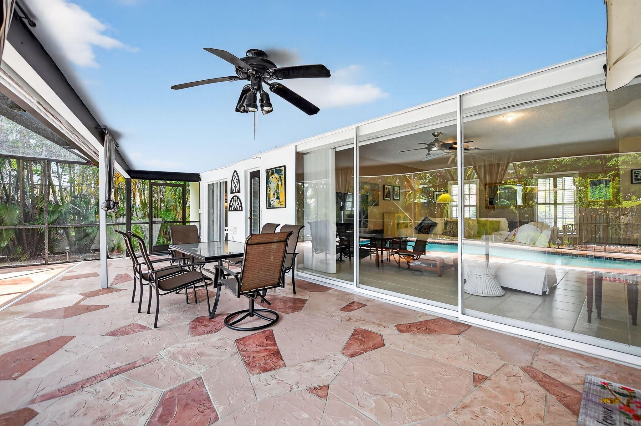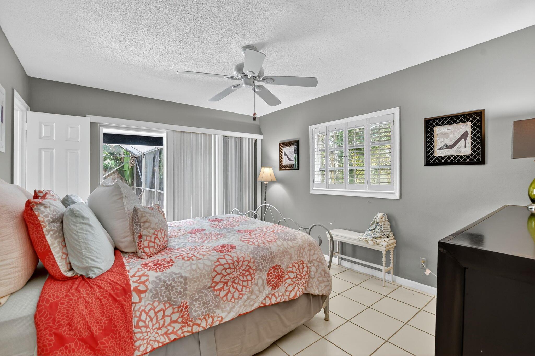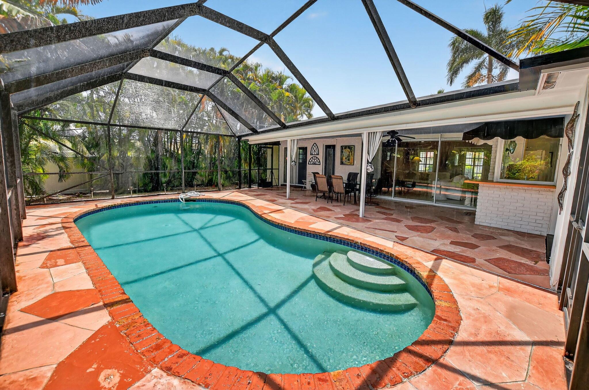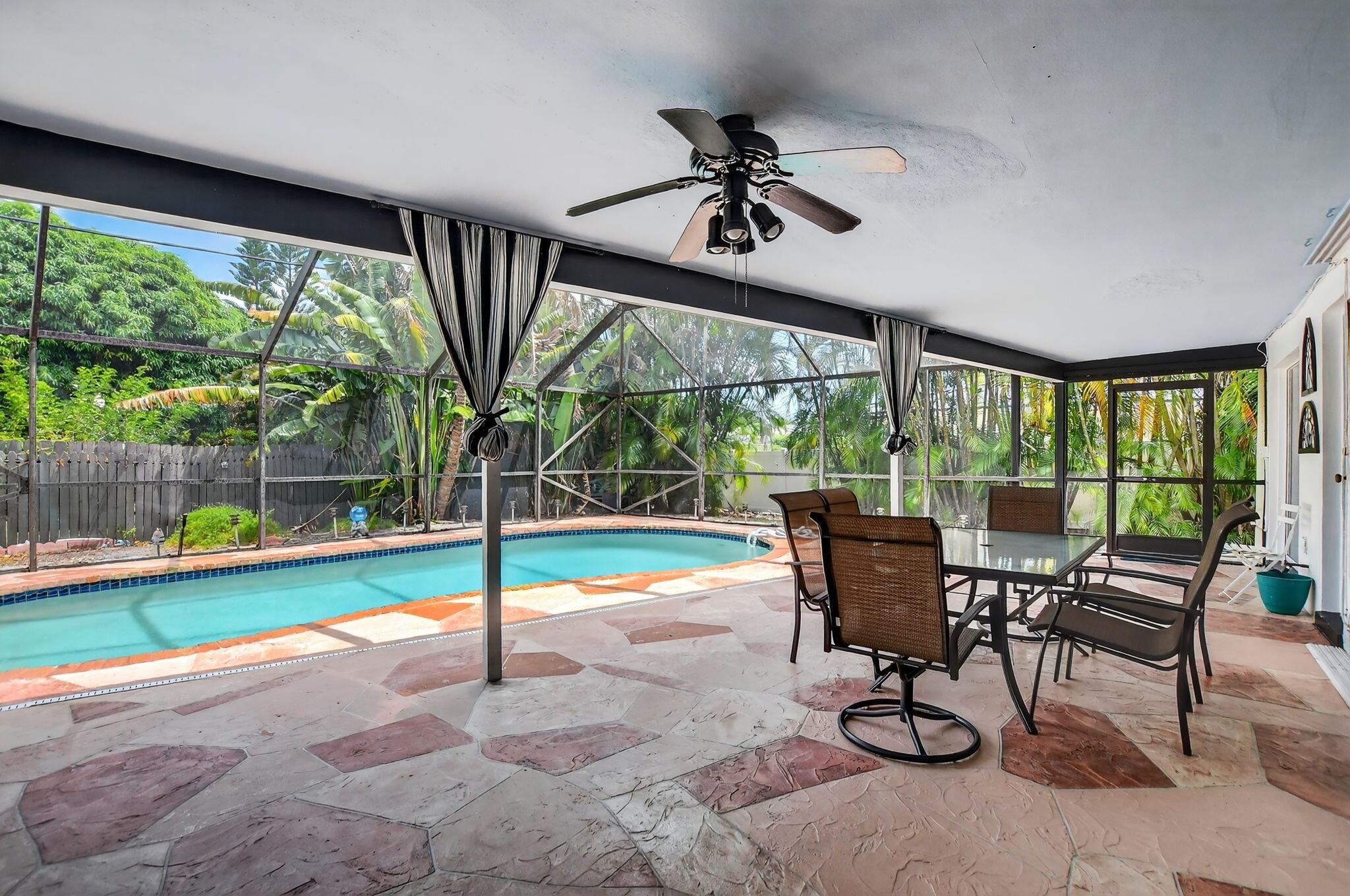 Step into PURE CHARM with this beautifully maintained two-bedroom corner-lot pool home, surrounded by lush tropical landscaping that sets the tone for a serene retreat. Nestled in one of the area's most desired neighborhoods, beautiful Paradise Palms. From the moment you arrive, the curb appeal shines-mature palm trees and vibrant greenery create a warm, welcoming entrance. Inside, the home feels light, bright and airy, with soft neutral tones, pastels and white brick, which compliments the natural sunlight pouring in through the elegant plantation shutters and sliding glass doors.