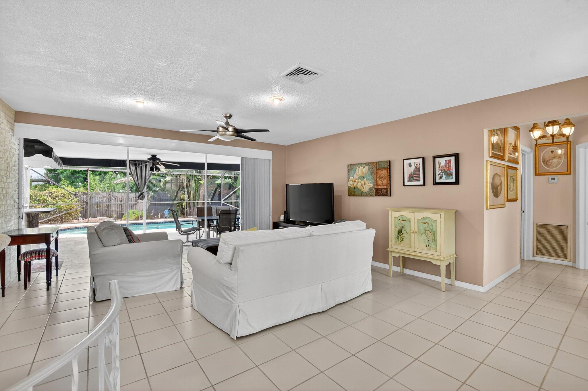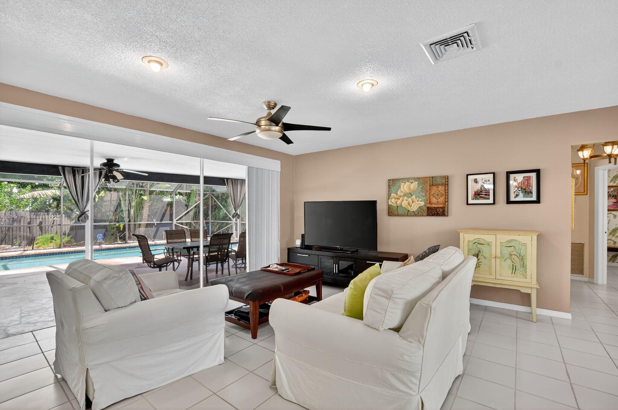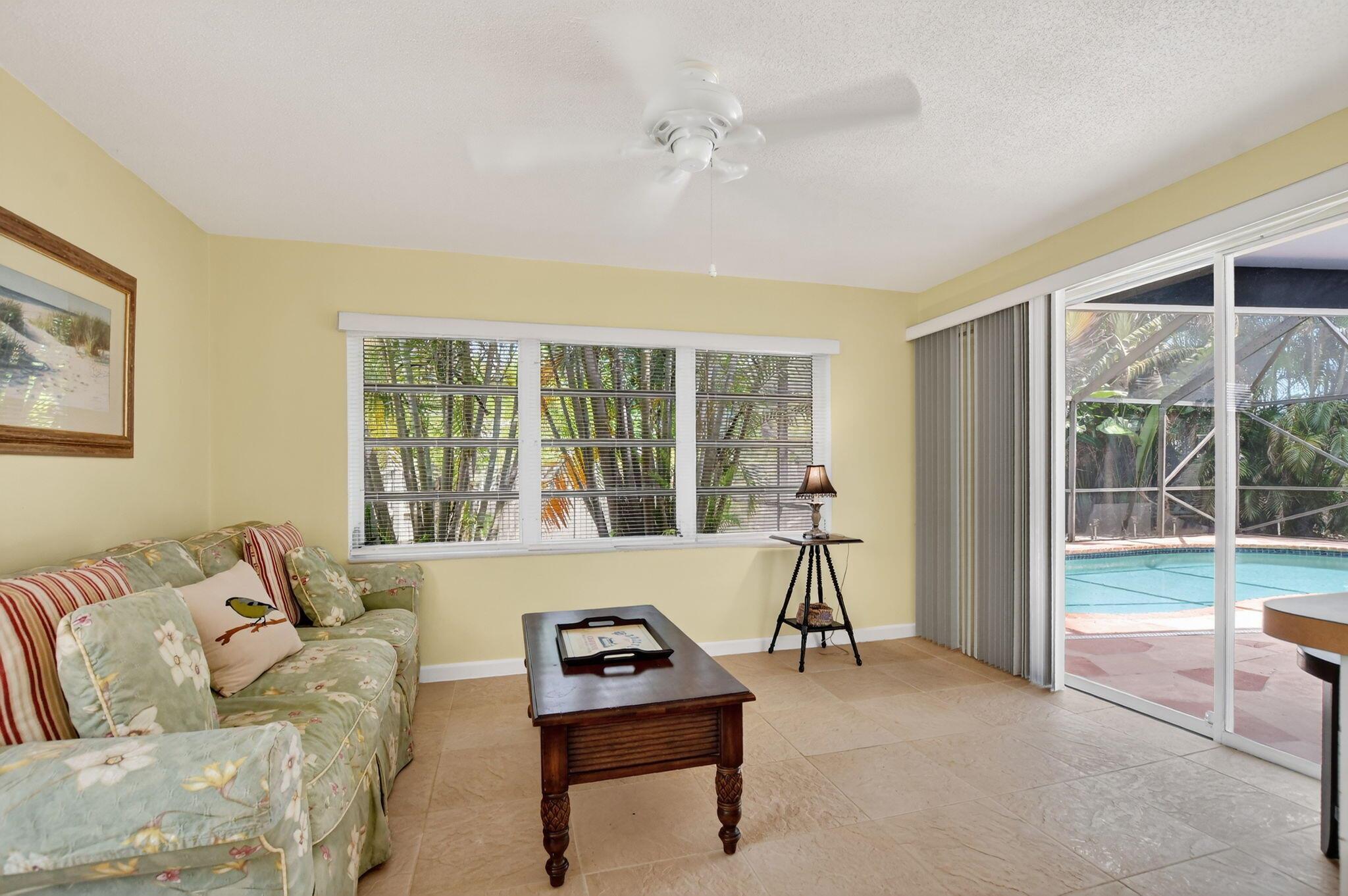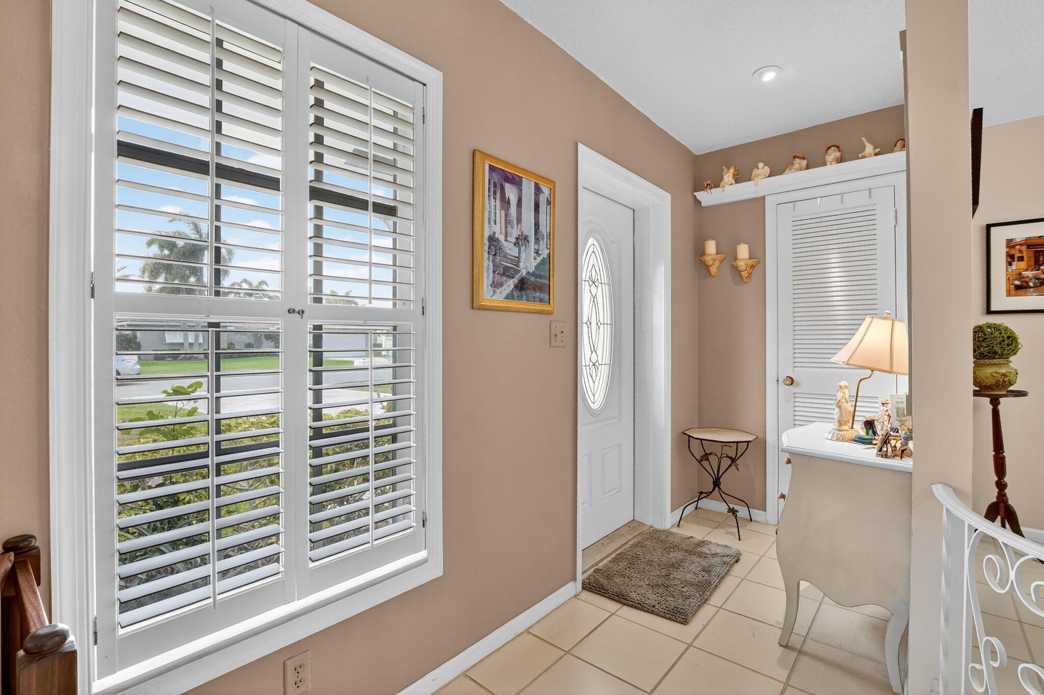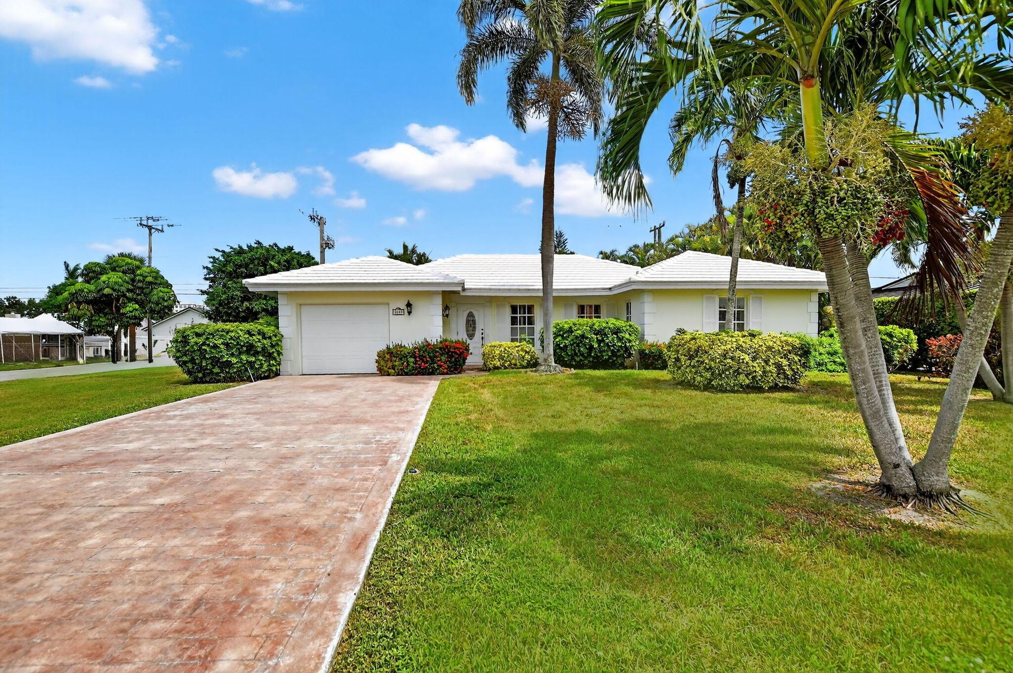 Step into PURE CHARM with this beautifully maintained two-bedroom corner-lot pool home, surrounded by lush tropical landscaping that sets the tone for a serene retreat. Nestled in one of the area's most desired neighborhoods, beautiful Paradise Palms. From the moment you arrive, the curb appeal shines-mature palm trees and vibrant greenery create a warm, welcoming entrance. Inside, the home feels light, bright and airy, with soft neutral tones, pastels and white brick, which compliments the natural sunlight pouring in through the elegant plantation shutters and sliding glass doors.