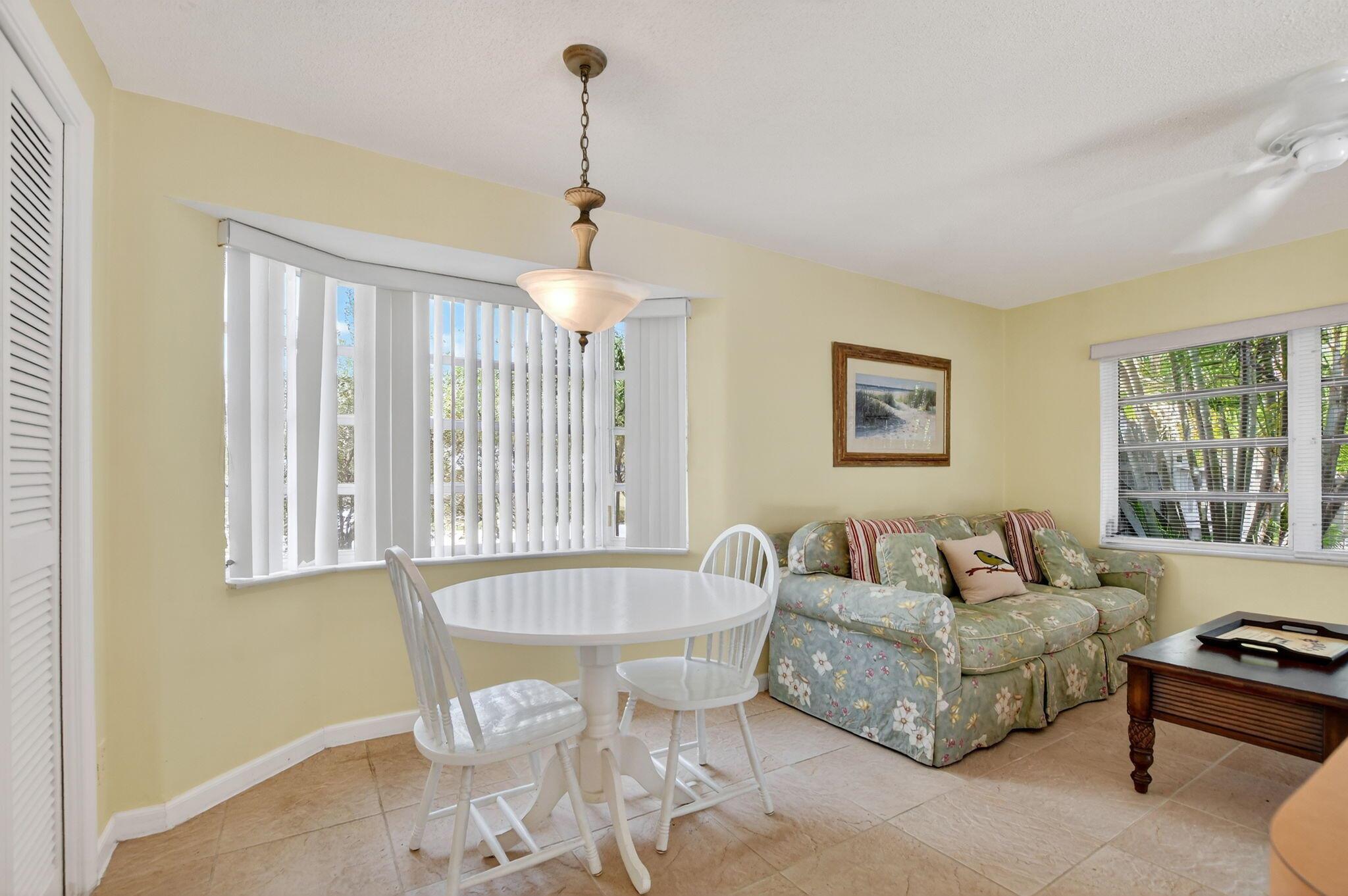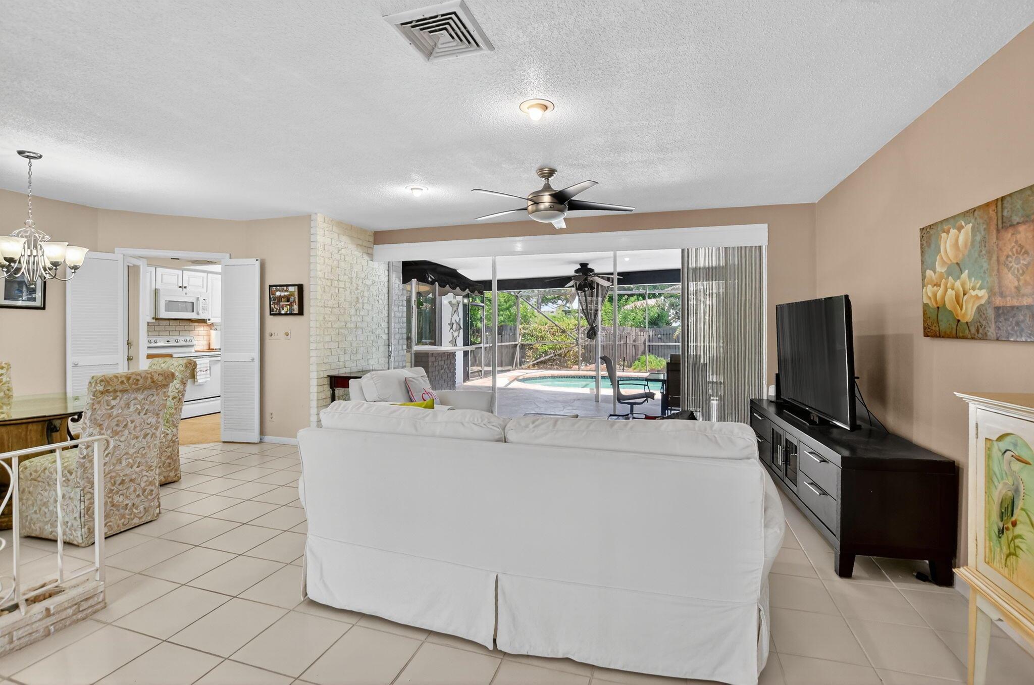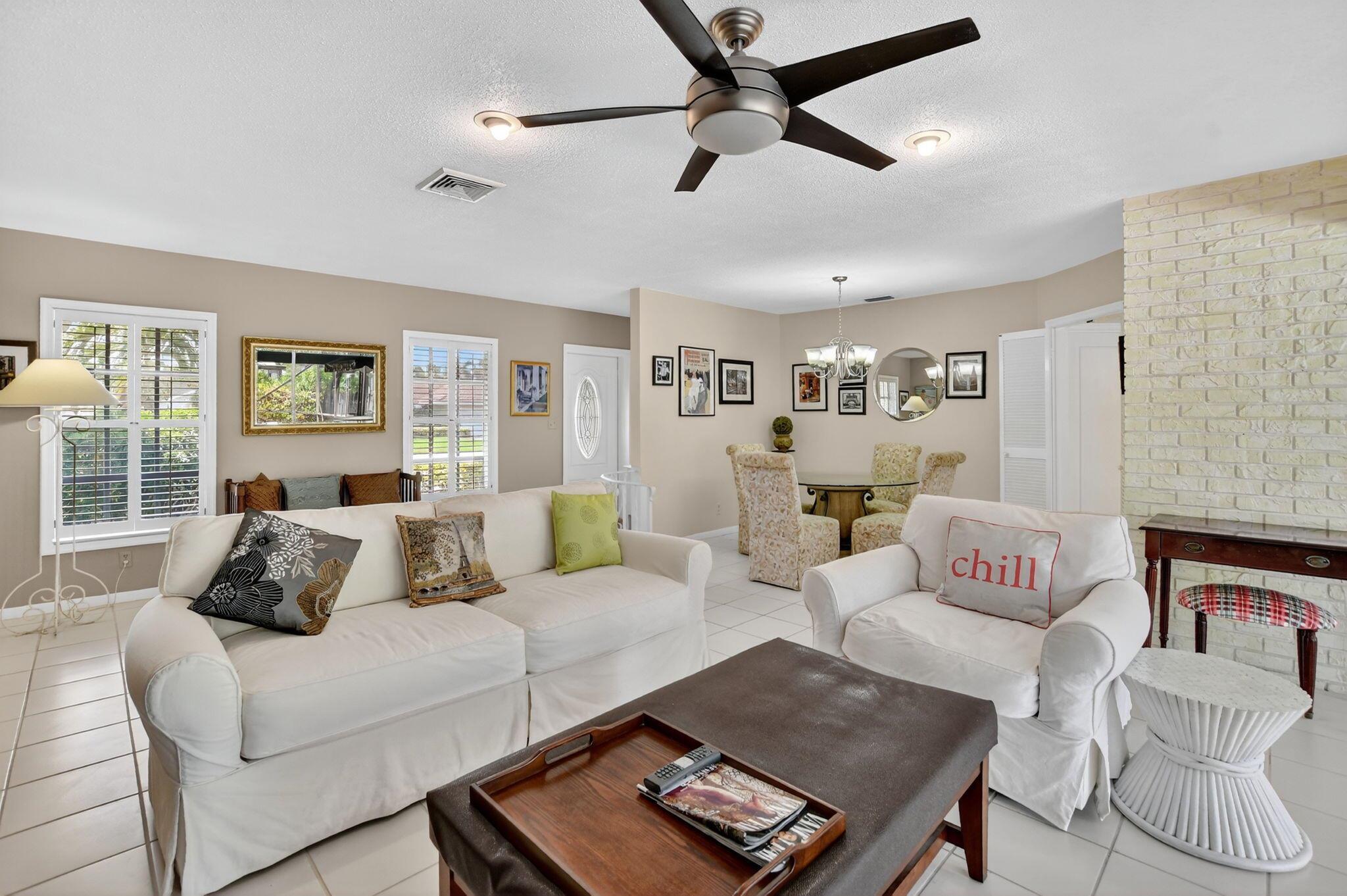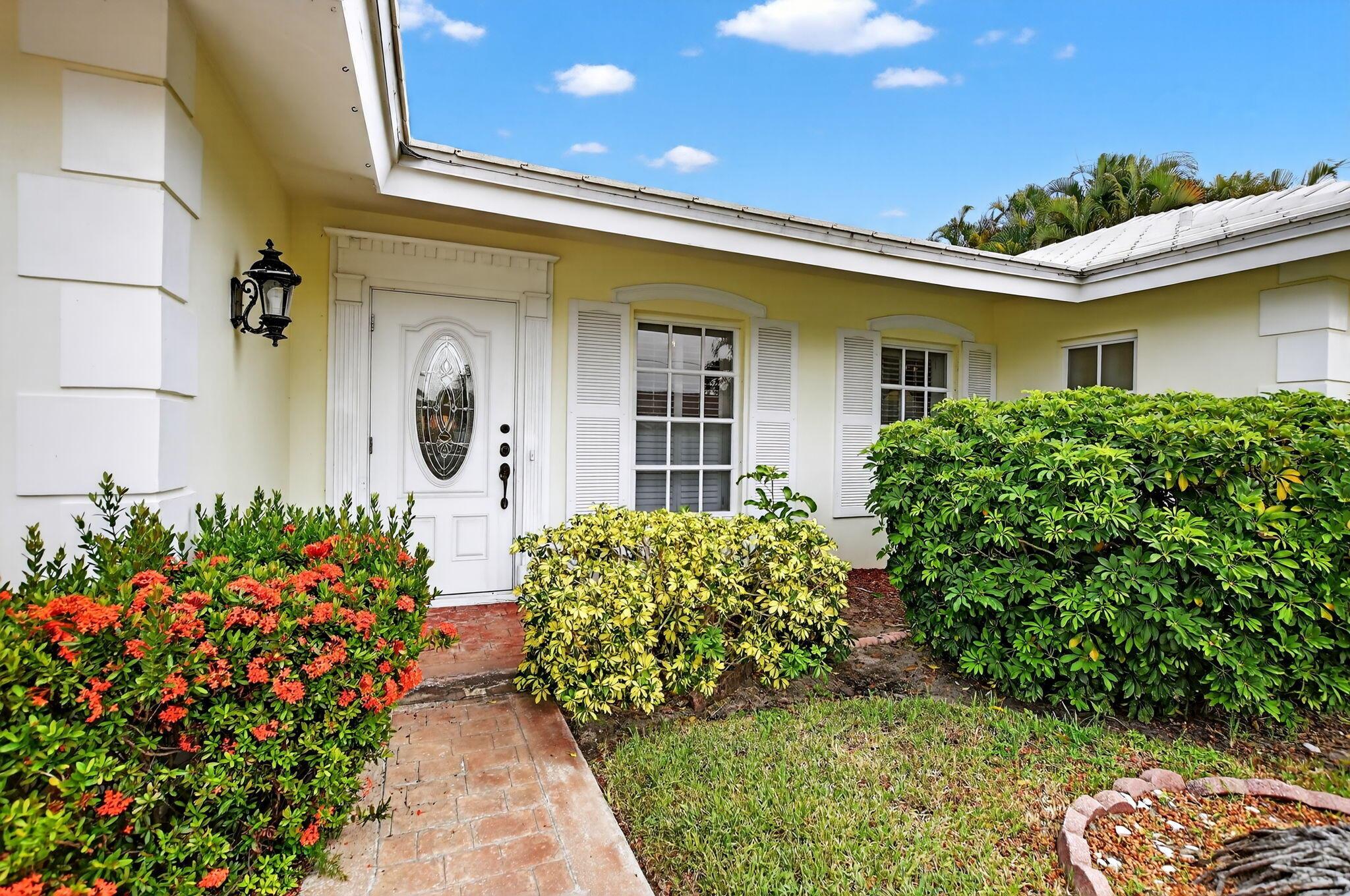 Step into PURE CHARM with this beautifully maintained two-bedroom corner-lot pool home, surrounded by lush tropical landscaping that sets the tone for a serene retreat. Nestled in one of the area's most desired neighborhoods, beautiful Paradise Palms. From the moment you arrive, the curb appeal shines-mature palm trees and vibrant greenery create a warm, welcoming entrance. Inside, the home feels light, bright and airy, with soft neutral tones, pastels and white brick, which compliments the natural sunlight pouring in through the elegant plantation shutters and sliding glass doors.