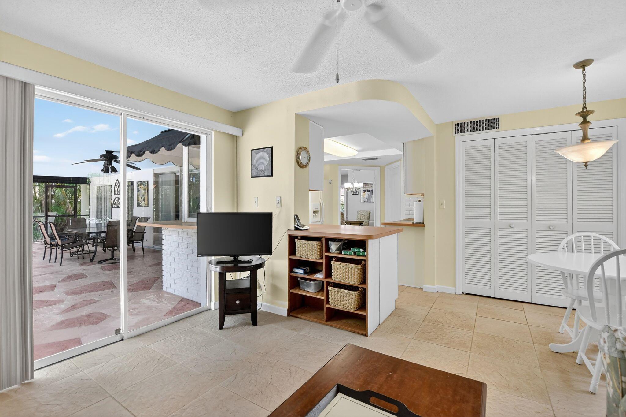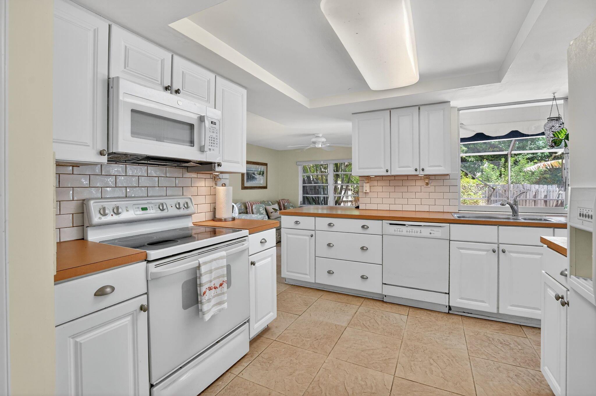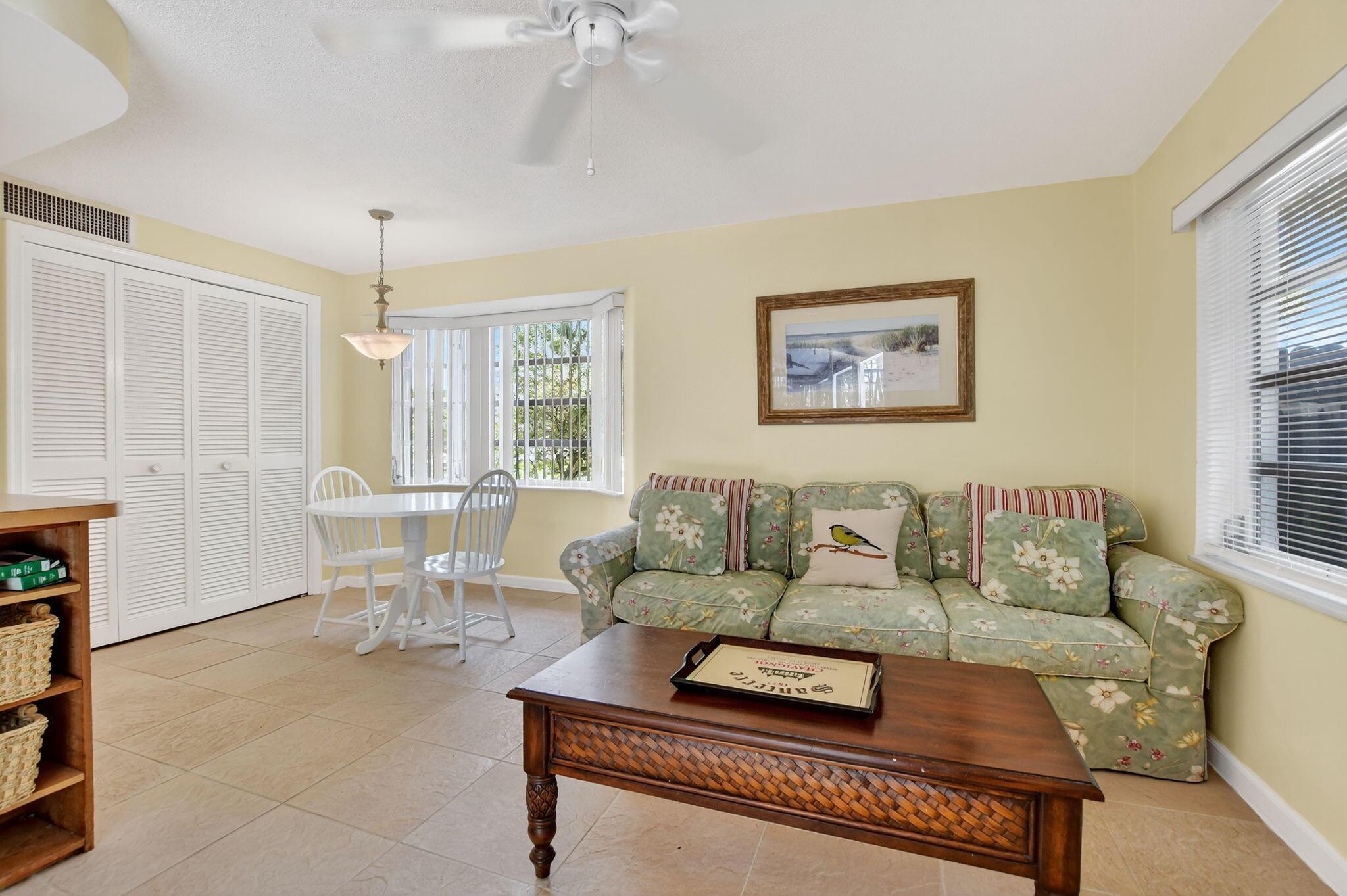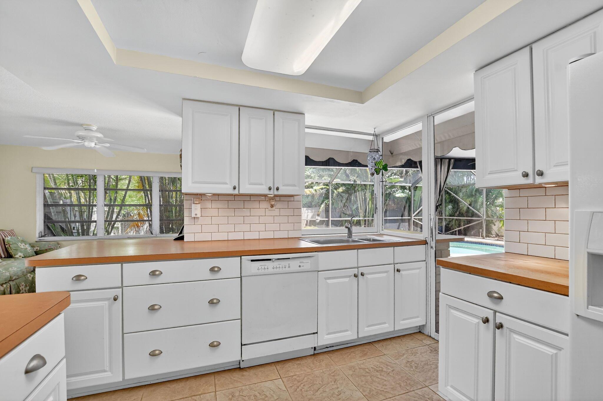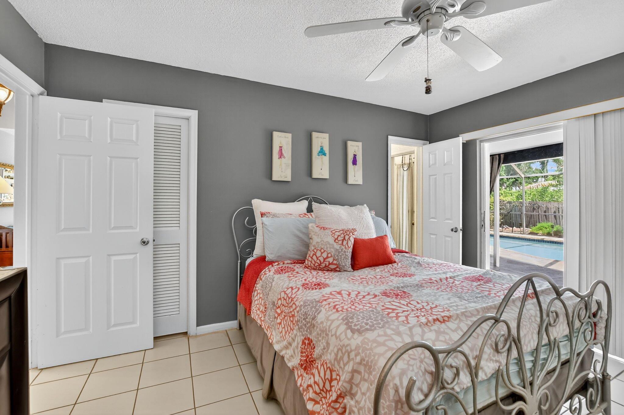Step into PURE CHARM with this beautifully maintained two-bedroom corner-lot pool home, surrounded by lush tropical landscaping that sets the tone for a serene retreat. Nestled in one of the area's most desired neighborhoods, beautiful Paradise Palms. From the moment you arrive, the curb appeal shines-mature palm trees and vibrant greenery create a warm, welcoming entrance. Inside, the home feels light, bright and airy, with soft neutral tones, pastels and white brick, which compliments the natural sunlight pouring in through the elegant plantation shutters and sliding glass doors.