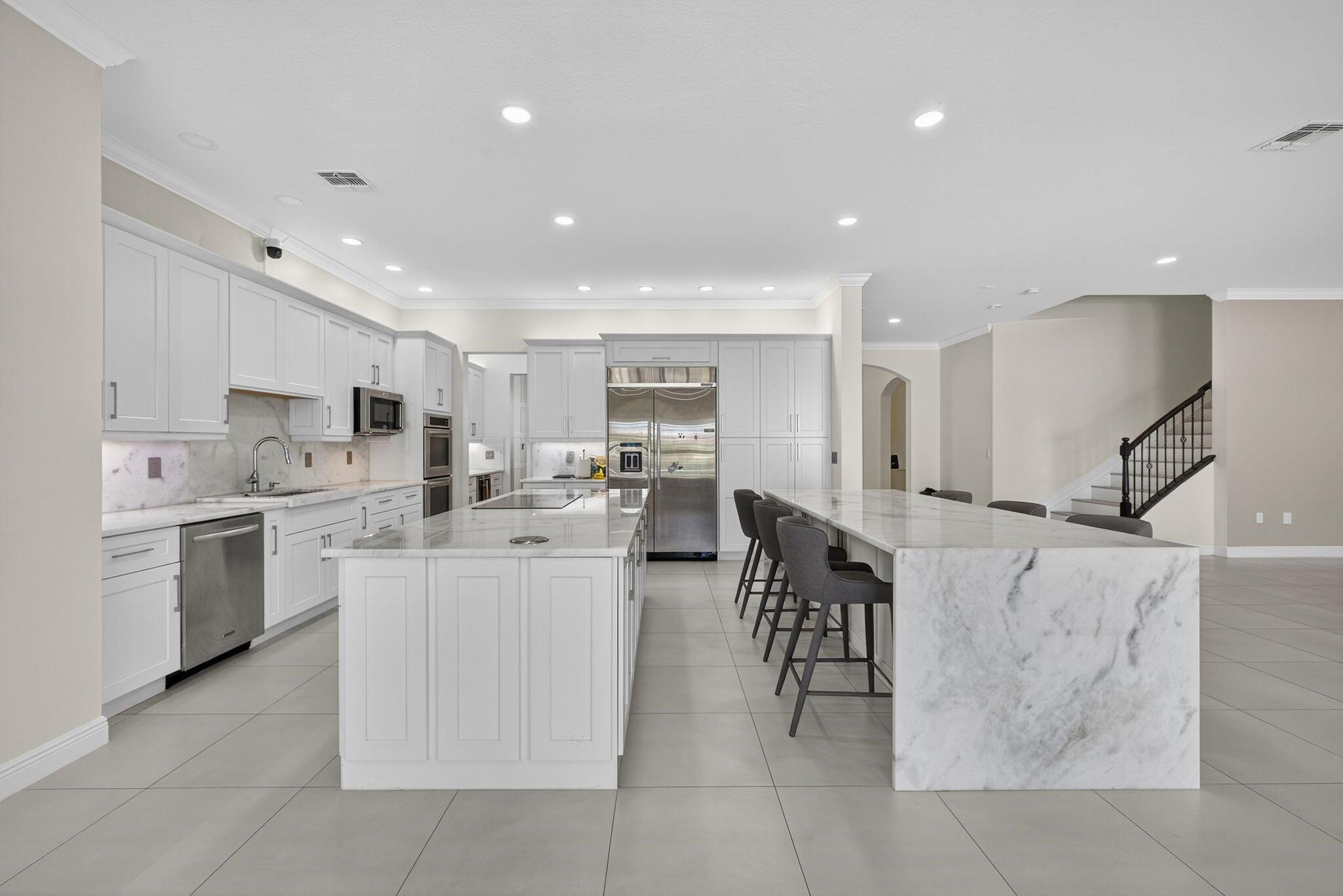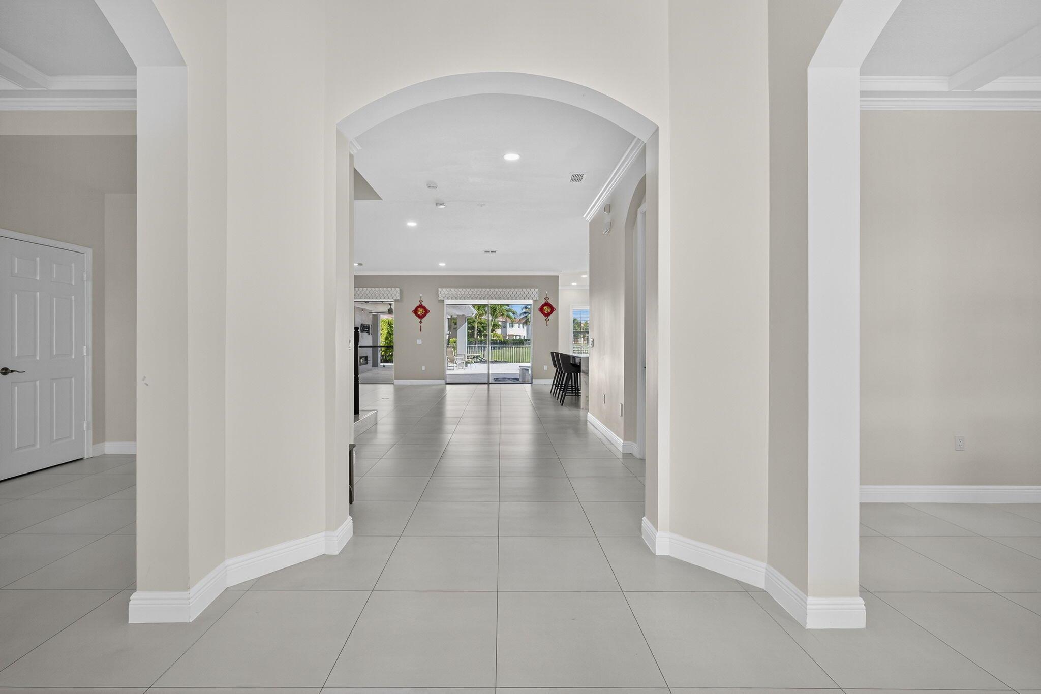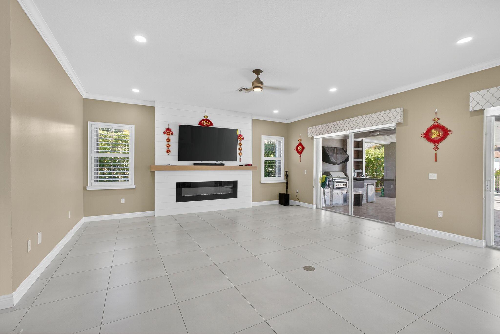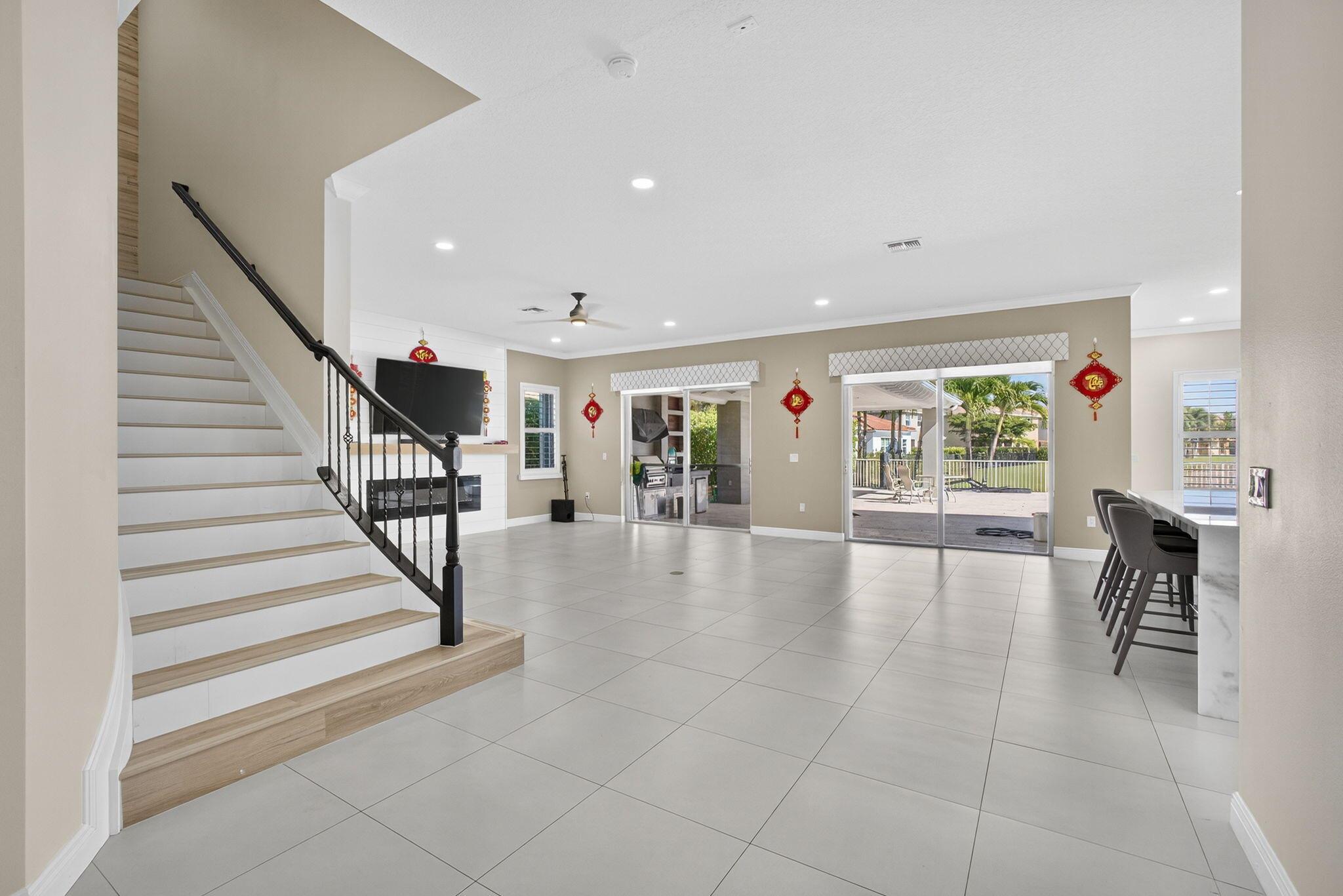 Stunning and spacious 5-bedroom, 5.5-bath estate pool home with bonus room & office and 2-car garage, located on a premium 0.28-acre lakefront lot in the highly sought-after resort community of Olympia. Step inside to a beautifully renovated interior where soaring ceilings, sunlit spaces, and custom details create a warm yet refined ambiance. The gourmet chef's kitchen boasts dual islands, custom cabinetry, double ovens, a built-in pantry, and top-of-the-line appliances. The outdoor living space is a true sanctuary. Overlooking serene lake views, the expansive loggia is complete with a summer kitchen and fireplace, setting the stage for effortless indoor-outdoor living. The heated saltwater pool with sun shelf and infinity-edge spa offers a resort-style escape in your own backyard.
