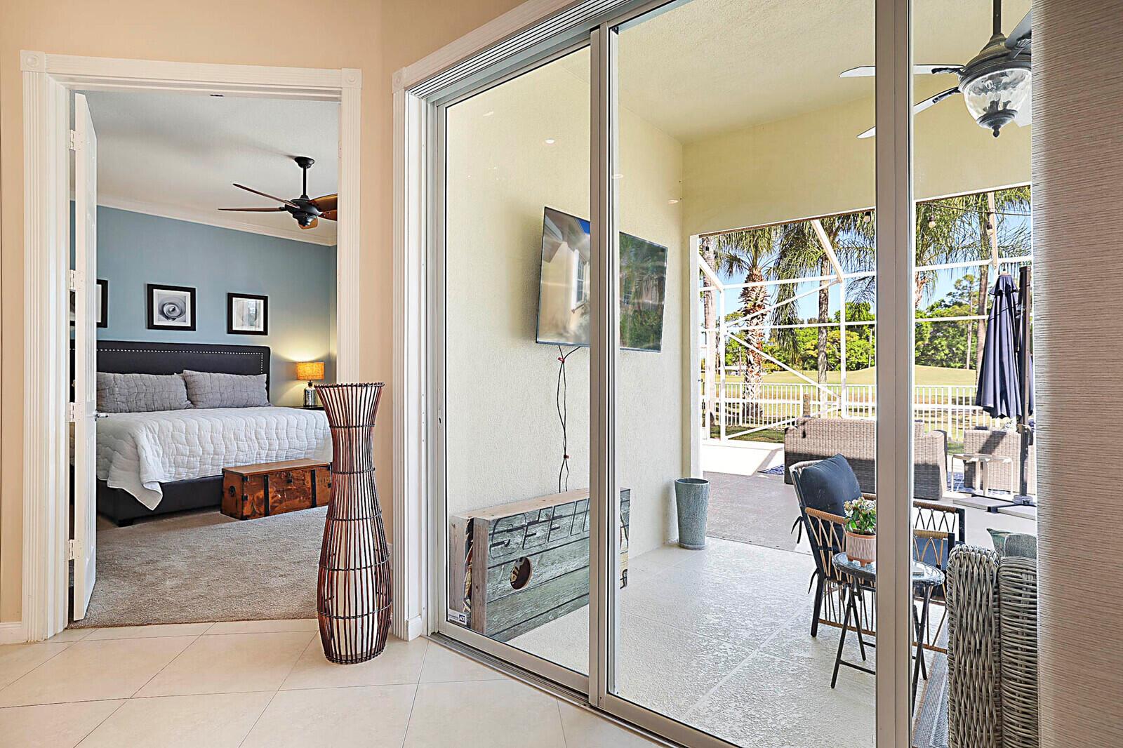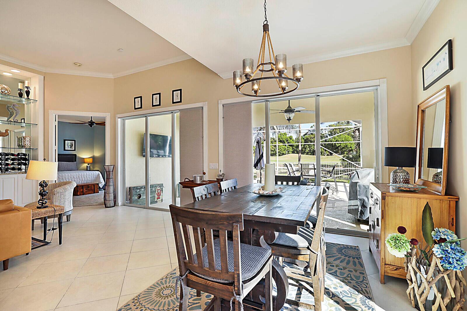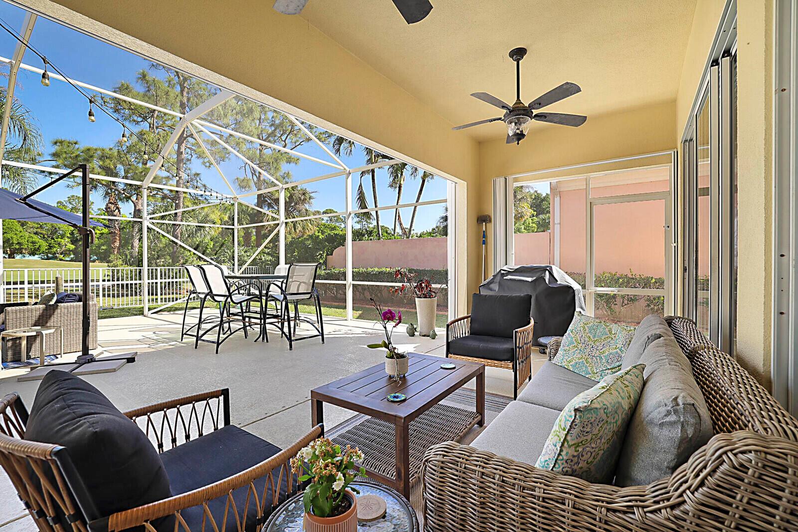 Welcome to the gated golf course community of The Florida Club, Stuart. Enter this lovely DiVosta quality-built home through a welcoming foyer into an open-concept layout that maximizes space and natural light. You'll appreciate the grandeur with 3 full bedrooms, 2.5 bathrooms, and an office. High ceilings, enhanced with crown molding and large windows, create an airy and inviting atmosphere throughout the house. The kitchen has stainless steel appliances and features granite countertops. A new metal roof and easy-close shutters offer 100% storm protection. This property features a 1,000-square-foot screened-in lanai, providing the perfect spot for relaxing & entertaining anytime of the day while enjoying your picturesque golf course view.