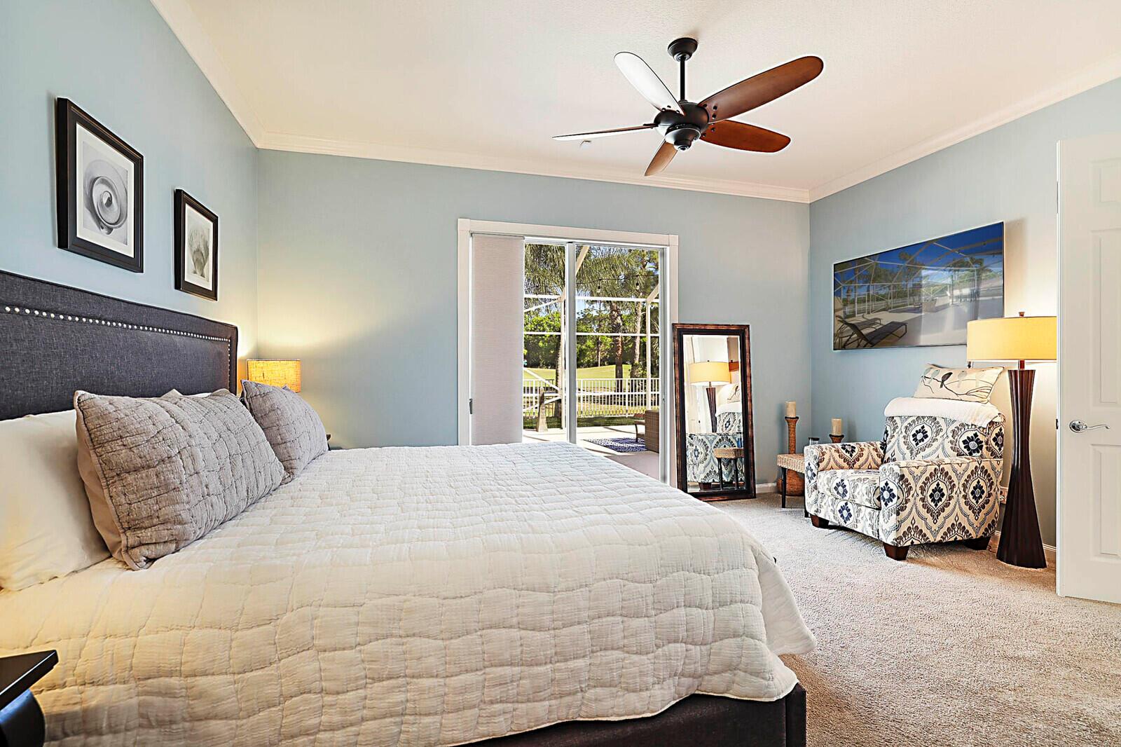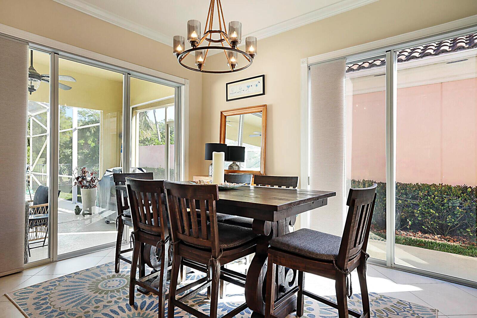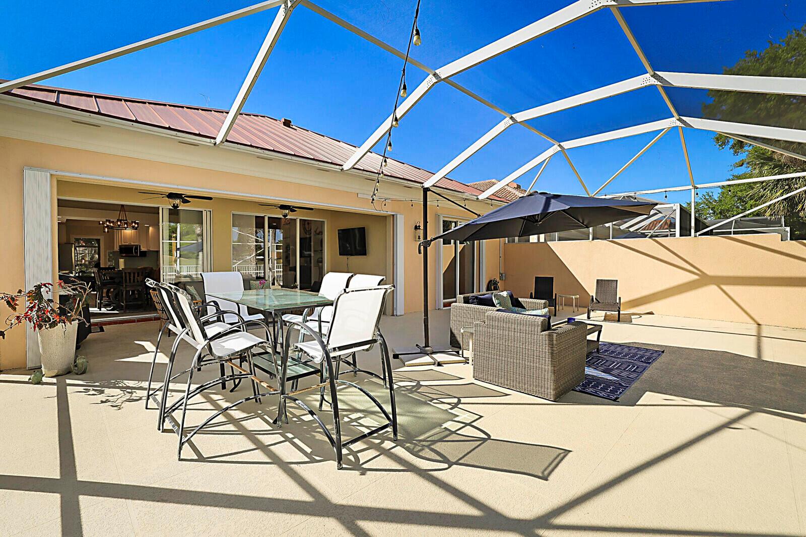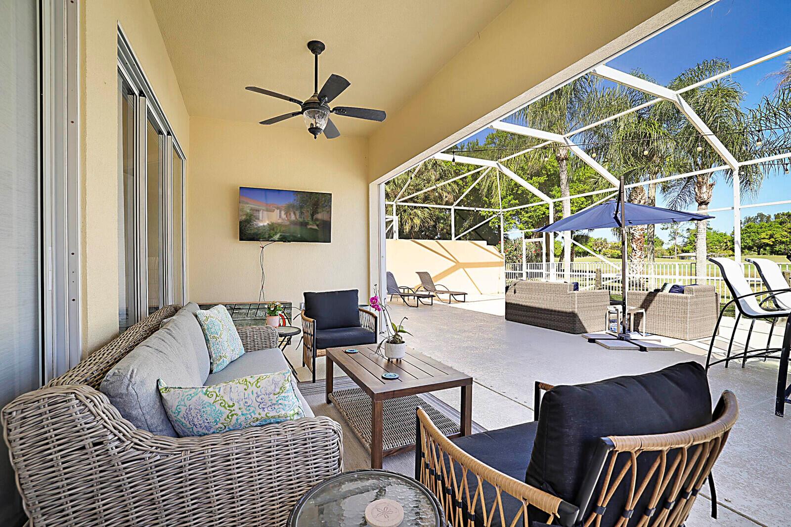 Welcome to the gated golf course community of The Florida Club, Stuart. Enter this lovely DiVosta quality-built home through a welcoming foyer into an open-concept layout that maximizes space and natural light. You'll appreciate the grandeur with 3 full bedrooms, 2.5 bathrooms, and an office. High ceilings, enhanced with crown molding and large windows, create an airy and inviting atmosphere throughout the house. The kitchen has stainless steel appliances and features granite countertops. A new metal roof and easy-close shutters offer 100% storm protection. This property features a 1,000-square-foot screened-in lanai, providing the perfect spot for relaxing & entertaining anytime of the day while enjoying your picturesque golf course view.