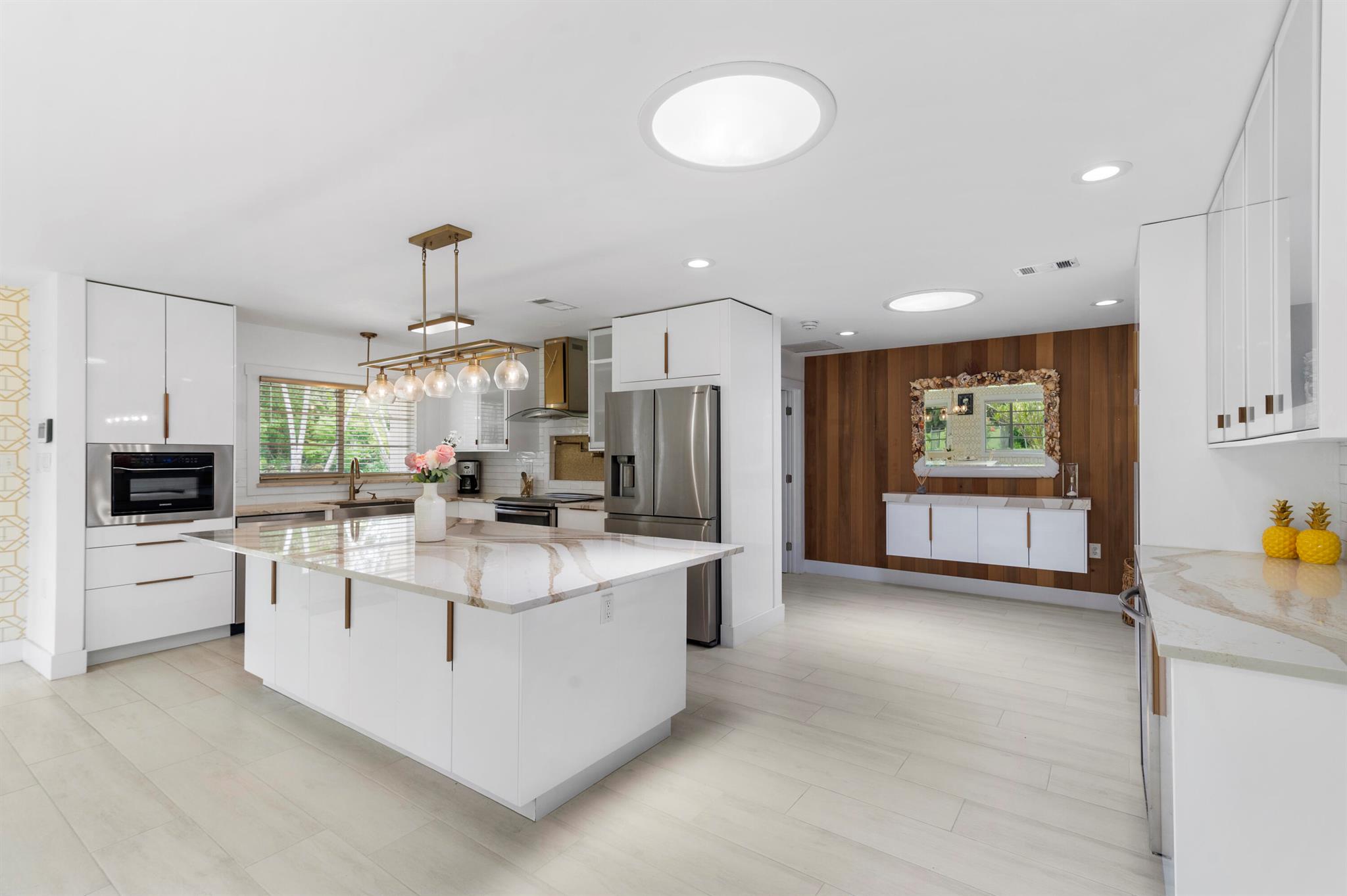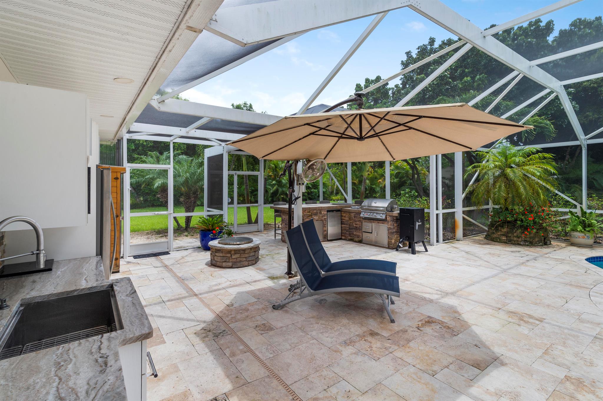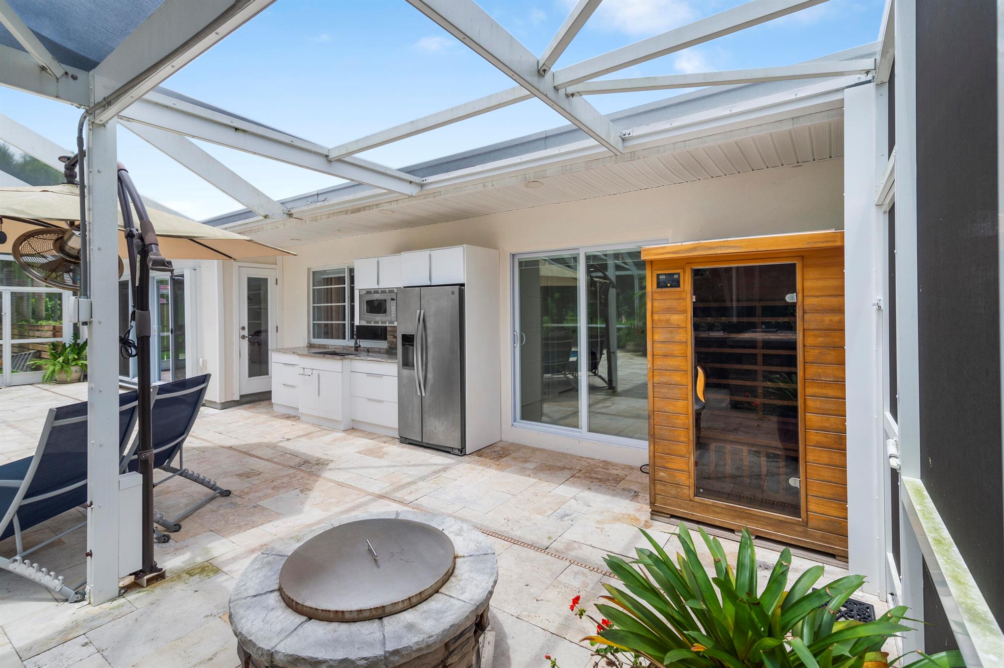 Open, spacious floor plan! Modern cabinets throughout, high end ceiling fans and light fixtures, one skylight and four sun tunnels, two custom fireplaces, three TV's, lots of closet/storage space, fully owned ADT alarm system with cameras, modern European white kitchen with quartz counter tops, stainless steel appliances, tankless water heater, set up for central vacuum, all sliding glass doors have built in blinds, screened in salt pool offer a resort like getaway with travertine patio, full summer kitchen, tropical plants, smoker, bar with patio furniture, storage sheds. Two full size refrigerators/freezer, two wine coolers, over 2.3 acres of 112 fruit trees and sprinkler system. New impact windows and accordion shutters. Enjoy a no HOA neighborhood.