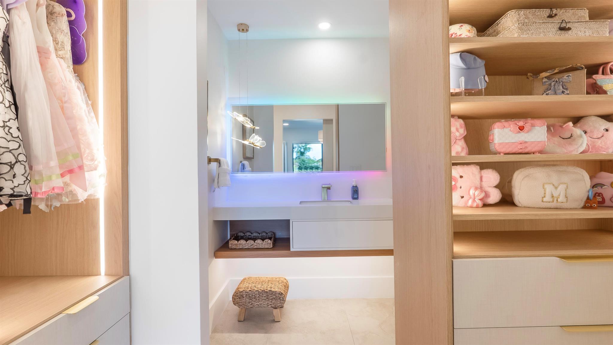 From the moment you arrive, this fully renovated home captivates with a floating water walkway and front glass pivot door. Inside, soaring 19-foot ceilings, open-concept living, and impeccable high-end finishes set the stage for sophisticated living. The residence features 4 en-suite bedrooms with custom closets, a spacious primary bedroom with wet-room and dream closet, a chef's kitchen with Wolf appliances, bespoke cabinetry, and quartzite island, a modern Taj Mahal stone fireplace, as well as a 300-bottle wine cellar and man cave garage that elevate lifestyle and entertainment. Step outside to your private resort oasis with a saltwater pool, sunken lounge, in-pool fire pit, swim jets,10-person spa, and cabana steam bath, all framed by lush tropical landscaping and golf course views.