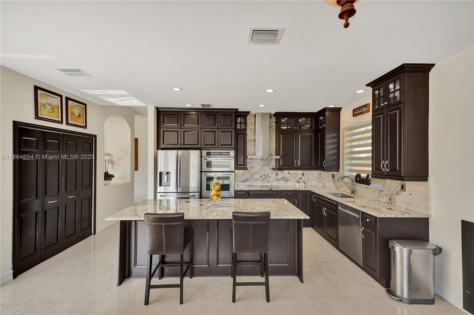 A stunning single-family home offering comfort, style, and privacy with no HOA fees and no CDD tax. This spacious residence boasts 2,994 total sq.ft. on an oversized 12,232 sq. ft. lot (¼ acre). Featuring 4 BR, 2.5 BA & 2-car garage, this home is designed for modern living. Step outside to your own tropical oasis with a resort-style swimming pool and spa, perfect for relaxation and entertaining. The outdoor area includes a built-in, integrated lanai porch, creating the ideal setting for year-round enjoyment. Inside, the home has been beautifully updated with a gourmet kitchen featuring custom cabinetry, granite countertops, stainless steel appliances, & a large island. The open floor plan with high ceilings allows natural light to flow throughout, offering a bright, welcoming atmosphere.