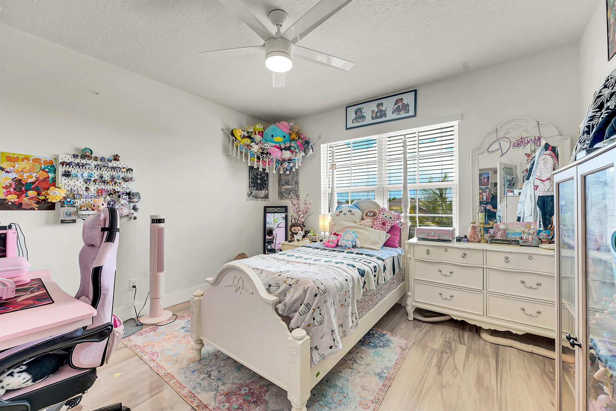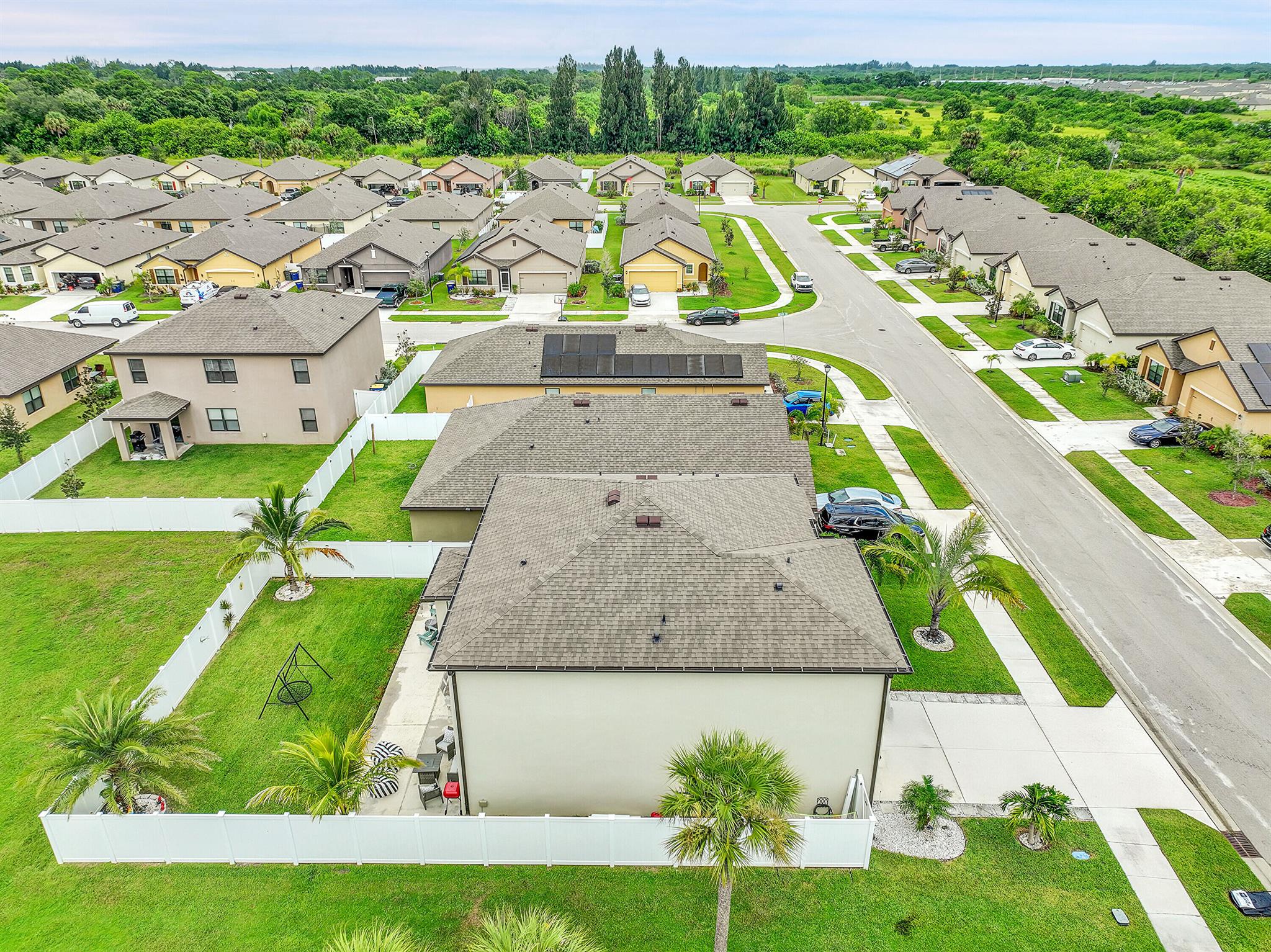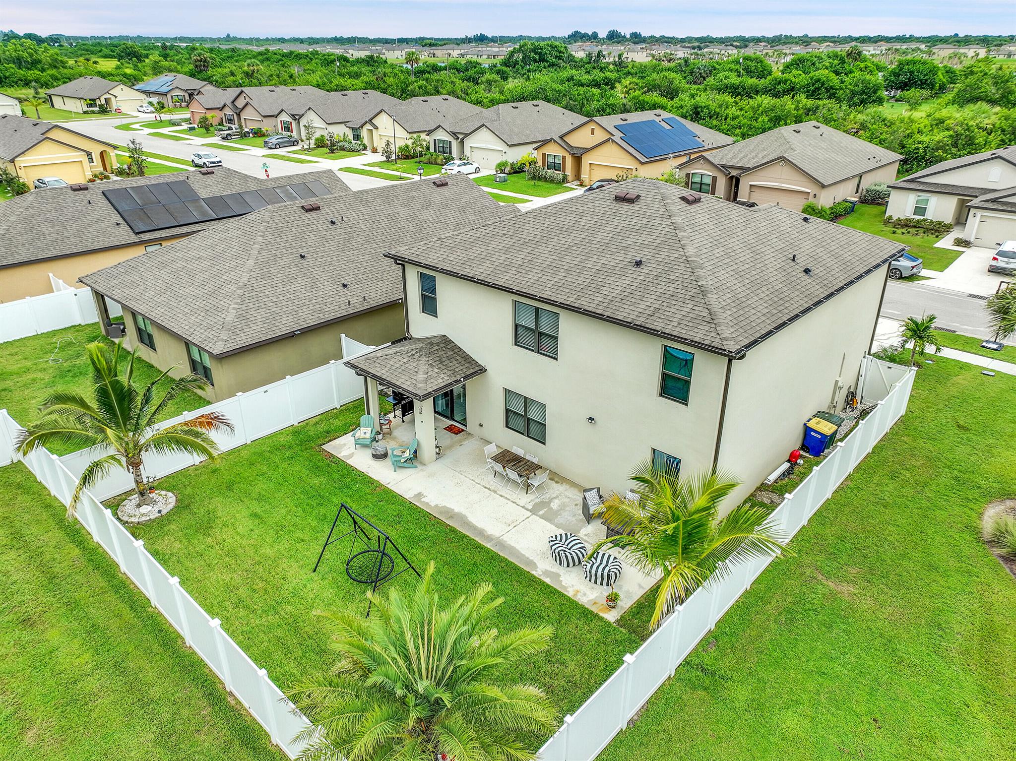 Immaculate two-story home with concrete block construction on both floors! This plan offers a flex room that could be an office. Central living room and open concept kitchen with Quartz countertops, extended island and complete the main level. Duravana waterproof flooring and tiles throughout the house. Upstairs has a generous owner's suite with full bath, loft area that could be an office or entertainment room and the laundry room simplifies an everyday chore! Epoxy coating flooring in the garage and porch of the house. The patio was extended and fenced with fruit trees like Coco Dwarf (refers to a specific type of coconut tree that is smaller in size, it typically reaches heights of 25-60 feet and Sylvestre. St. Augustin grass, that is vividly green, ideal for lawns in hotter climate