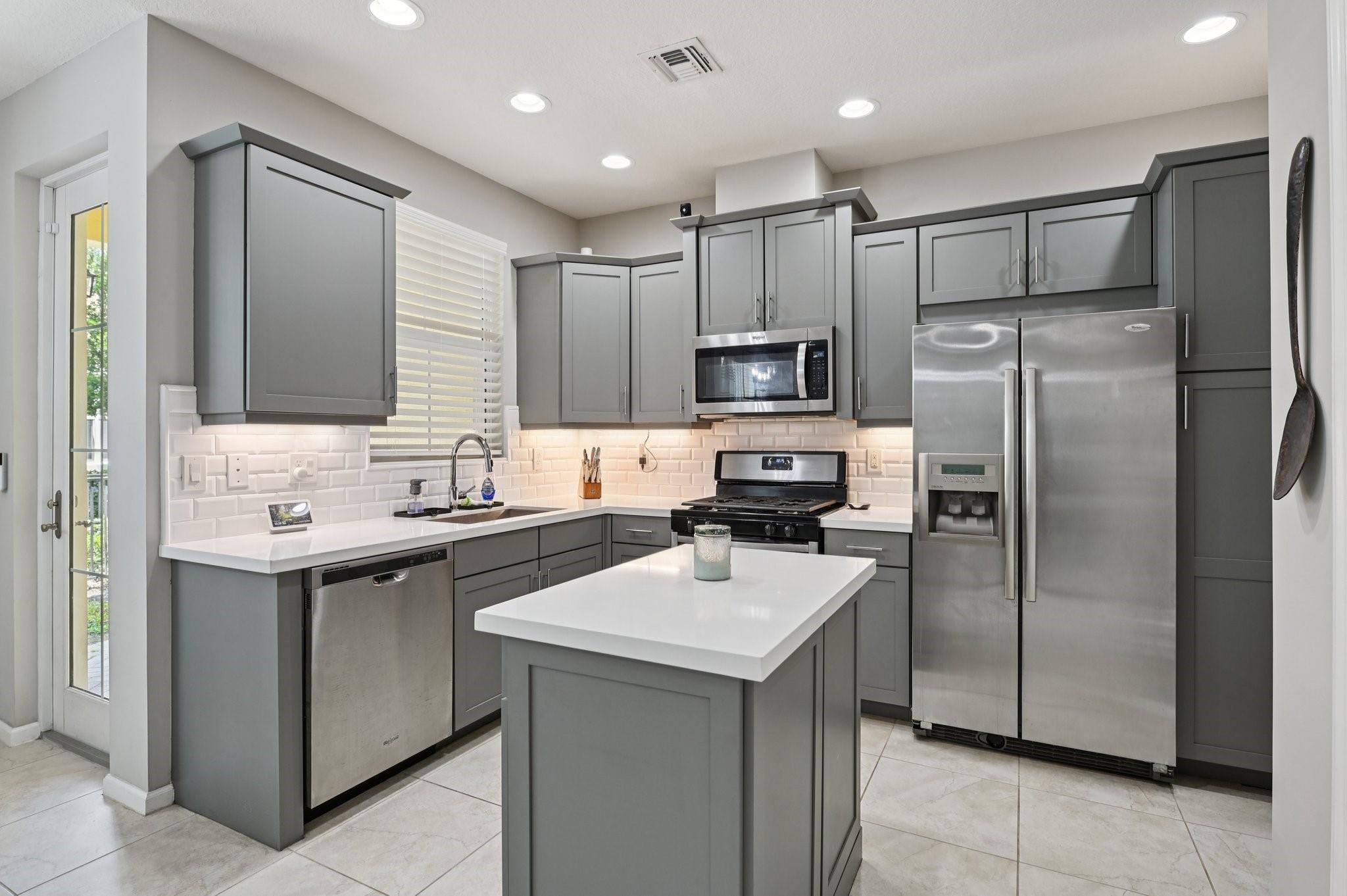 Beautifully updated 3BR/2.5BA townhome with split 2-car garage in the resort-style community of Artesia. The main level features tile flooring, a stylish dry bar, and a fully renovated kitchen with quartz countertops, subway tile backsplash, grey shaker cabinets, gas range, and stainless steel appliances, opening to a spacious dining and living area plus half bath. Upstairs, the primary suite offers vaulted tray ceilings, a walk-in closet and a spa-like bath with dual sinks, a soaking tub and a separate shower. Two additional bedrooms, a full bath, and laundry complete the second floor. Highlights include a 2-year-old A/C, impact windows/doors, a private fenced patio, and ample guest parking. Community amenities: 2 pools, fitness center, indoor basketball, tennis, pickleball and playground