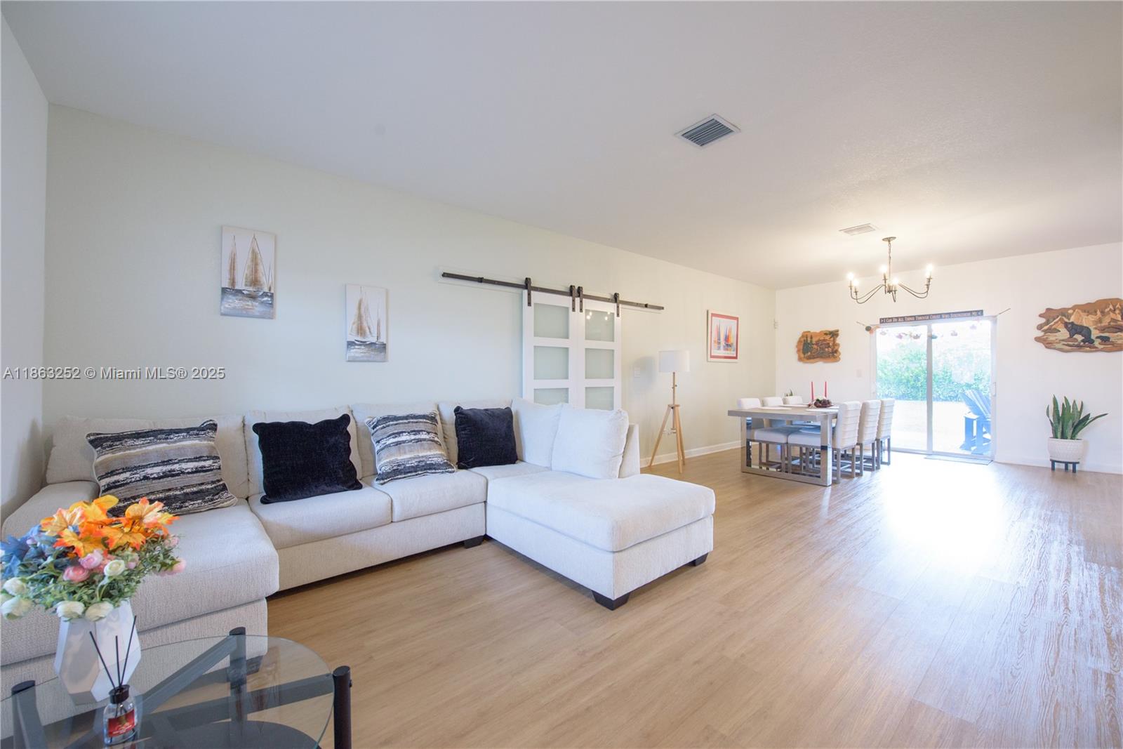 Elegant 5BR/4.5BA Estate featuring sleek tile & laminate floors, impact windows, designer shades, and custom barn doors. Gourmet kitchen boasts white cabinetry, stainless steel appliances, Corian countertops, island with sink & pantry. Formal dining with chandelier, spacious family room, and covered patio with pavers—perfect for entertaining. In-law suite with private entry, kitchen, split A/C, and 2 full baths. Lavish master with tray ceiling, spa-style bath, dual sinks, glass-enclosed shower, and walk-in closet. 2-car garage, laundry room, fenced yard, LED lighting & more. NO HOA!! PROOF OF FUNDS AND/OR PRE-APPROVAL LETTER REQUIRED PRIOR TO SCHEDULING A SHOWING OF THE PROPERTY!