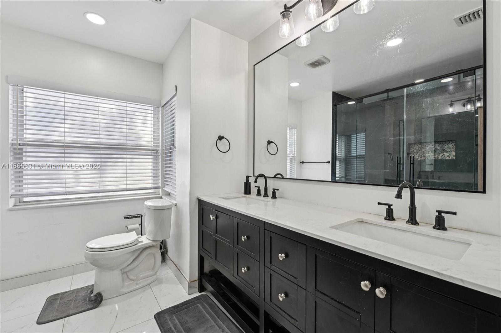 Beautifully remodeled 3BR/2BA home with an open floorplan, vaulted ceilings, LED lighting, pale gray laminate flooring, remote blinds, and impact windows/doors. The custom white kitchen features shaker cabinets, marble quartz counters, and stainless steel appliances. Luxurious master suite includes dual walk-in closets, custom double vanity, porcelain tile, and a spacious walk-in double shower. Guest bath offers a custom vanity with tub/shower combo. Enjoy Florida living in the screened enclosed patio with composite deck, perfect for entertaining. Backyard boasts a lush lawn with mature mango and avocado trees. Conveniently close to schools, shopping, dining, and major highways—comfort and convenience in one!