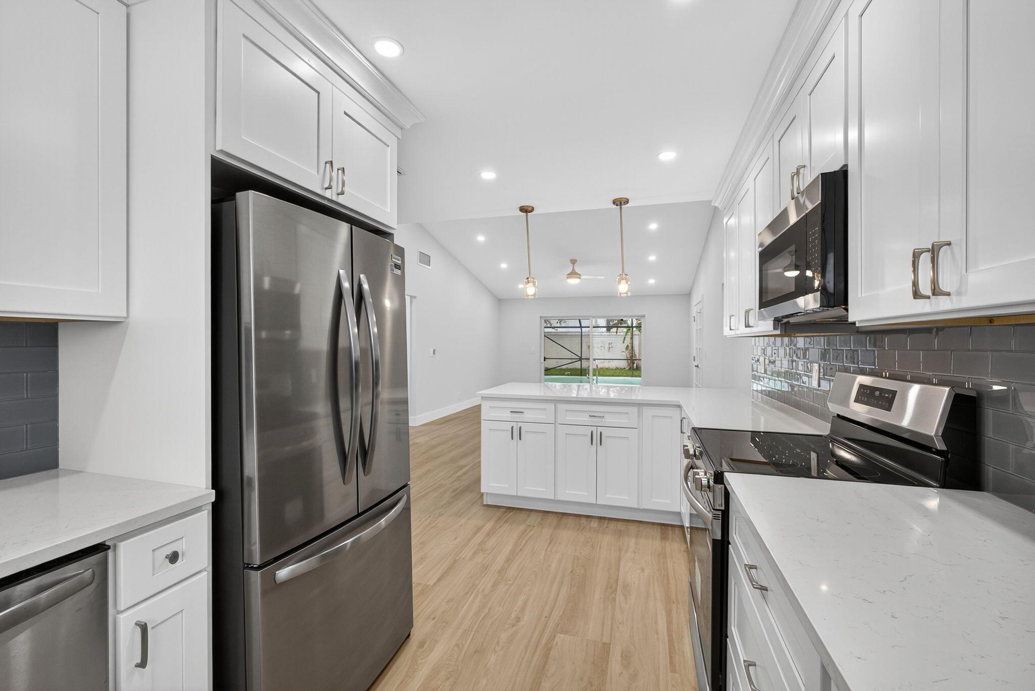 Completely remodeled, open concept, split floorplan, pool home welcomes you to established Wellington family neighborhood with No HOA! All new finishes & fixtures throughout! Lovely kitchen renovation with new ss appliances, quartz countertops, loads of white shaker cabinets for storage, sink disposal, & pendant lights over the eat-in peninsula. New LVP floors, interior doors & trim, interior & exterior paint, lighting & ceiling fans, refreshed closets and shelving. New roof, new irrigation system & pump w/water supplied by well, Impact windows & doors. All new bathrooms with beautiful wall tile, new vanities, toilets, showers. Primary bedroom features dual sink vanity and walk-in closet, while the two split br's share bath w/shower-tub combo. The barn-style door near entryway opens to a