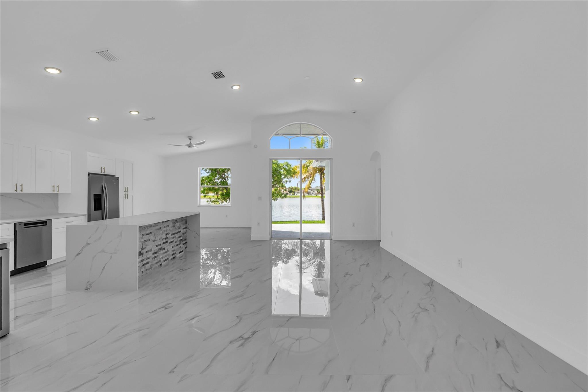 PRICE IMPROVEMENT! Check out this stunning one-story, 3 bedroom, 2 bath waterfront home, beautifully renovated w/modern finishes throughout. Step inside to find soaring volume ceilings & a spacious split-bedroom floor plan, designed for both comfort and privacy. Both bathrooms have designer finishes that are truly unique. The heart of the home is the open-concept kitchen, featuring brand-new appliances, sleek cabinetry & elegant waterfall granite countertops-perfect for entertaining & everyday living. Large windows fill the living spaces w/ natural light while offering serene water views. Enjoy the tranquility of waterfront living w/ the convenience of a large, new patio & wide lake view. With its modern touches,bright open layout & prime location,this home is truly move-in ready!