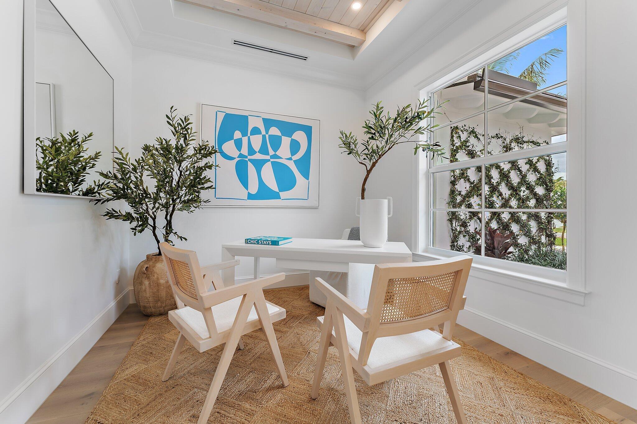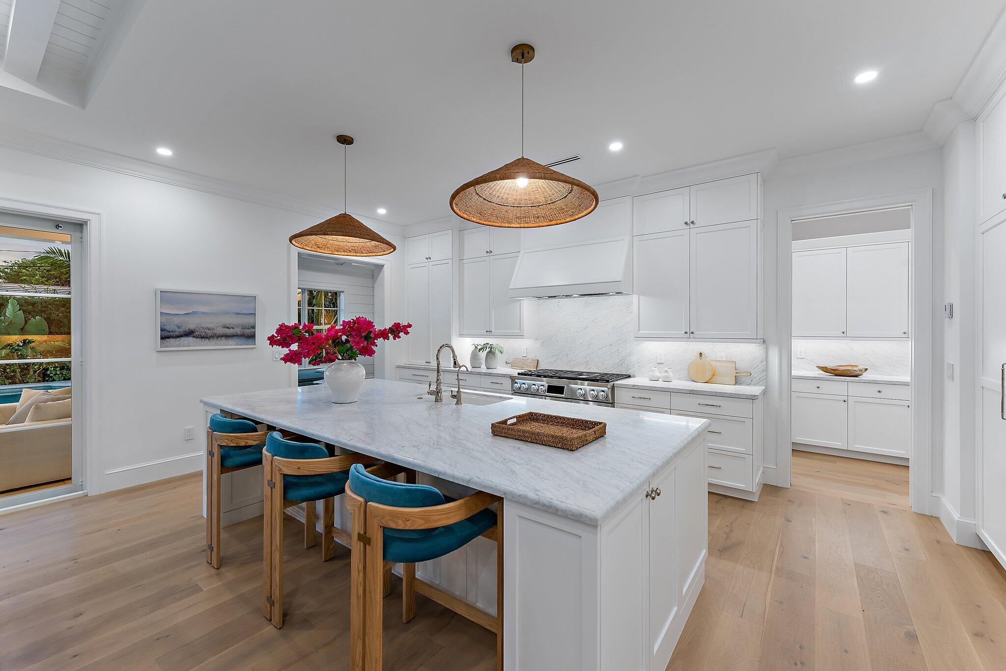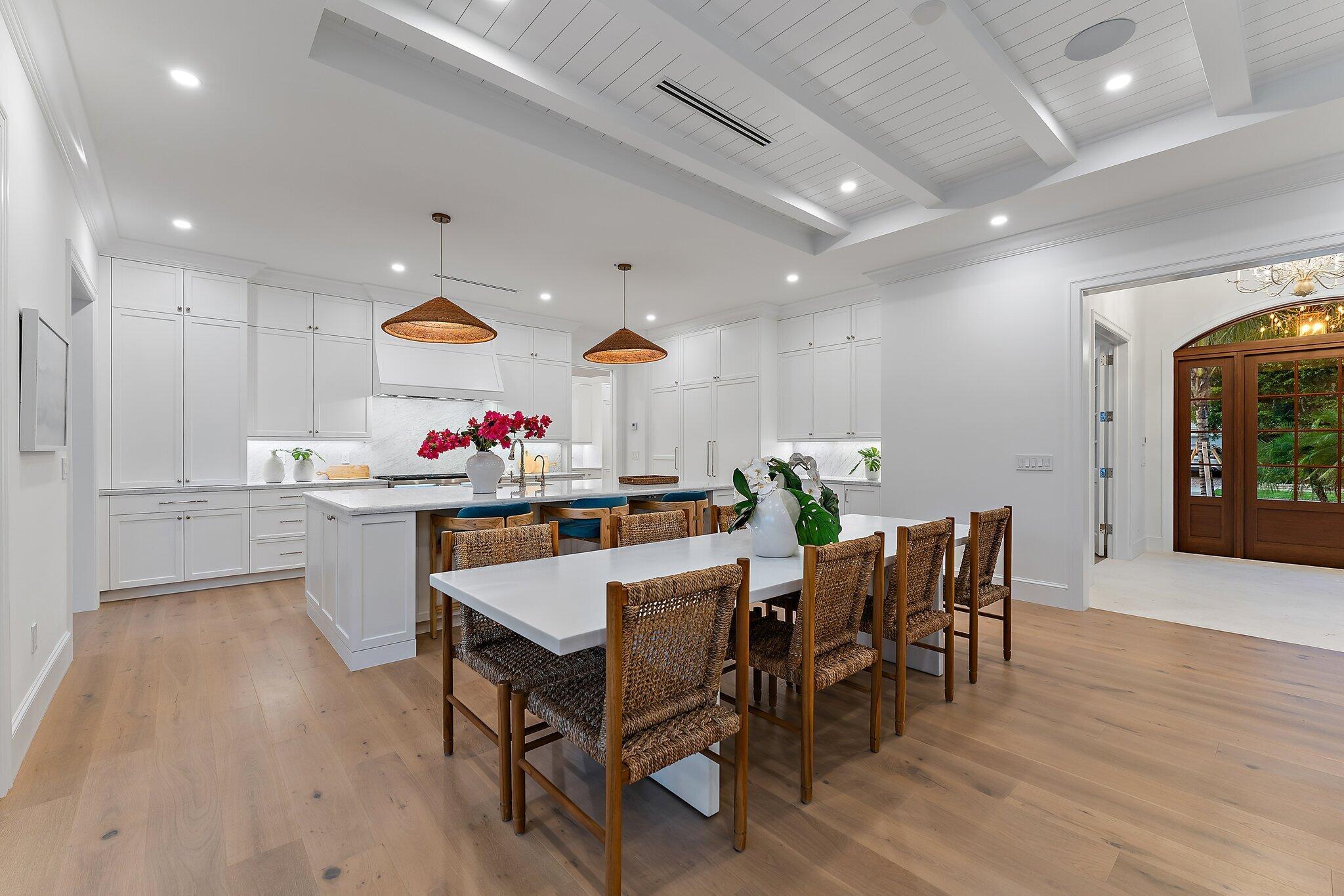 Easterly breezes await off of Lakeside Drive in this brand new construction estate, ''The Palm House'', curated by RJS Builders. Architecturally stunning and nestled amongst beautiful garden views with approximately 5,574 square feet of indoor/outdoor space, 4,046 square feet under air, for a total of 4 full bedrooms, plus den, loft, and 4.5 bathrooms. Beyond the coral stone foyer and private office, an expansive living room with fireplace and dining area seamlessly transition under voluminous ceilings, with wood beams above white oak floors, each with uniquely orchestrated garden and pool views. Stately Chef's kitchen, prep pantry with second refrigerator, dry bar with wine cooler and ice maker, and counter seating for gatherings, is anchored by white cabinetry and select