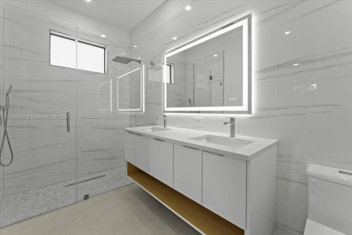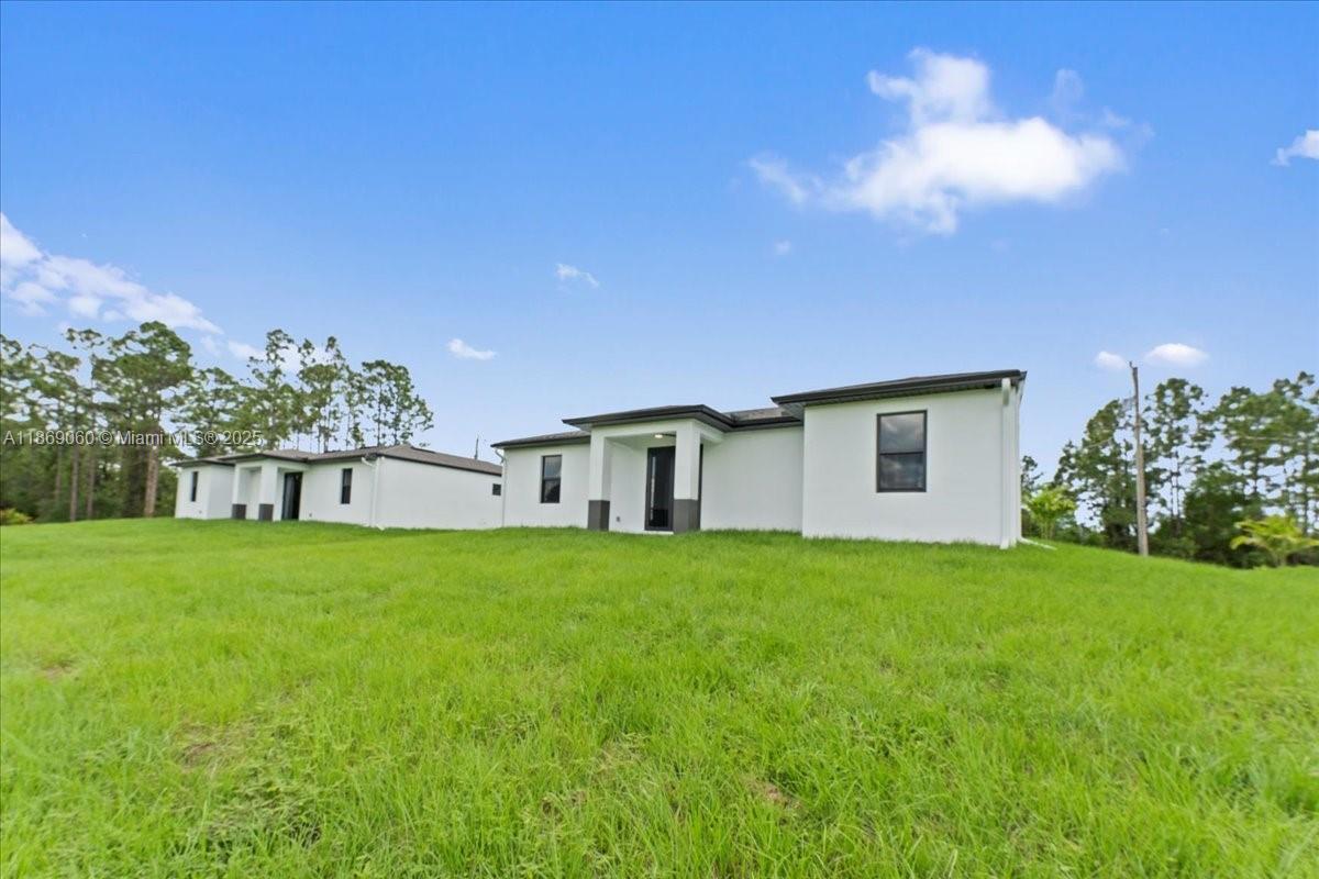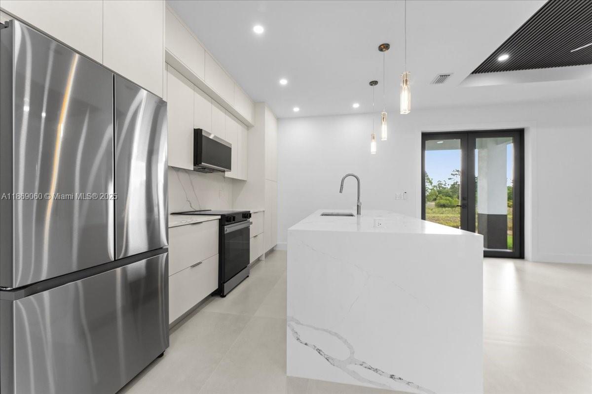 CO in hand and ready for a new owner. Modern style home. This home features hurricane impact windows and doors , automatic garage door, gutters all around front and back, custom modern kitchen cabinets , high grade level 5 calacatta quartz counter tops, full backsplash and waterfall in island. Top of the line stainless steel appliances. The floor plan is spacious with 10 foot ceilings and 11.5’ coffer ceilings and 8’ interior solid doors, cladding paneling on living room ceiling and master bedroom wall, frameless shower door, modem LED light mirror, one piece toilets. Built in custom closets, porcelain floors through out. Irrigation system. Upgraded landscaping. Epoxy floors in garage. Pavers in driveway. Tankless water heater and more. It comes with 1 year builder's warranty.