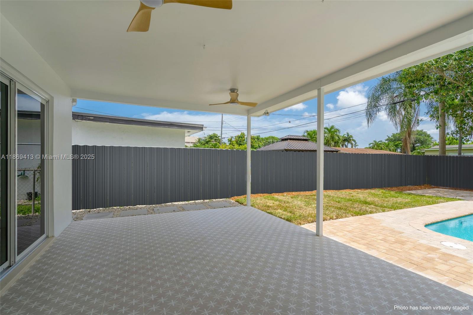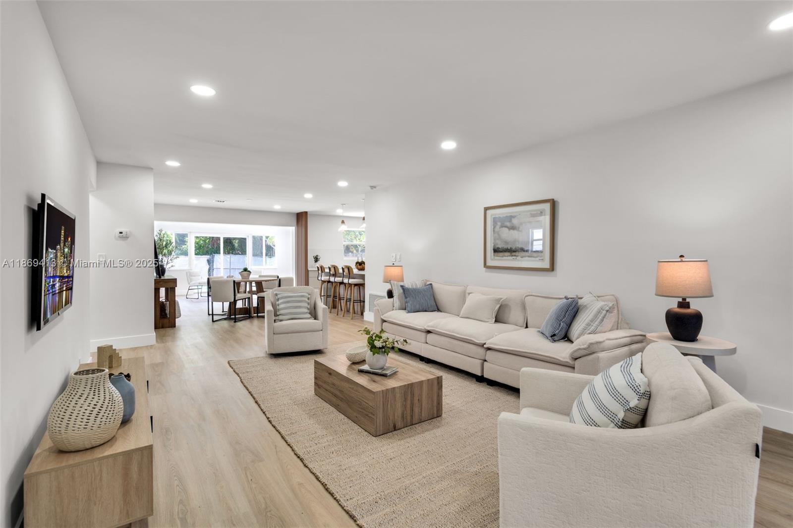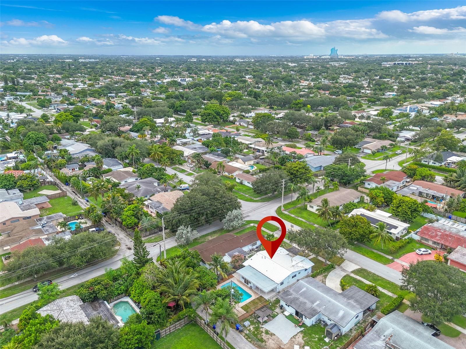 Seller highly motivated — offering closing cost contribution with full-price closing. Beautiful 3BD/2BA home in sought-after Hollywood Hills with 1,558 sq ft of stylish living on a 6,251 sq ft lot. This one-story residence offers an open layout with impact windows/doors, metal roof, and wide-plank flooring. Modern kitchen with quartz countertops, waterfall island, custom cabinetry, and new stainless steel appliances. Bathrooms feature designer finishes and contemporary fixtures. The primary suite includes a walk-in closet and private bath with dual vanities and glass shower. Garage with laundry, plus a backyard oasis with covered patio, new tile flooring, ceiling fans, and sparkling pool. Conveniently near schools, shopping, dining, highways, and minutes from beaches. No HOA.