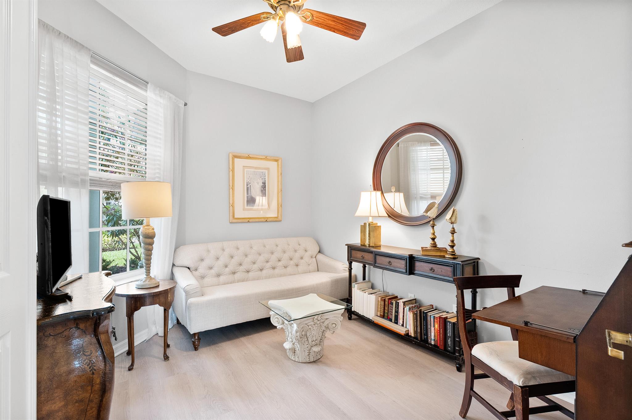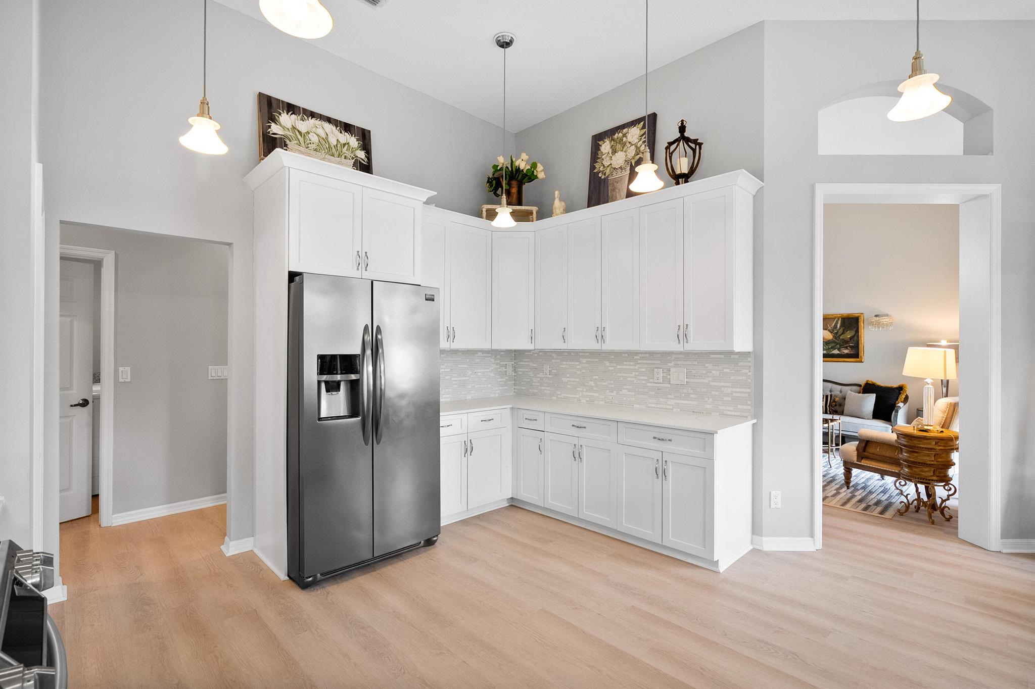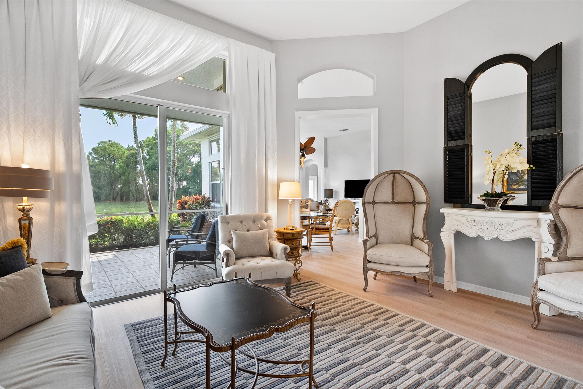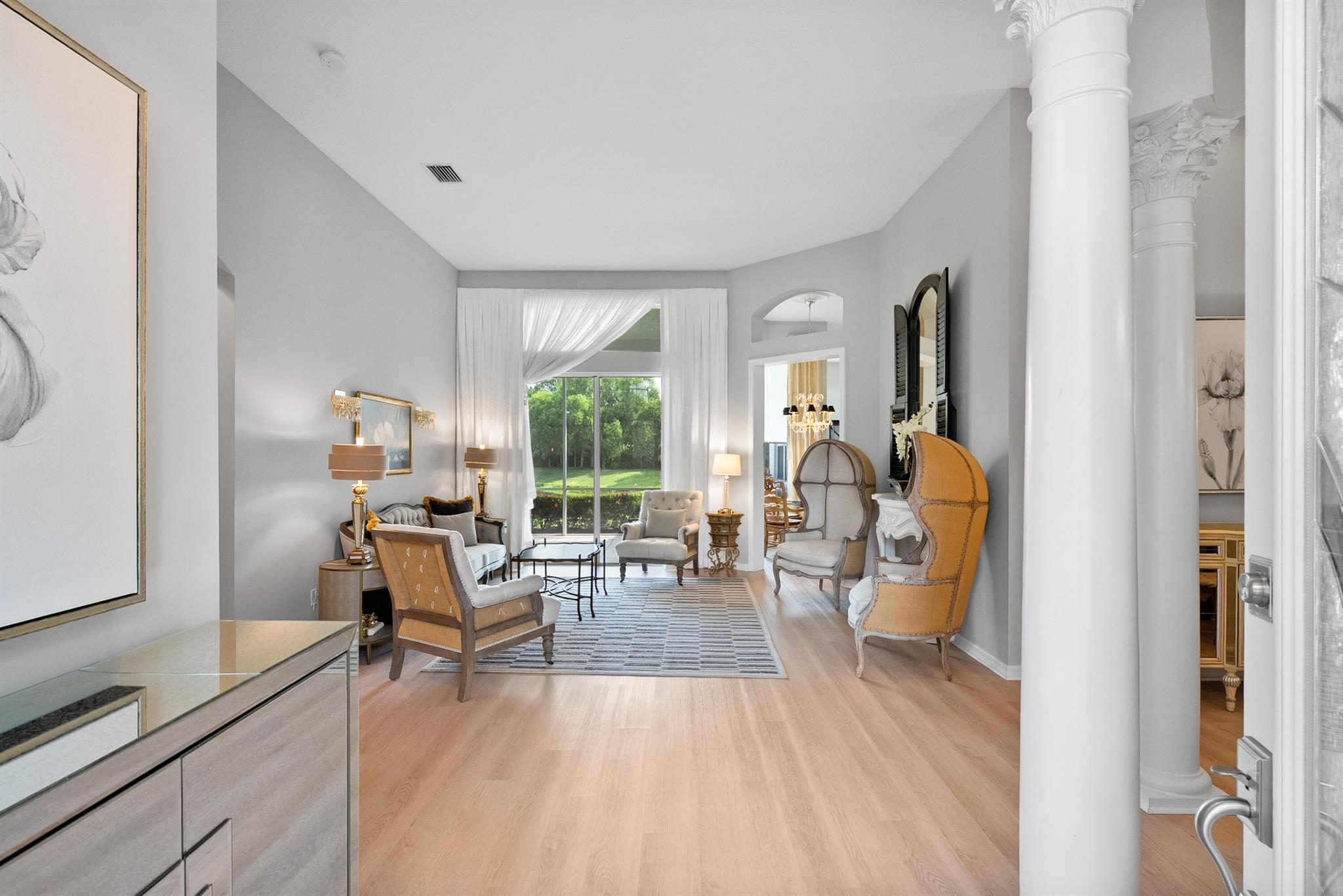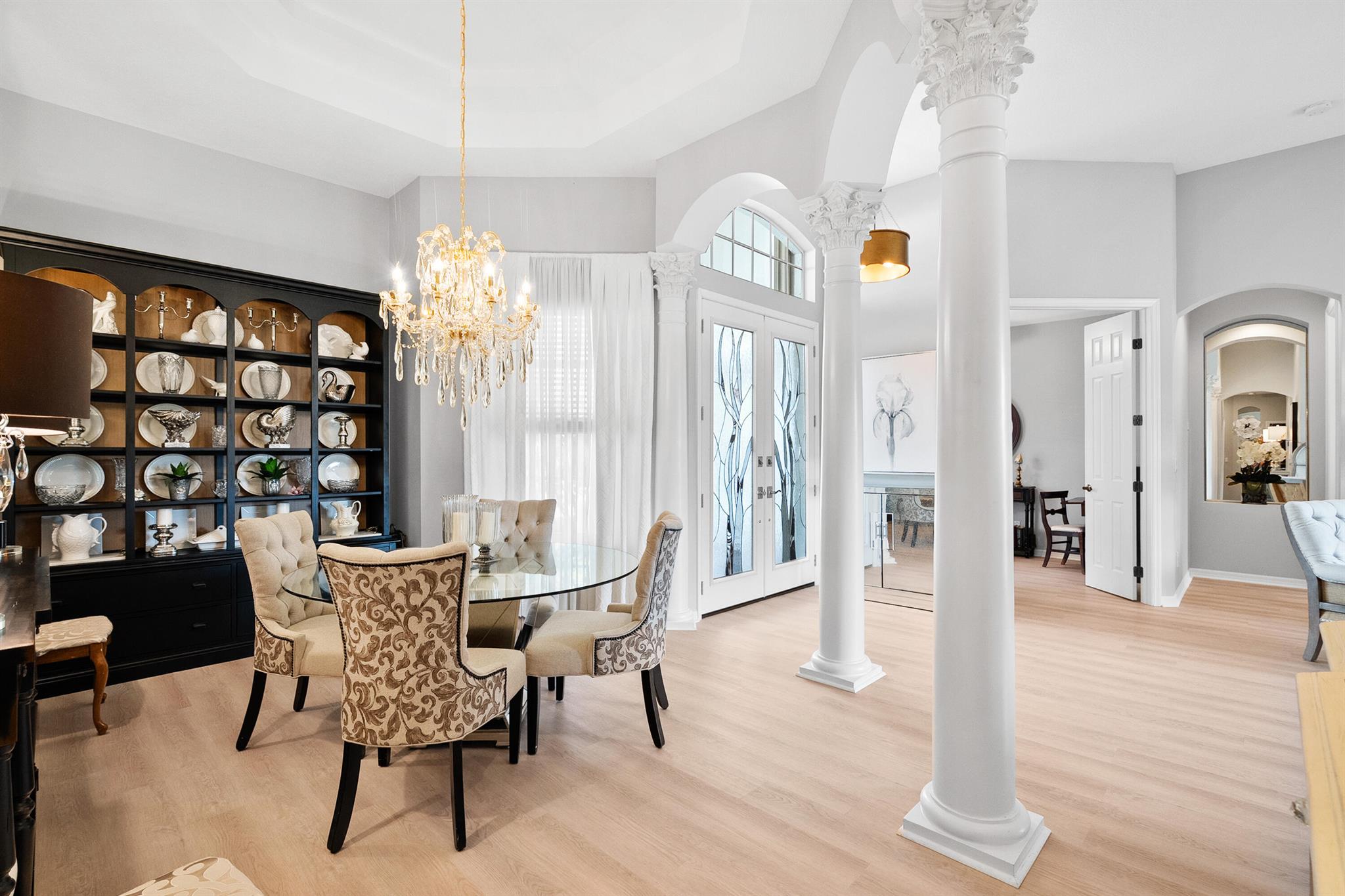 Elegance with modern renovations in this captivating floor Plan. Featuring light, neutral vinyl floors, soaring 12' ceilings in the main living areas, and 10' ceilings throughout the rest of the home, this residence is filled with natural light from abundant windows. Updated kitchen showcases white quartz countertops and stainless steel appliances. Floor plan includes a formal dining room, living room, and family room, plus 4 bedrooms and 3.5 baths. One bedroom is an en suite ideal for a nanny or in-law quarters, while another bath serves as a cabana. Enjoy tranquil lakefront views, beautiful mature landscaping, a 2021 roof, and complete hurricane panels. Community amenities include a clubhouse, pool, tennis, fitness center, and optional golf club with cafe and dining. Membership Optional