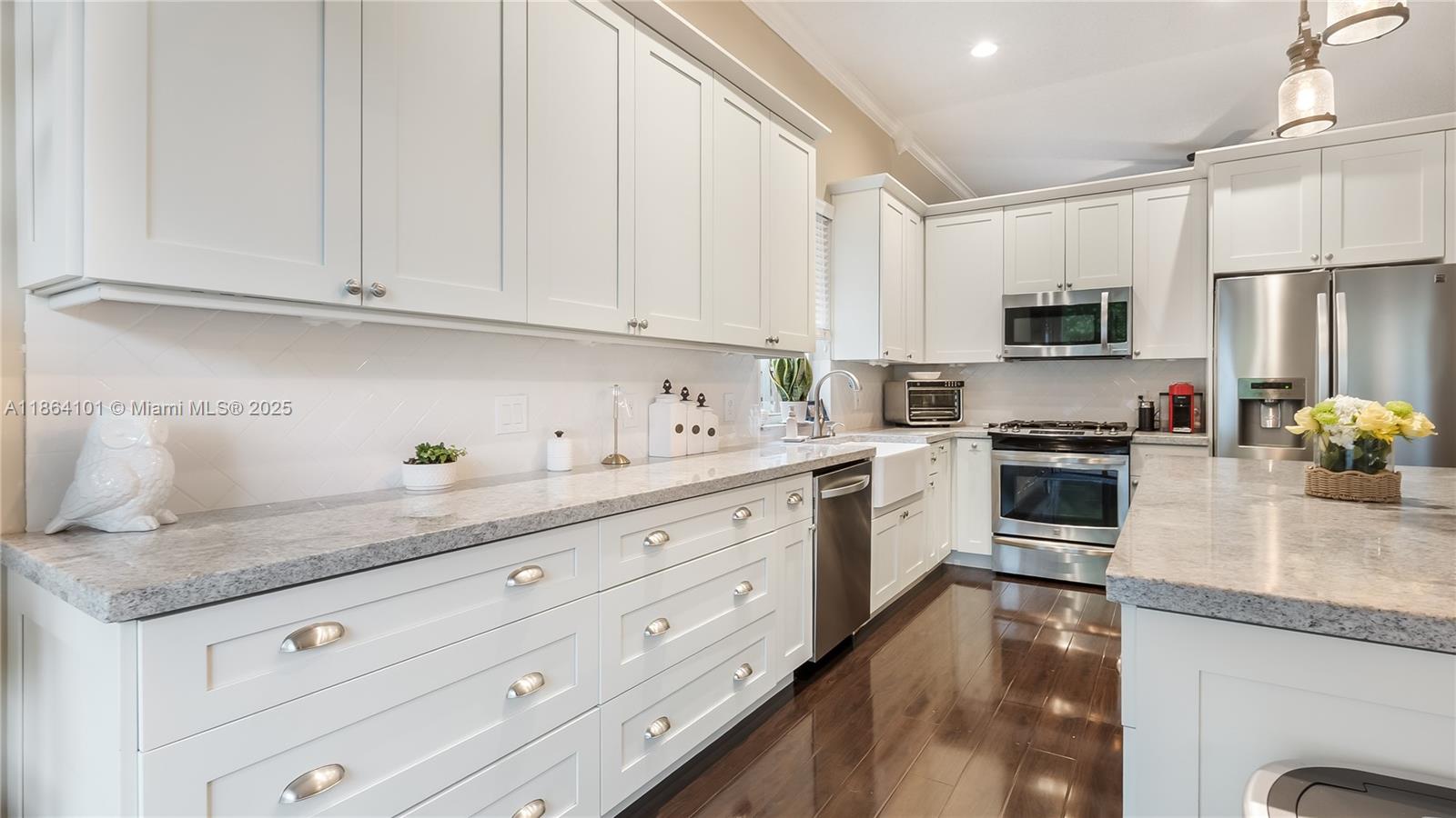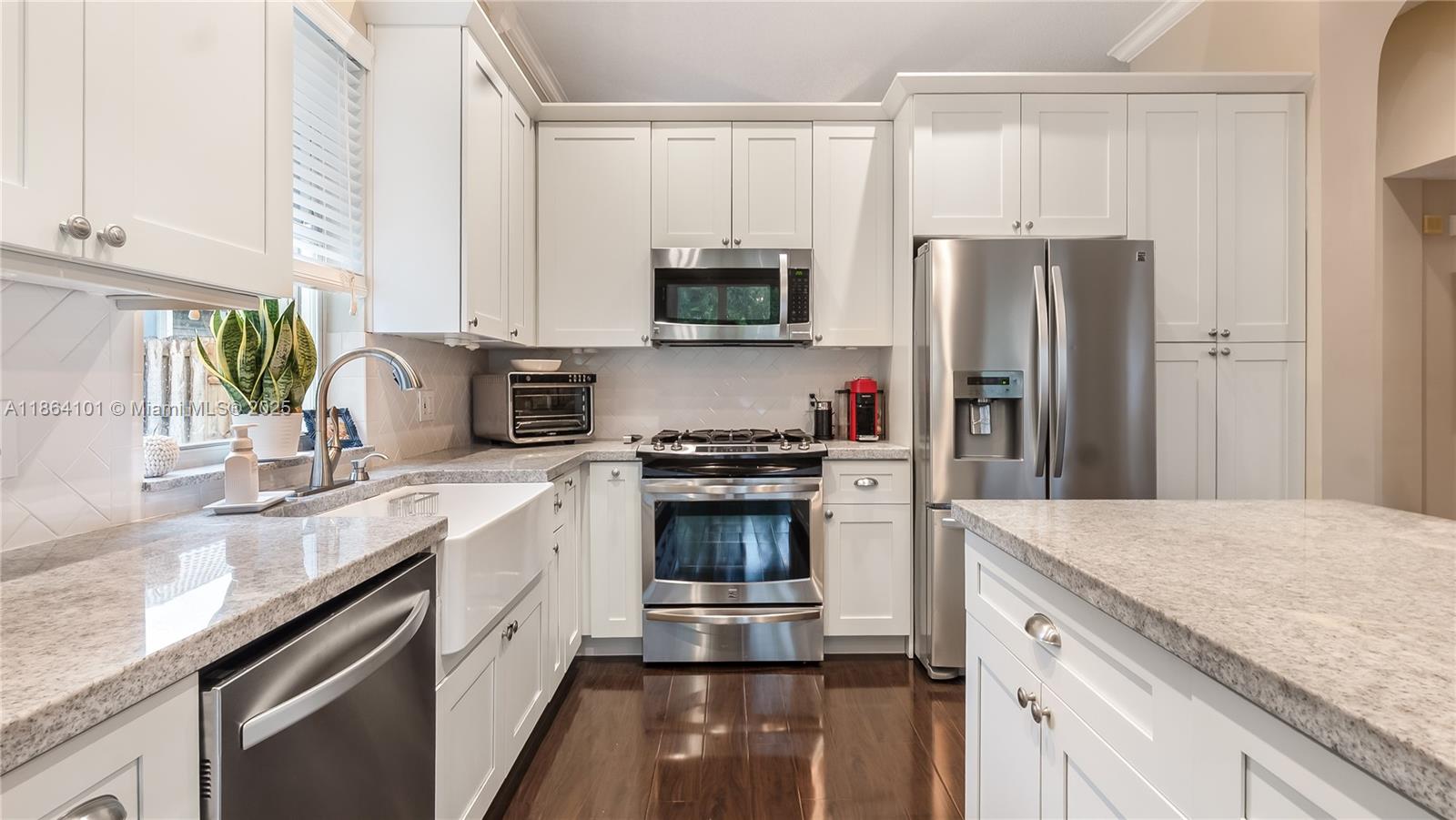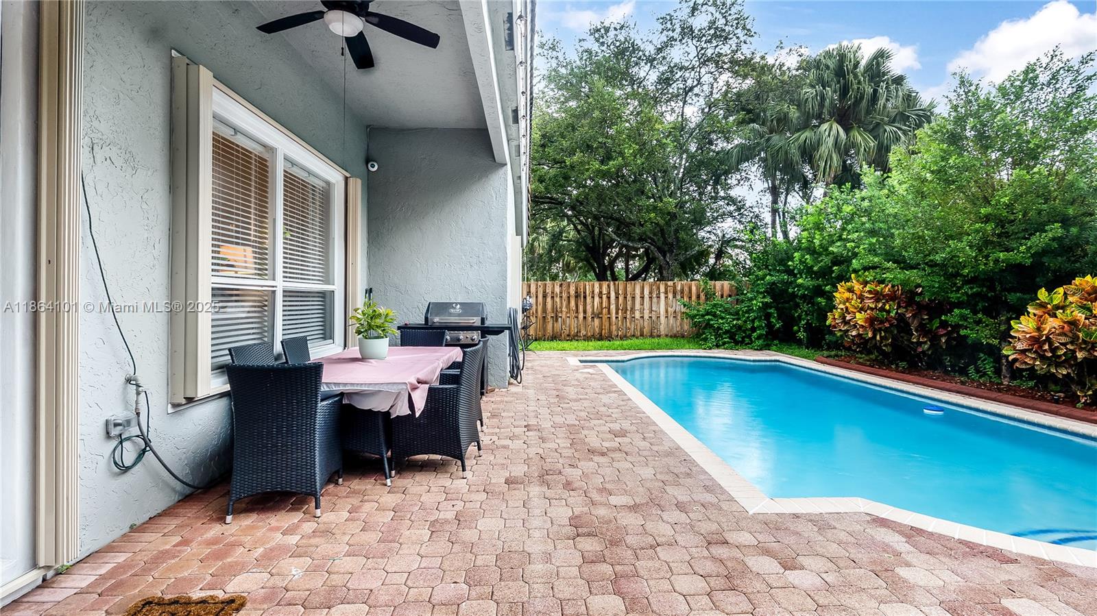 Welcome to this inviting single-story home, featuring three cozy bedrooms and three well-appointed bathrooms. Boasting a beautifully remodeled kitchen completed in 2020, you'll find stylish shaker cabinets with slow-close hinges, a charming farm sink, and brand-new appliances that blend functionality with elegance. The entire house is adorned with stunning dark laminate wood flooring, creating a warm and welcoming atmosphere. Recent upgrades include a new A/C system installed in 2023 and a hot water heater that was added in 2025, ensuring modern comfort and efficiency. Step outside to discover a refreshed pool area, resurfaced with diamond brite, complemented by new tiles, coping, and an upgraded pump from 2024. Safety is prioritized with the inclusion of a child fence for peace of mind