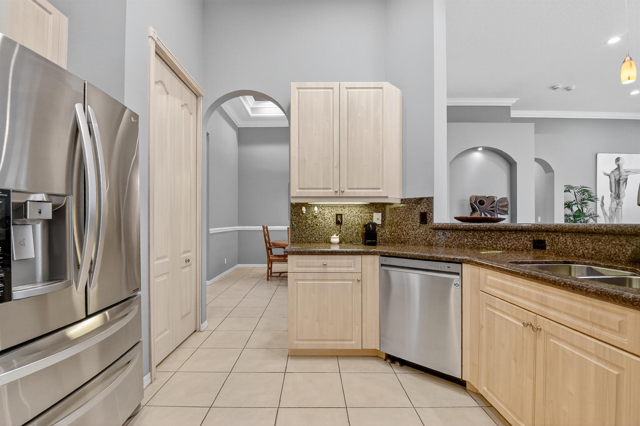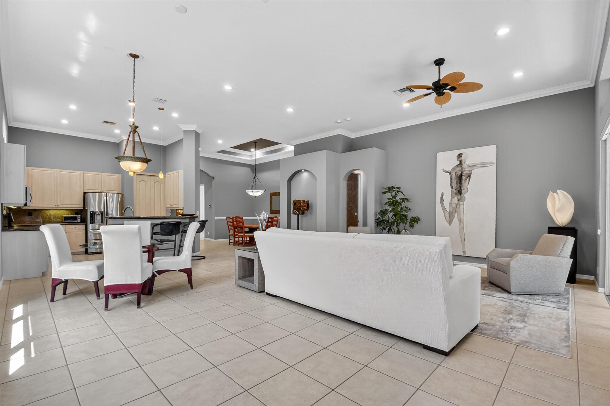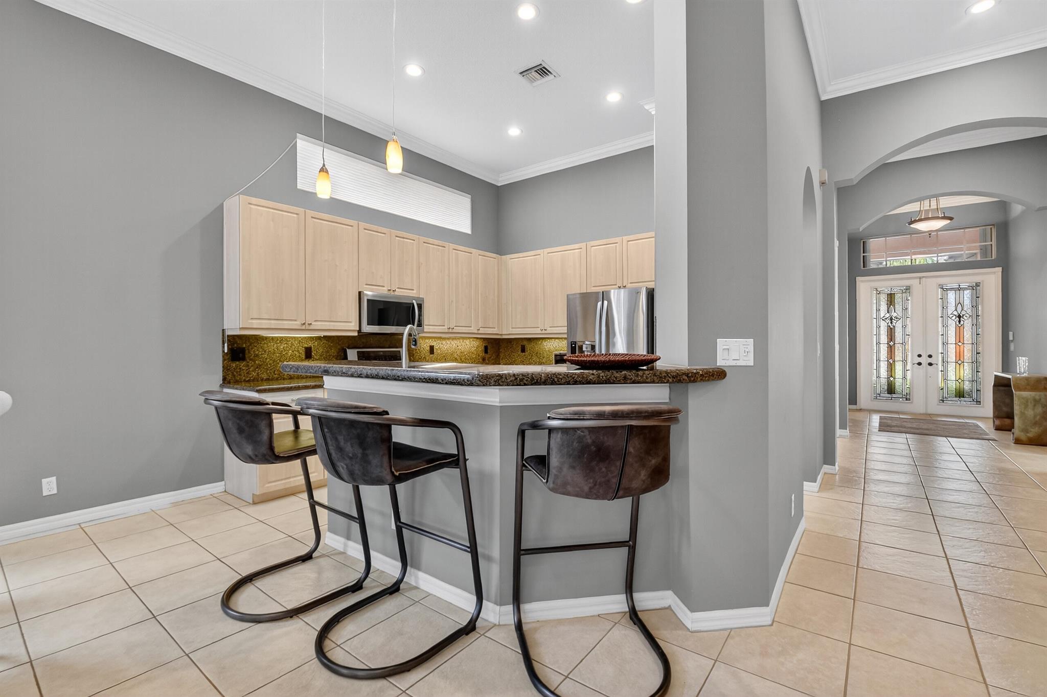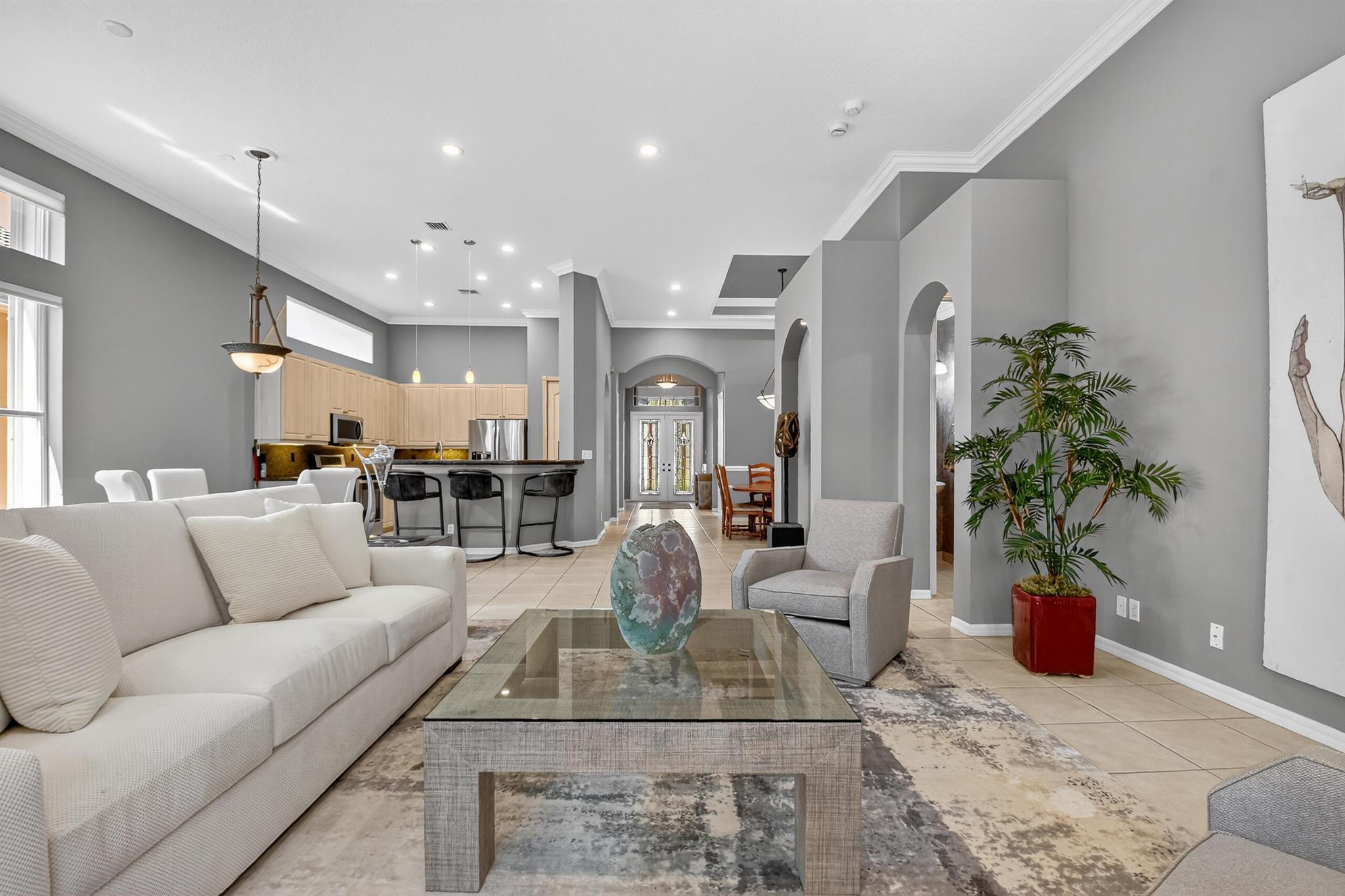 Welcome to one of the most beautiful and best-valued homes in the desirable 55+ gated community of Mizner Falls. This elegantly maintained 3-bedroom, 2.5-bath single-story residence invites you through grand double glass doors into a bright, open-concept layout featuring soaring ceilings, crown molding, and timeless neutral finishes. The kitchen shines with granite countertops, a stylish backsplash, and stainless steel appliances--perfect for both everyday living and effortless entertaining.