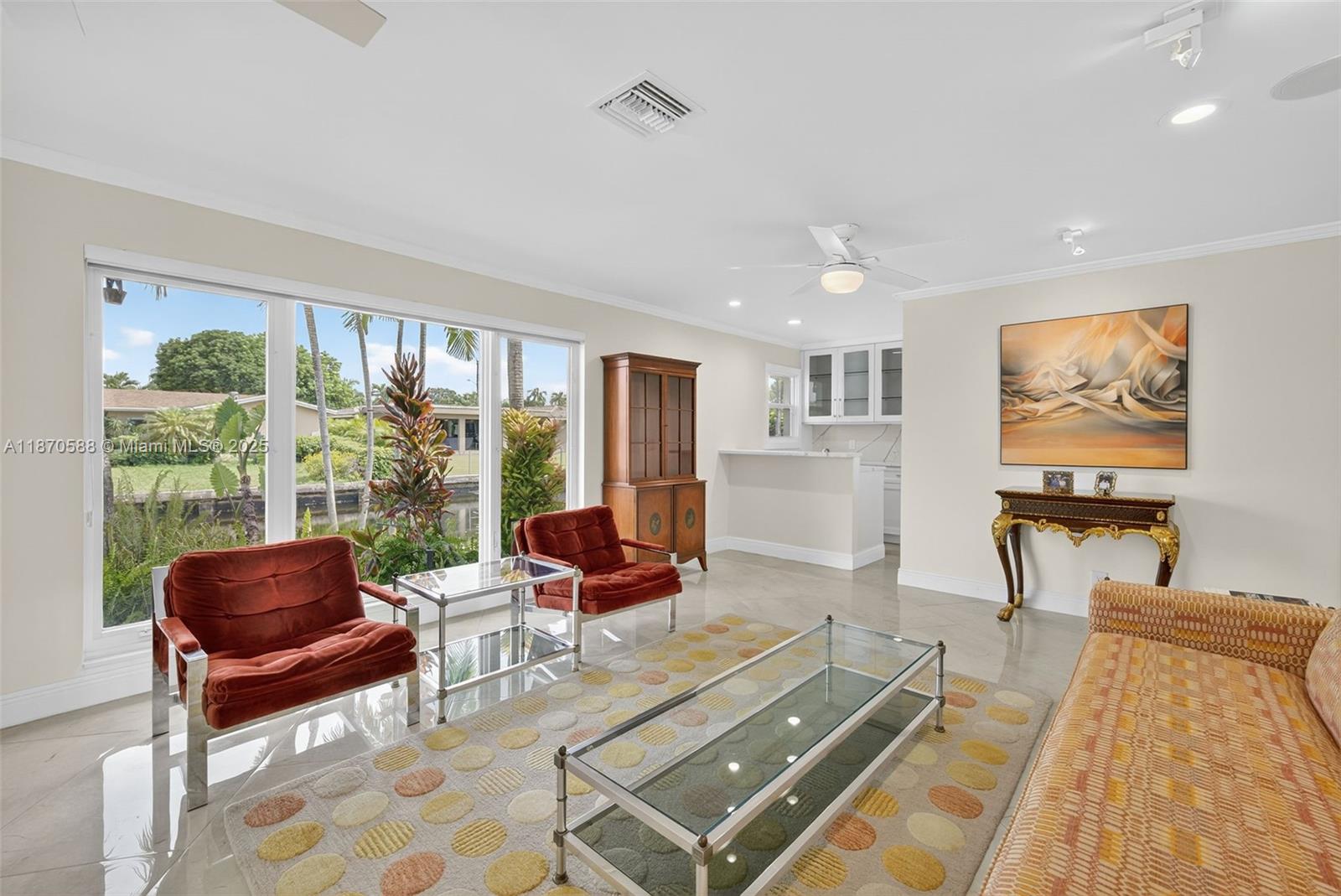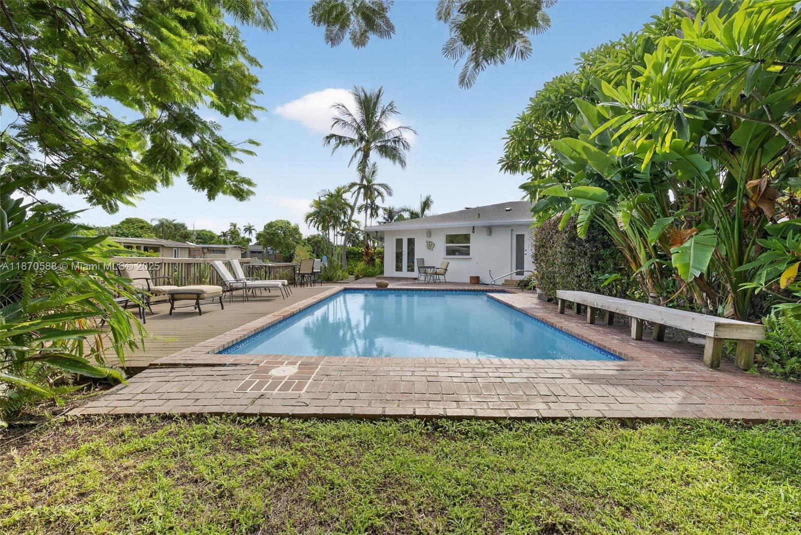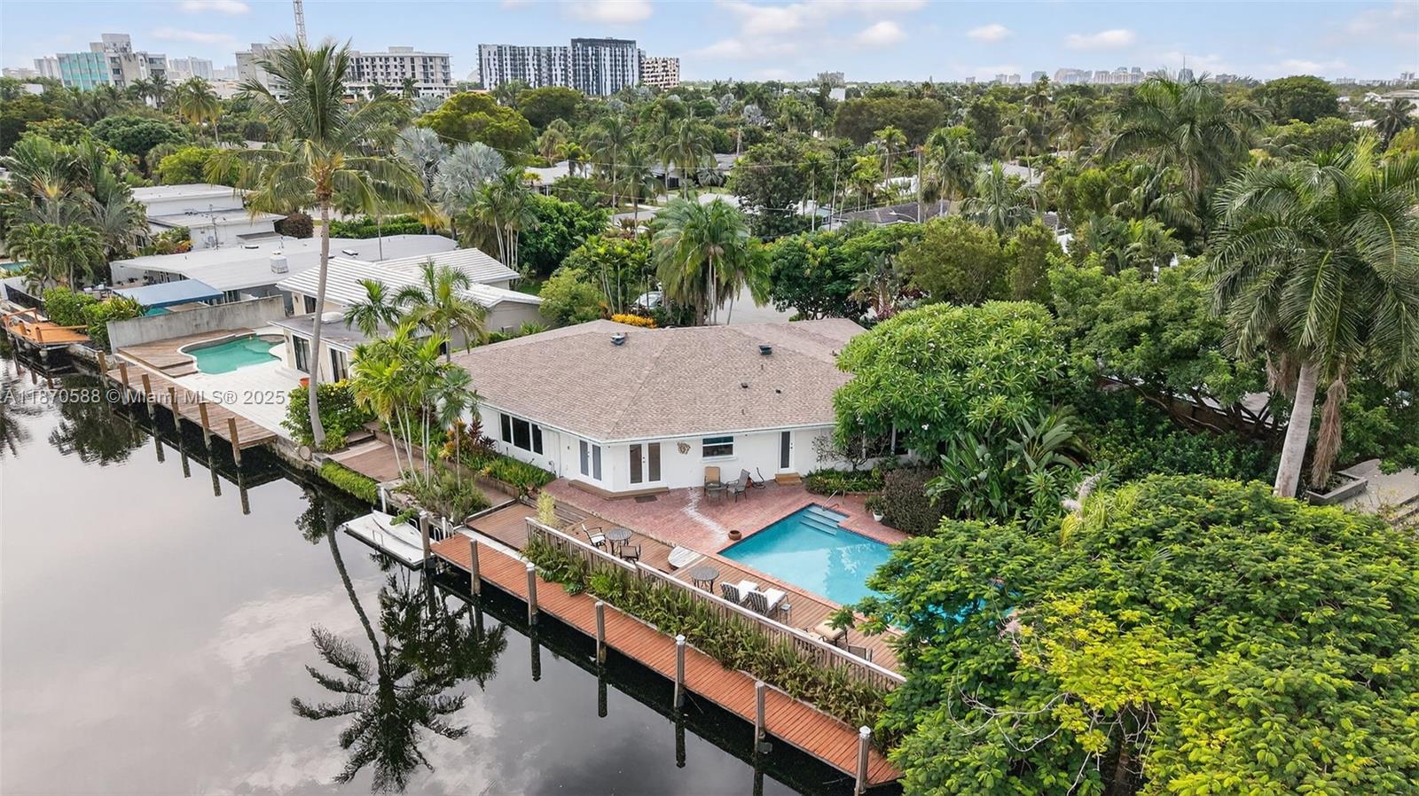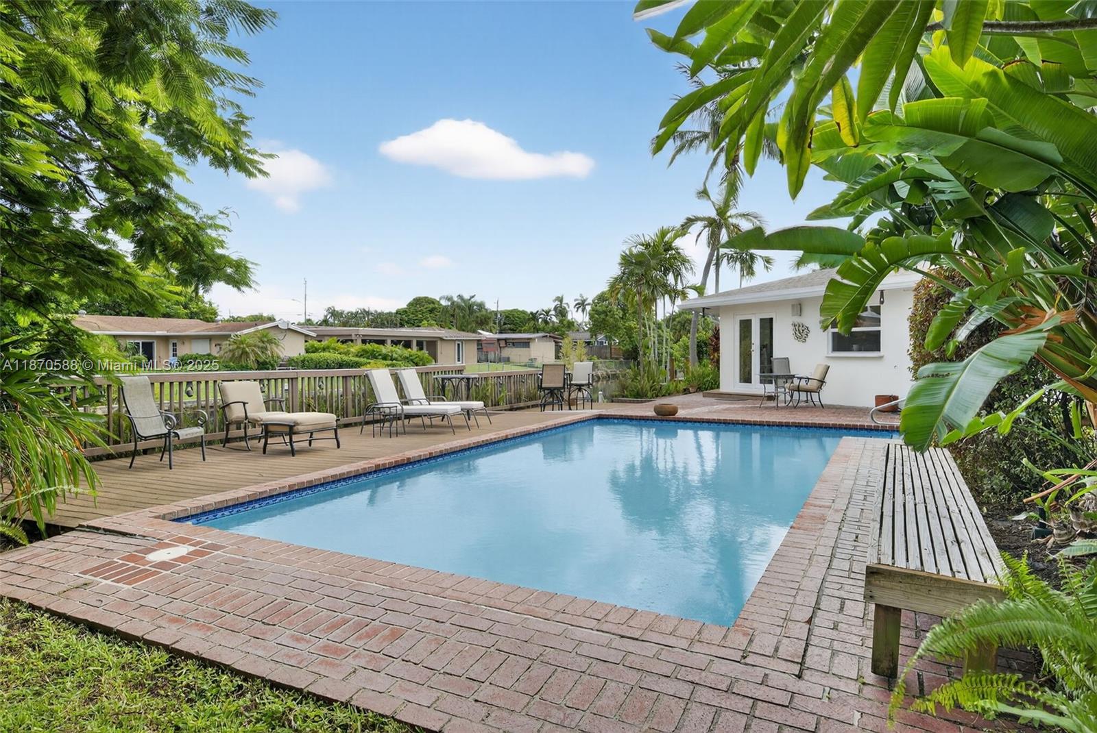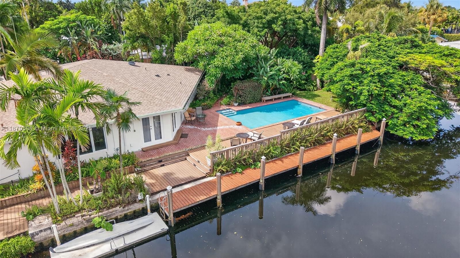 Completely renovated 3-bedroom, 2-bathroom waterfront home on a quiet cul-de-sac with a spacious corner lot. Enjoy 140 feet of water frontage with a 60-foot dock—100 feet on one side and 40 feet on the other—perfect for water enthusiasts. This move-in ready home features a brand-new kitchen with modern appliances, updated bathrooms, new flooring, and a new roof. All impact windows and doors provide peace of mind. The open layout offers water views from the kitchen, family room, and primary suite. Step outside to a large yard with pool, deck, and expansive seating areas designed for entertaining or relaxing by the water. On a 10,000 Sqft lot filled with lush landscaping which completes this rare waterfront gem. Location is near Federal Highway with access to exquisite shopping and dining.