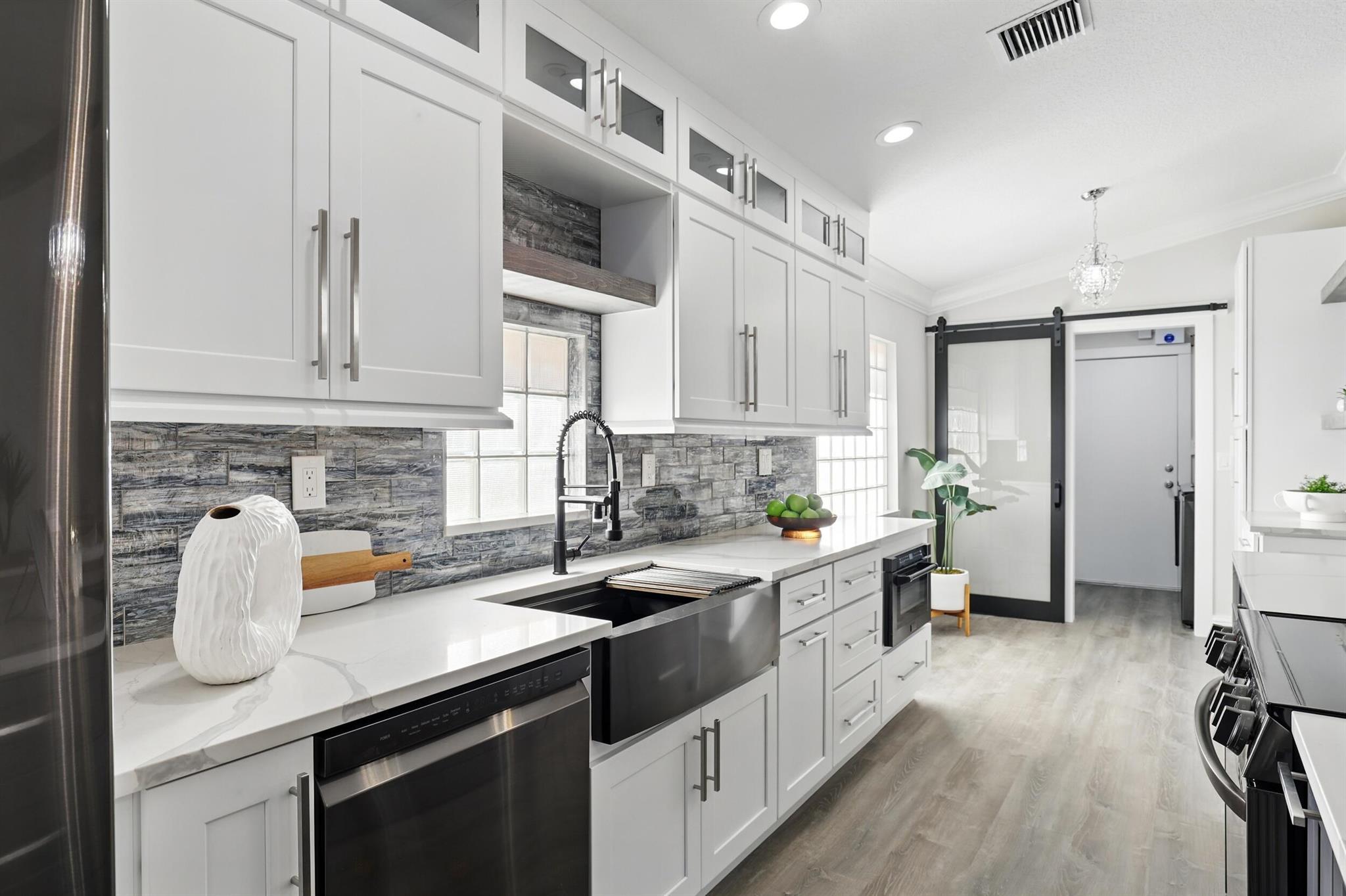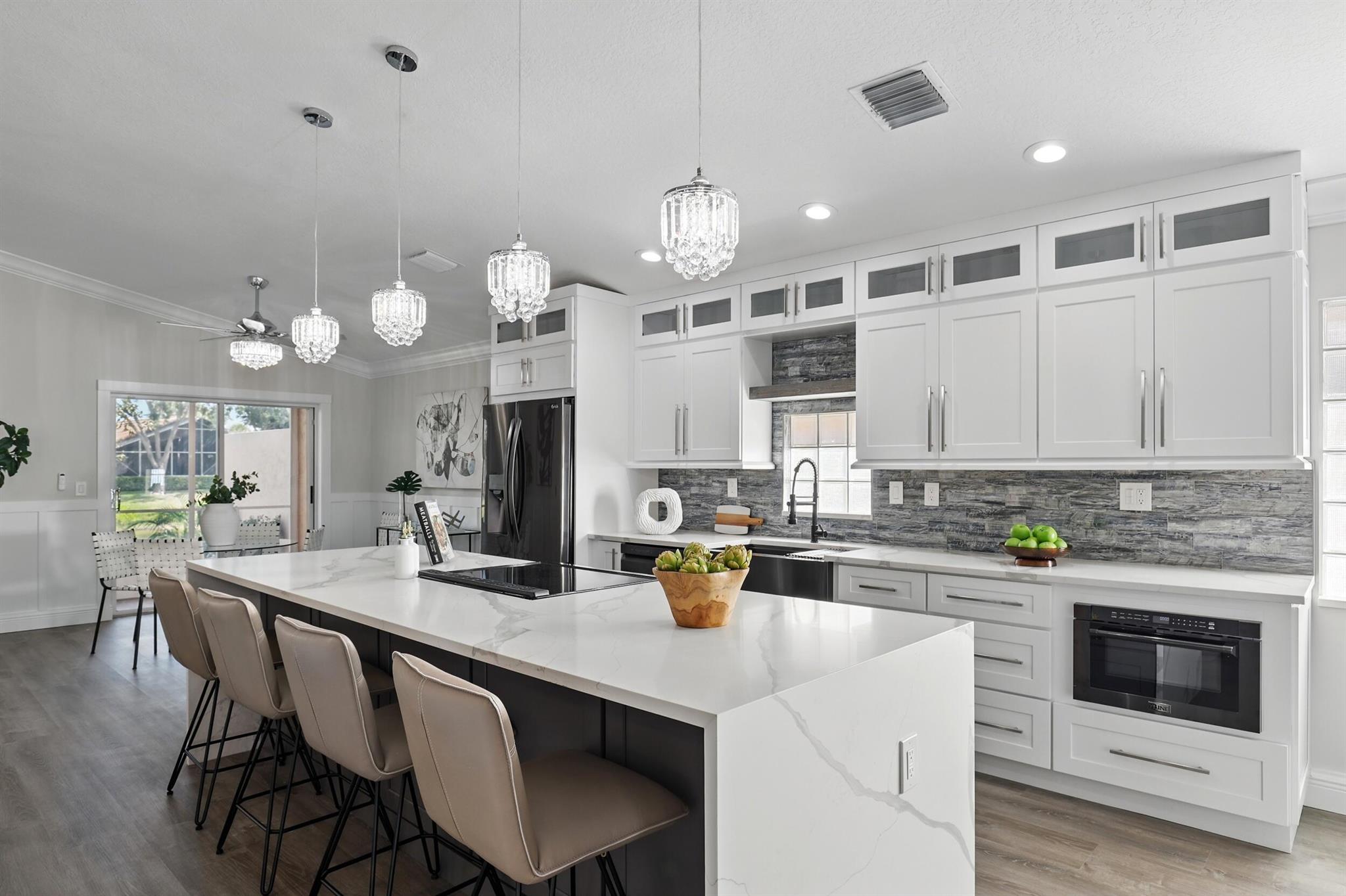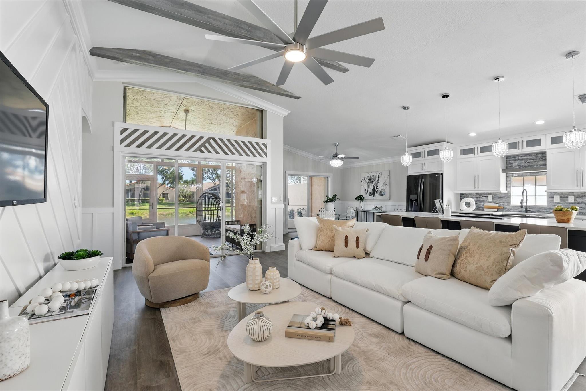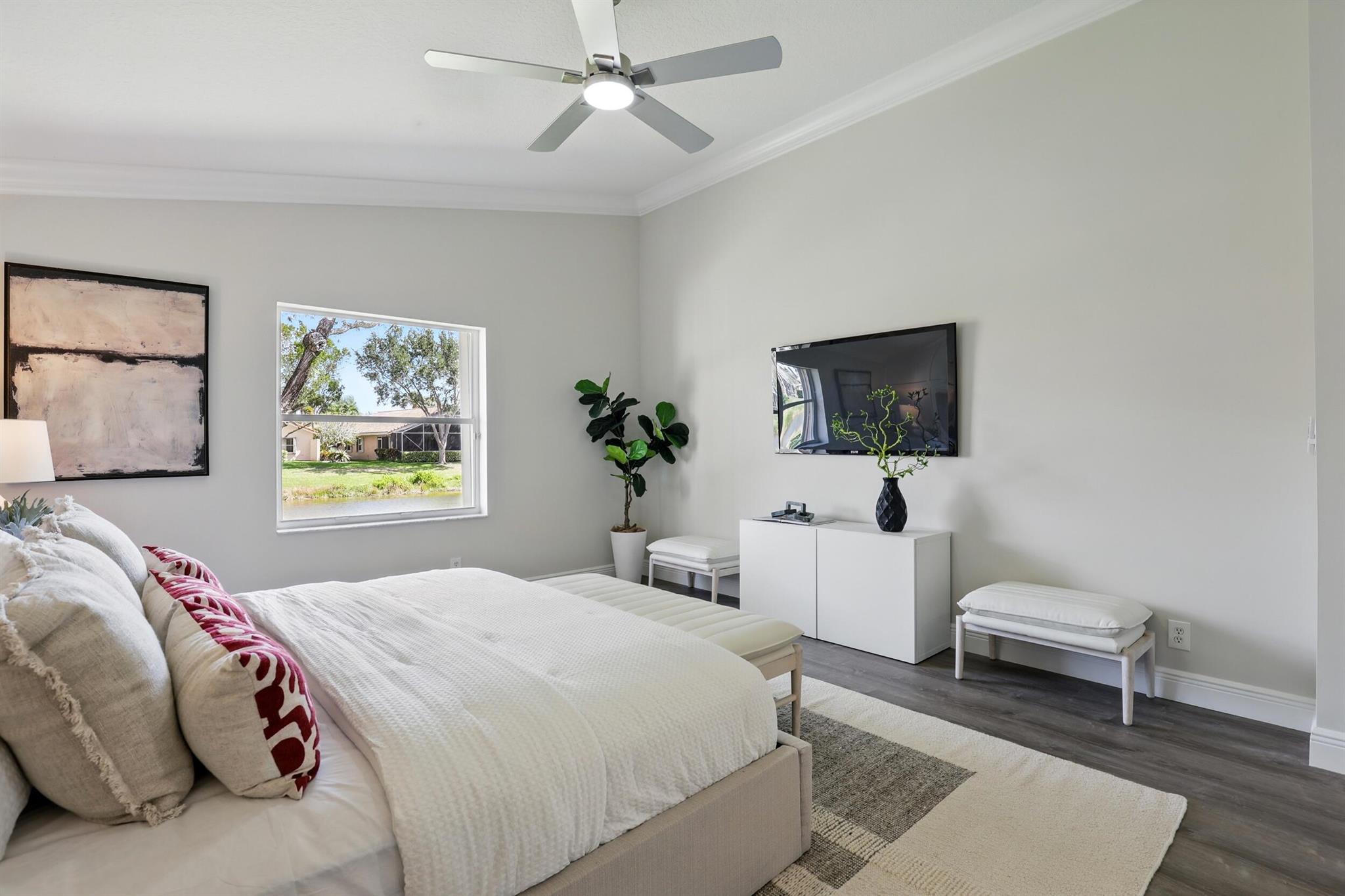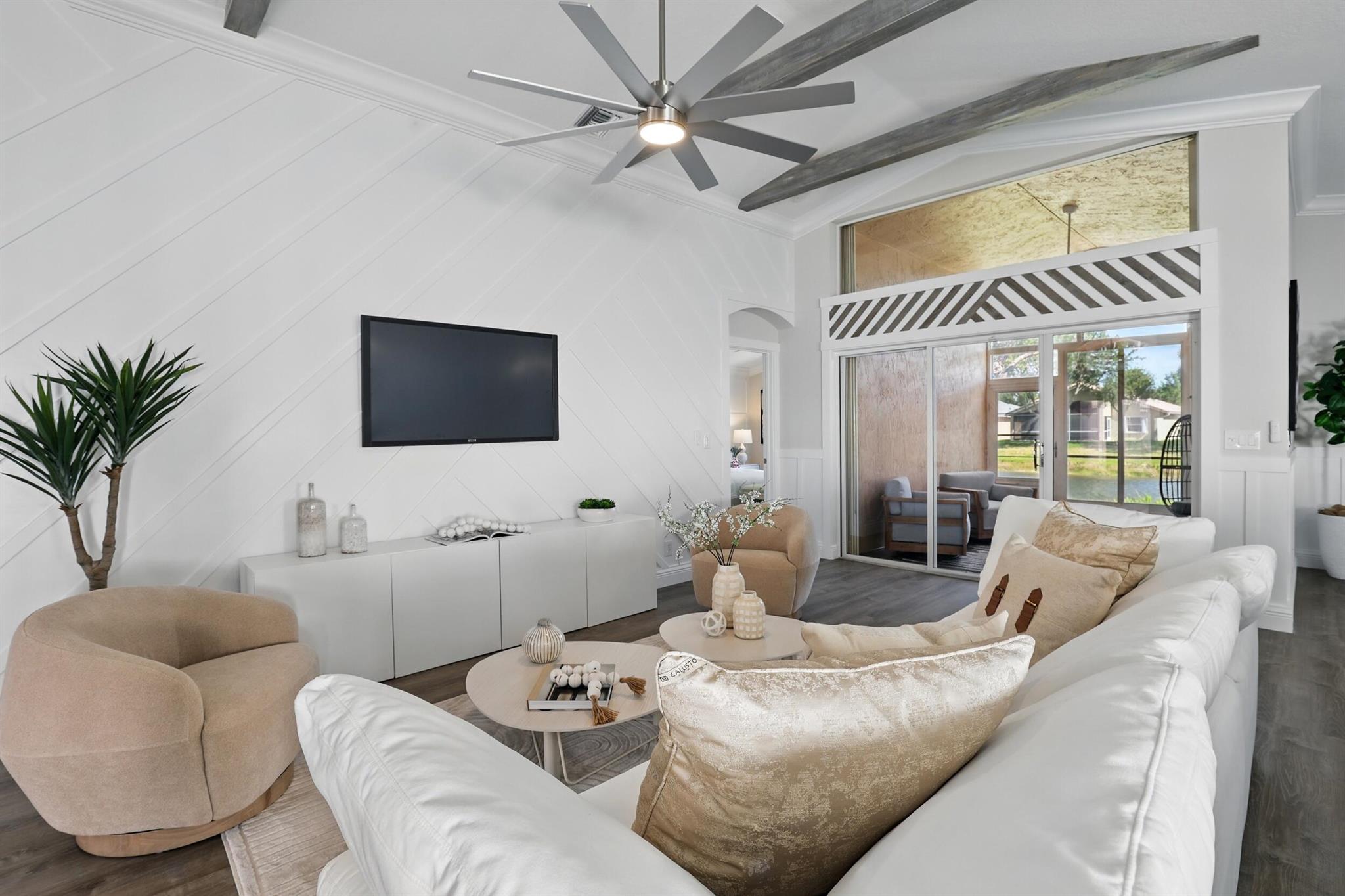 Updated from top to bottom! STUNNING, LAKEFRONT home featuring 3 bedrooms, 2 baths, and a spacious 2-car garage. Including a BRAND-NEW ROOF (2025) Hot water heater (2025). Designer finishes throughout include custom shaker cabinetry, quartz countertops with waterfall edging, brand-new black stainless-steel appliances, sleek center island. High ceilings. Premium laminate flooring. The elegant primary suite is set apart for added privacy and features two expansive walk-in closets, luxurious soaking tub & separate glass enclosed shower with seating. Dual sinks. Unwind on your covered screened patio overlooking the lake. Accordion shutters for added storm protection. This home is truly a showpiece! Meticulously upgraded!