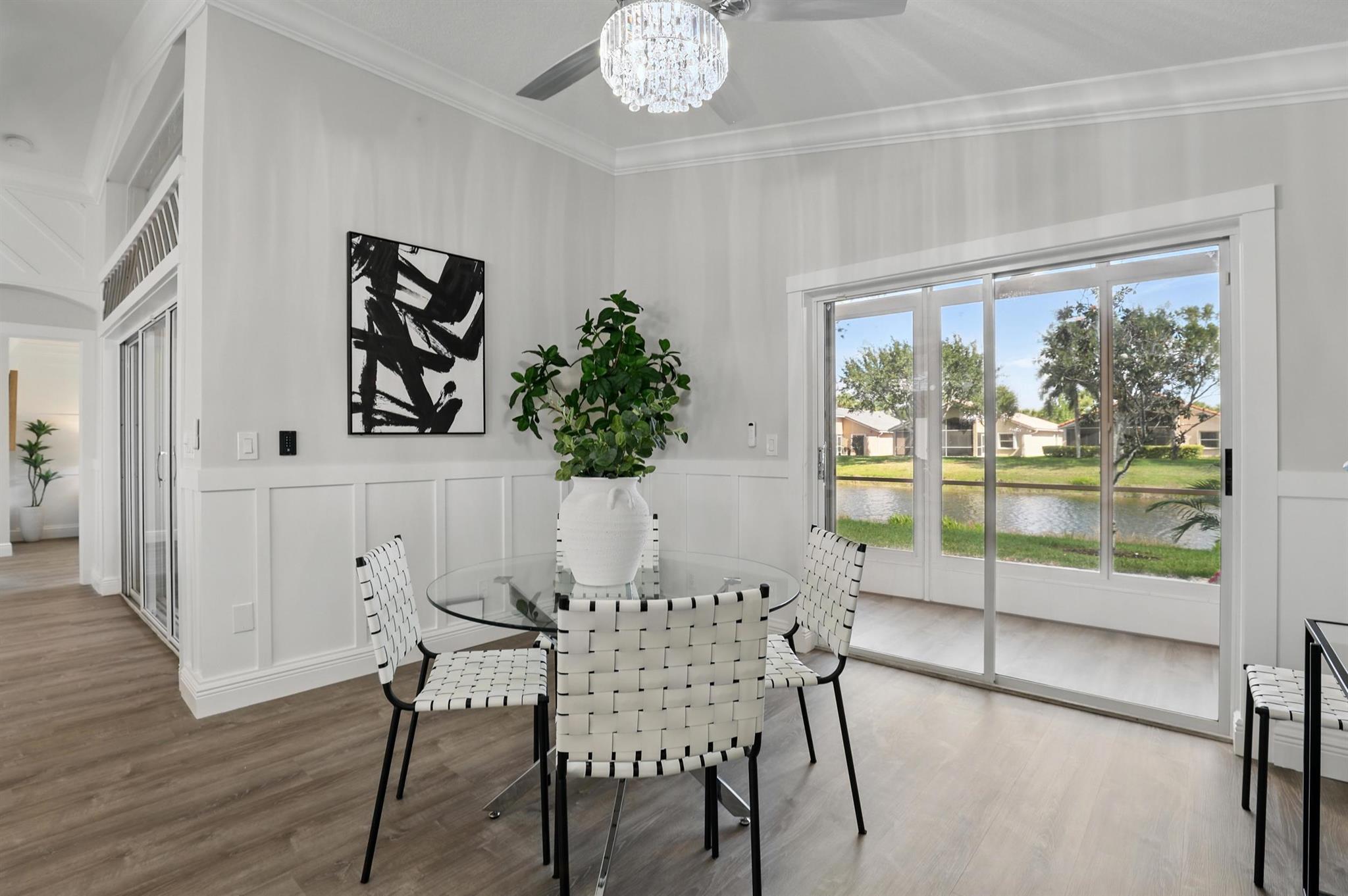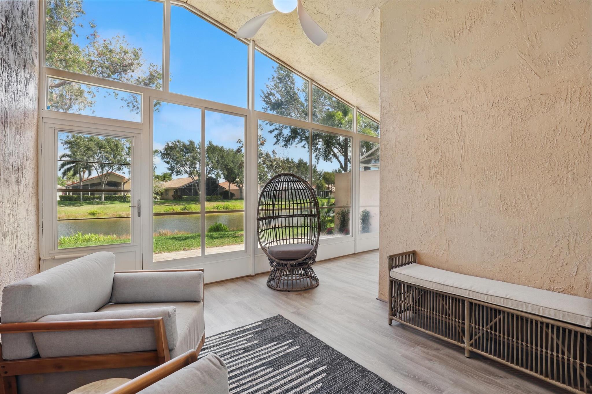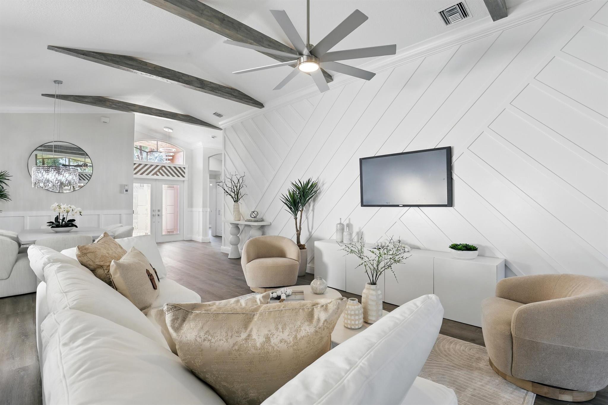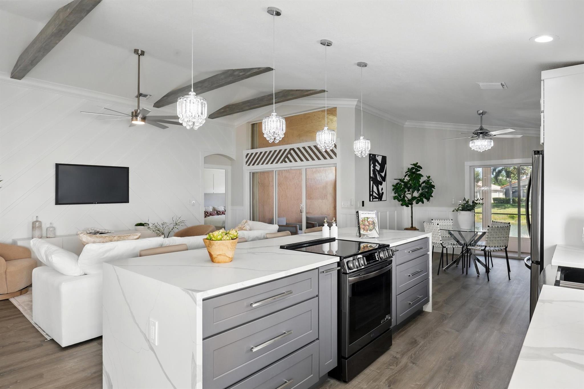 Updated from top to bottom! STUNNING, LAKEFRONT home featuring 3 bedrooms, 2 baths, and a spacious 2-car garage. Including a BRAND-NEW ROOF (2025) Hot water heater (2025). Designer finishes throughout include custom shaker cabinetry, quartz countertops with waterfall edging, brand-new black stainless-steel appliances, sleek center island. High ceilings. Premium laminate flooring. The elegant primary suite is set apart for added privacy and features two expansive walk-in closets, luxurious soaking tub & separate glass enclosed shower with seating. Dual sinks. Unwind on your covered screened patio overlooking the lake. Accordion shutters for added storm protection. This home is truly a showpiece! Meticulously upgraded!