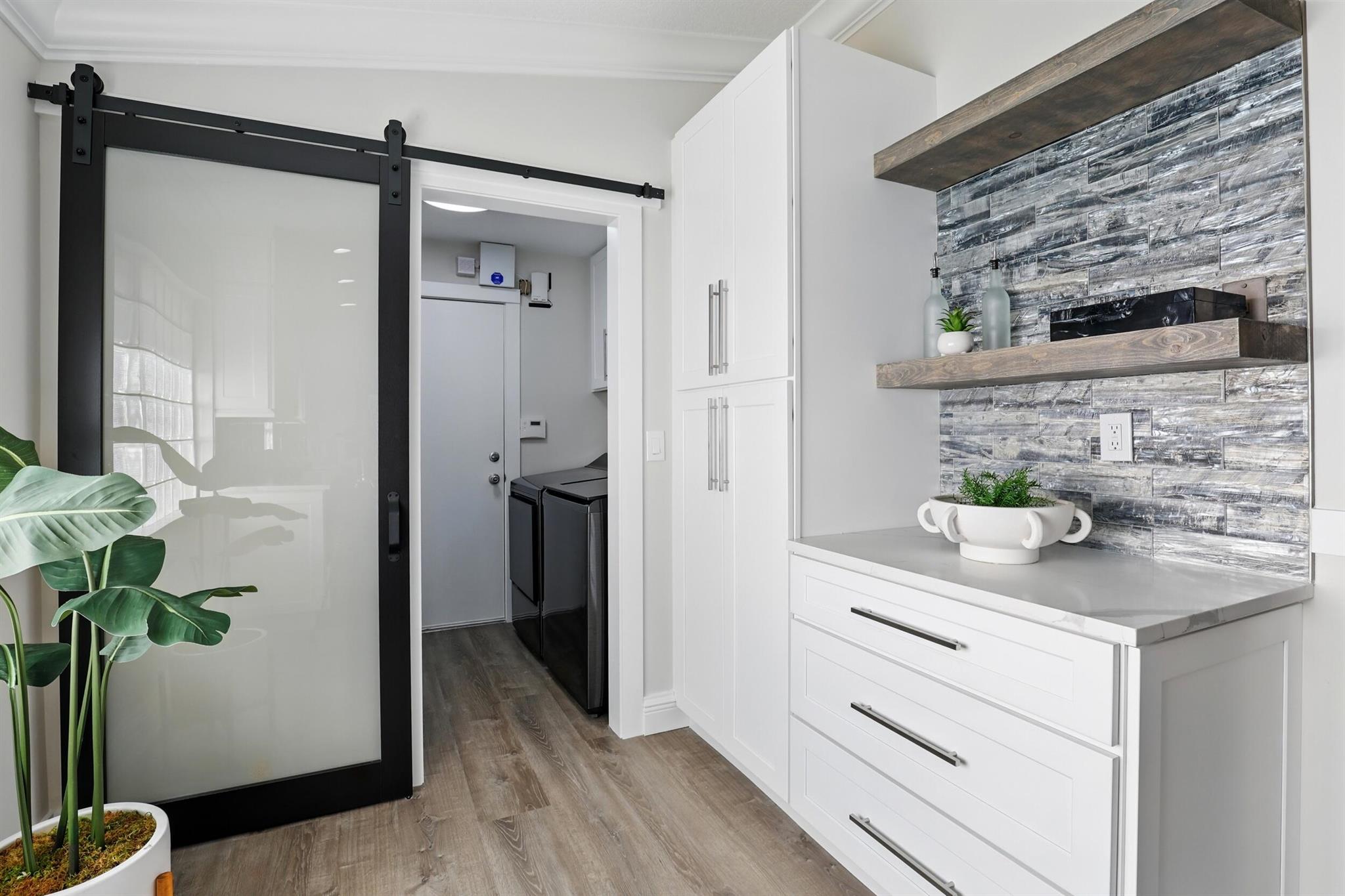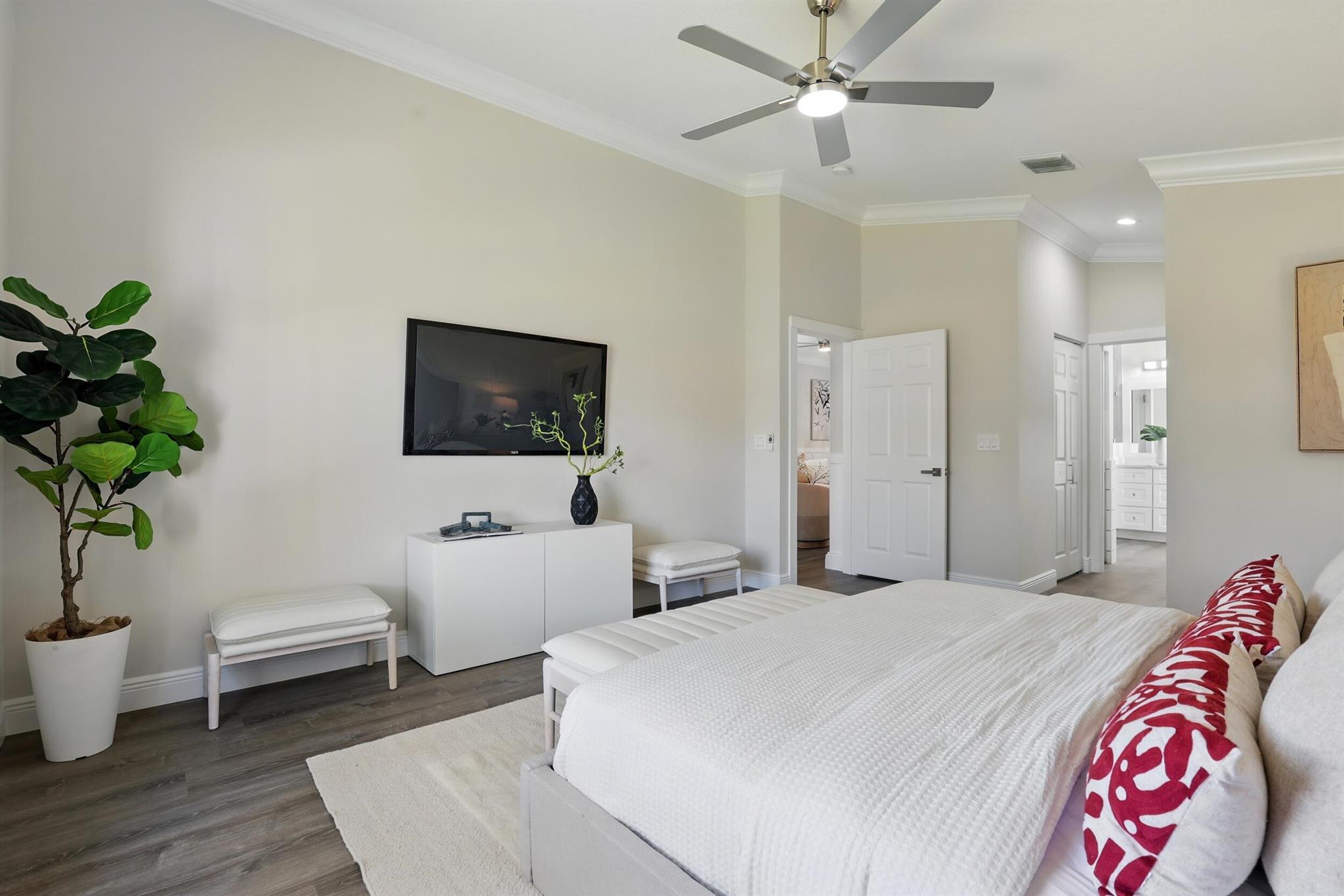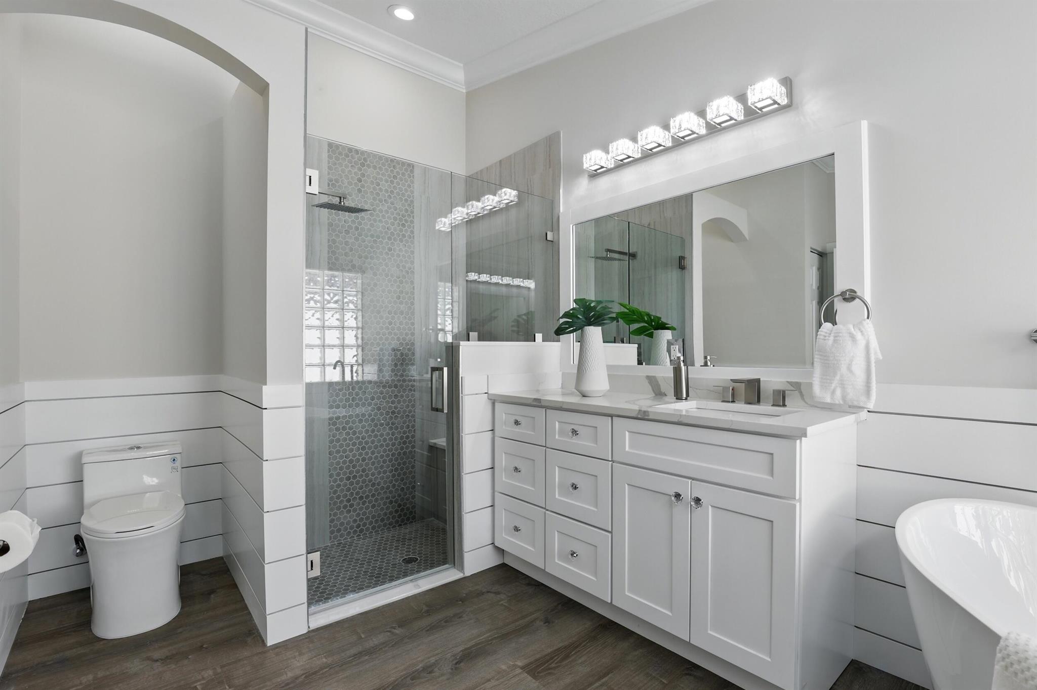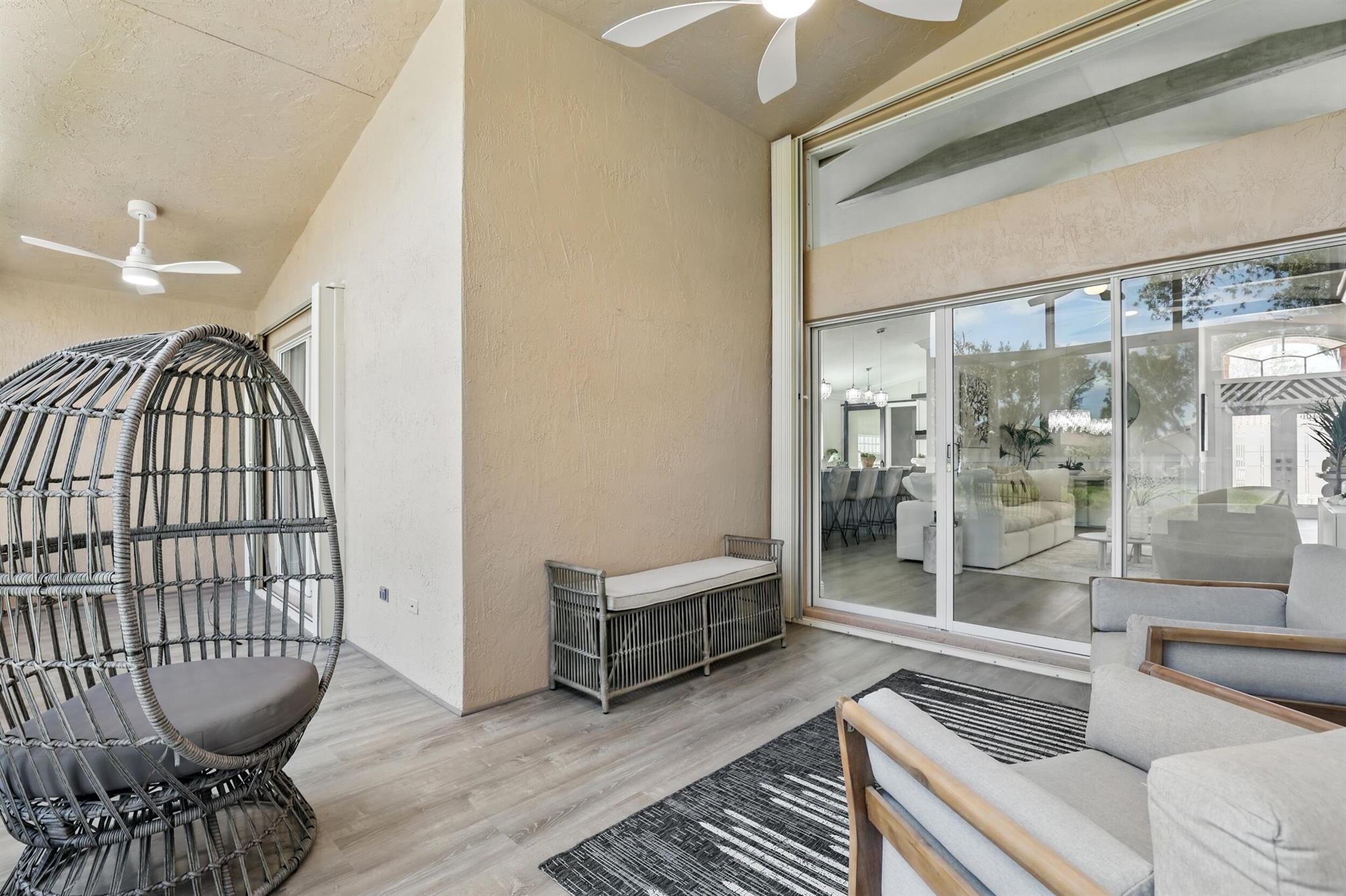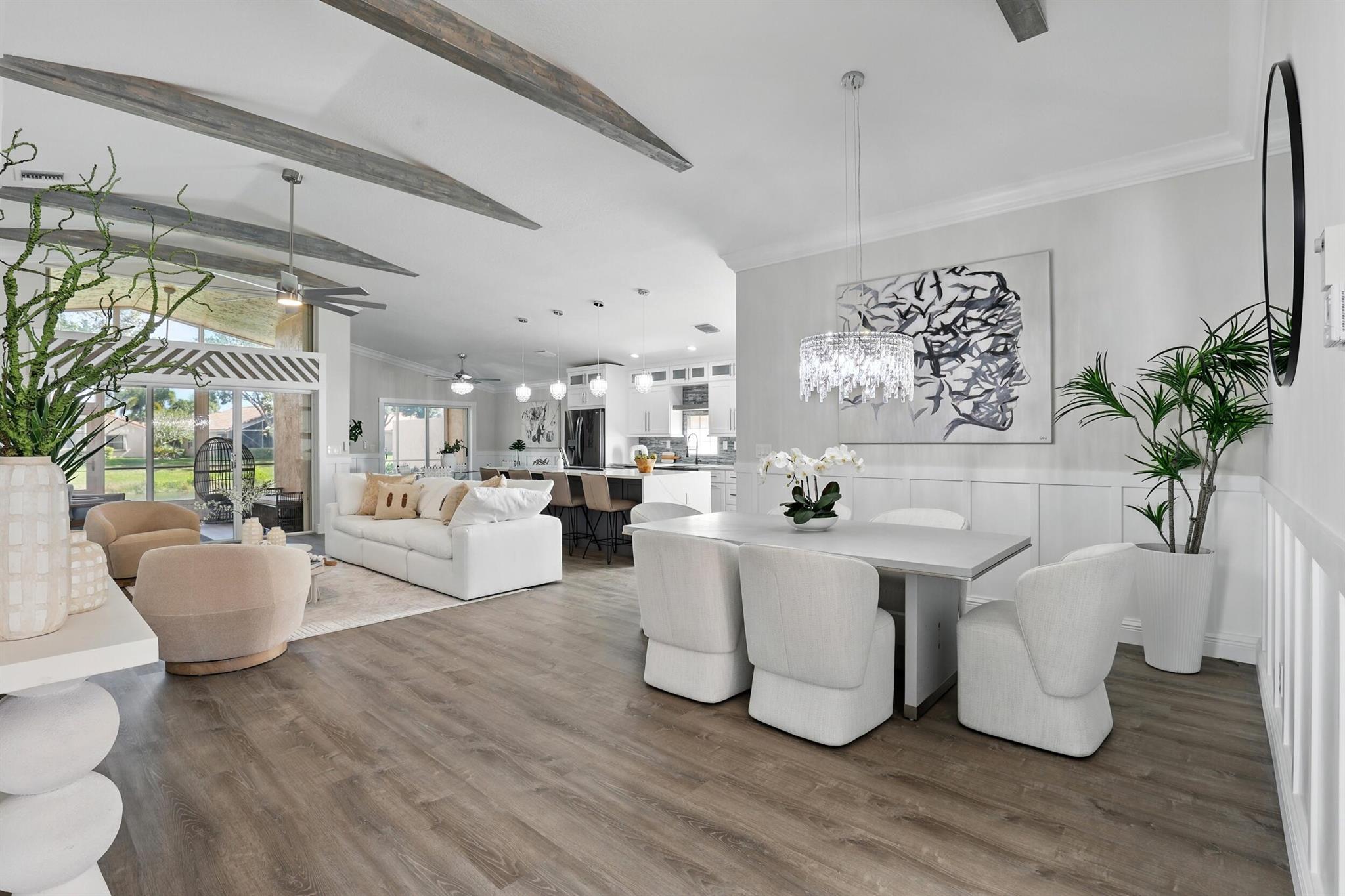 Updated from top to bottom! STUNNING, LAKEFRONT home featuring 3 bedrooms, 2 baths, and a spacious 2-car garage. Including a BRAND-NEW ROOF (2025) Hot water heater (2025). Designer finishes throughout include custom shaker cabinetry, quartz countertops with waterfall edging, brand-new black stainless-steel appliances, sleek center island. High ceilings. Premium laminate flooring. The elegant primary suite is set apart for added privacy and features two expansive walk-in closets, luxurious soaking tub & separate glass enclosed shower with seating. Dual sinks. Unwind on your covered screened patio overlooking the lake. Accordion shutters for added storm protection. This home is truly a showpiece! Meticulously upgraded!