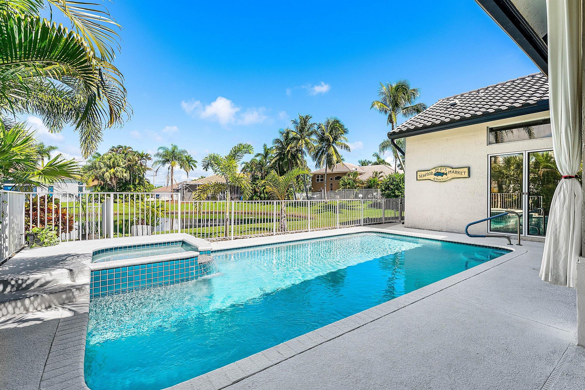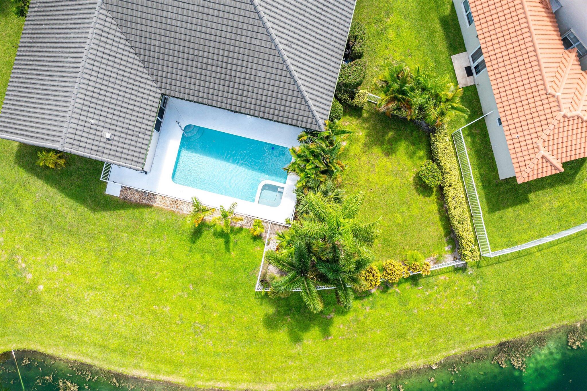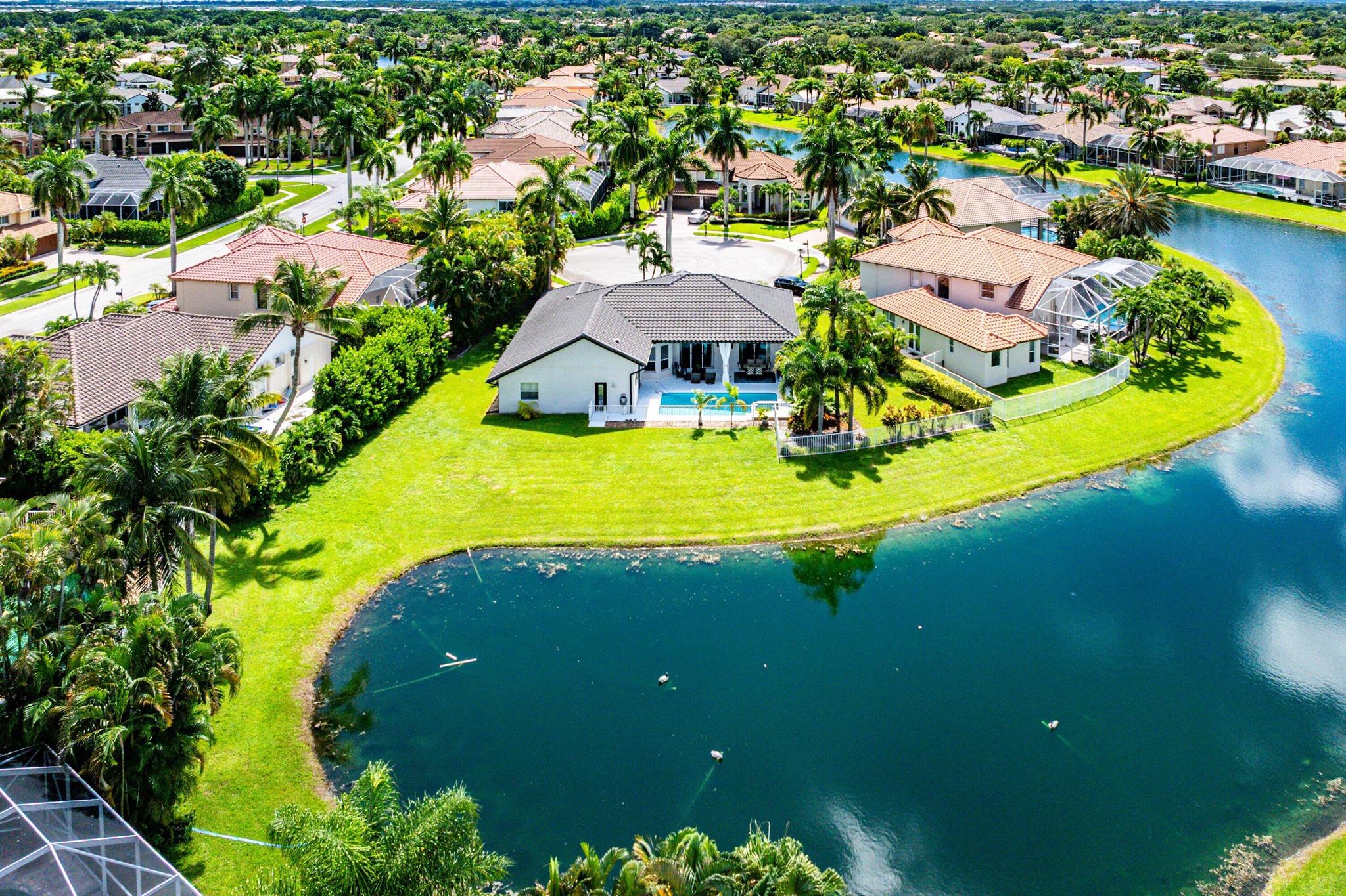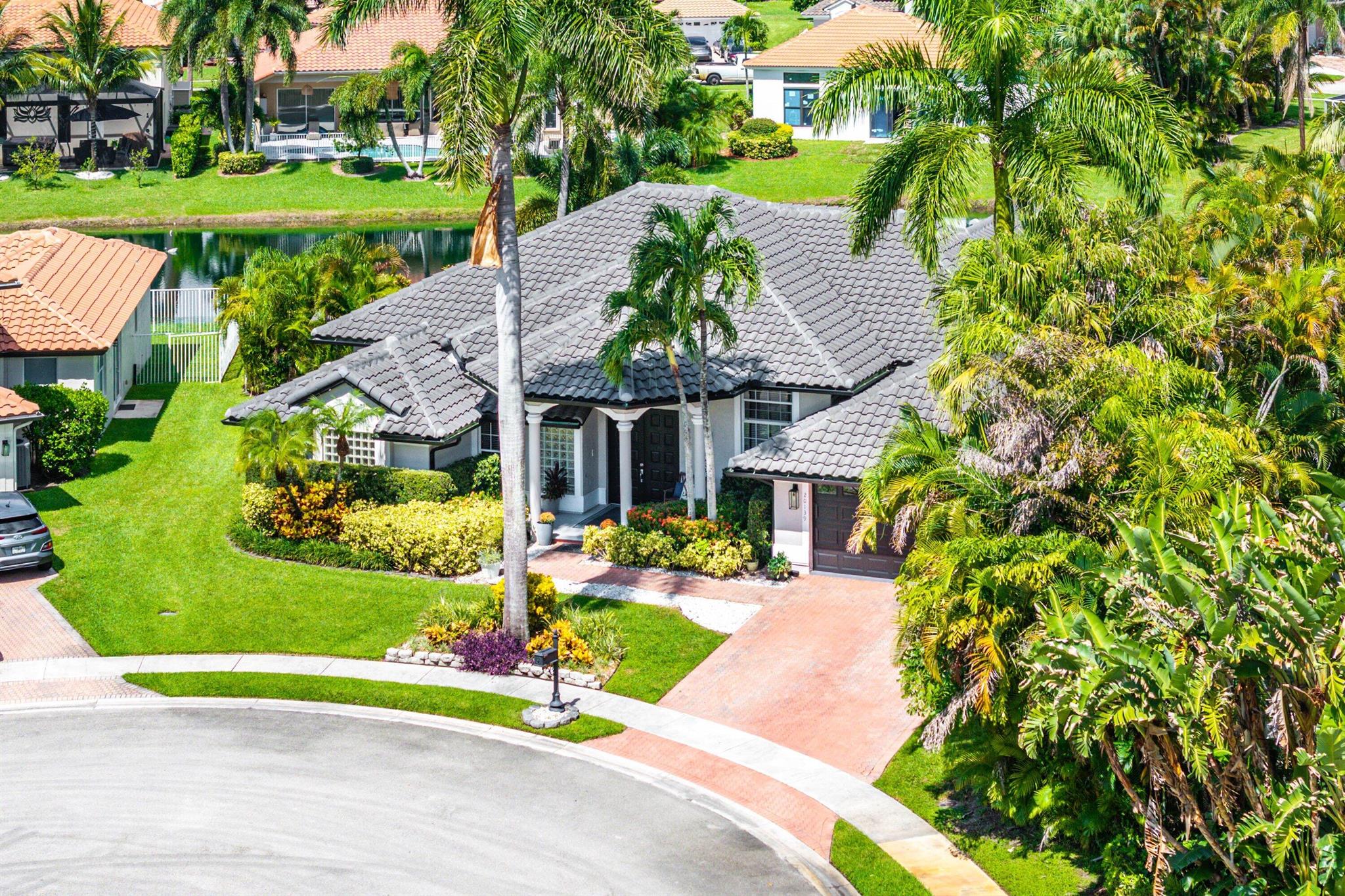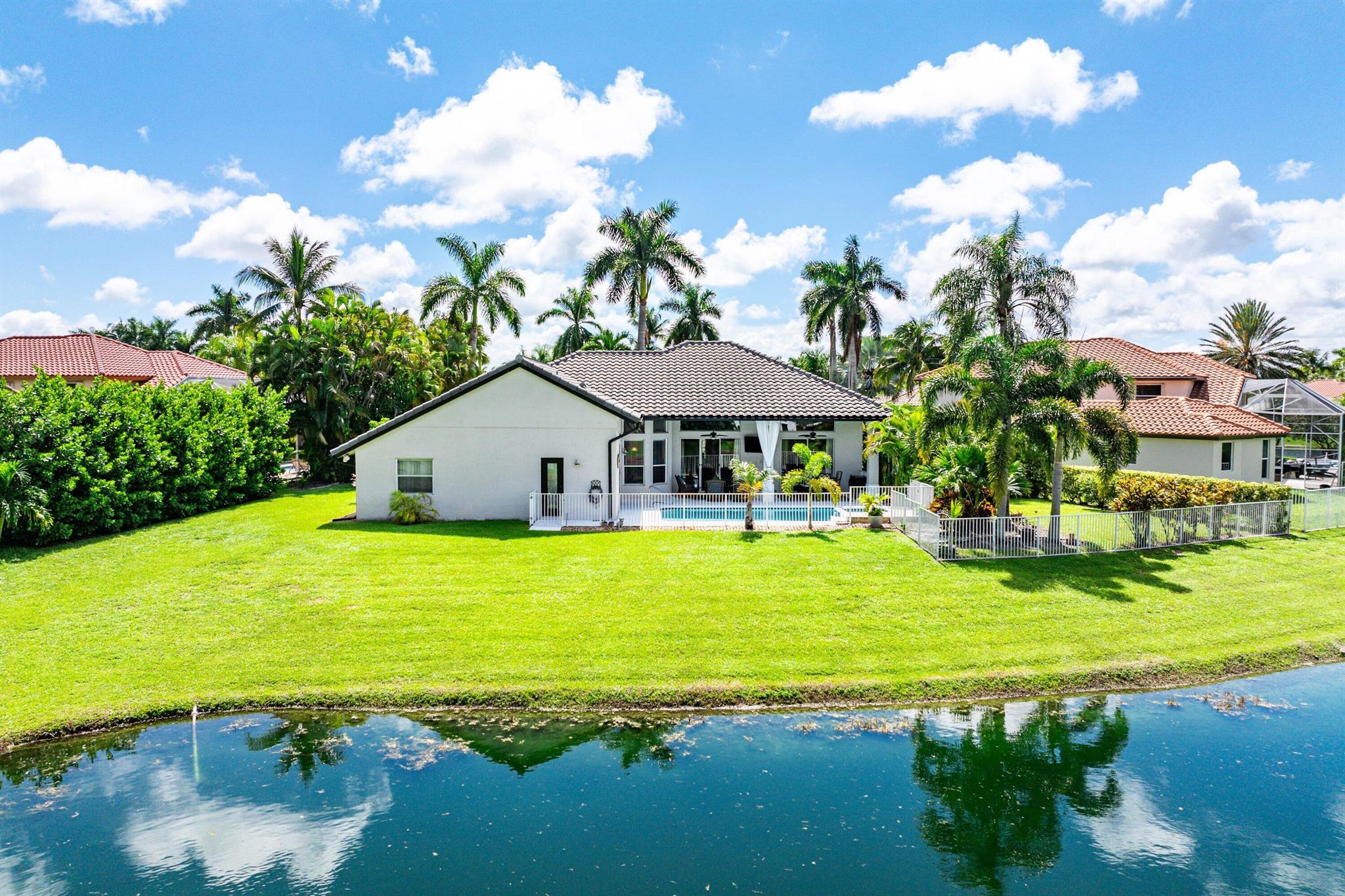 Opportunity to own this popular Cayman V model on highly sought-after oversized, pie-shaped cul-de-sac lakefront lot in gated community. Welcoming double door entry. Volume ceilings, and many updated features throughout the home, roof 2022 - come see! Spacious primary suite opening to upgraded pool and spa, adjacent bedroom can serve as study w/three more bedrooms on the other side. Generously-sized kitchen overlooks spacious family room with breakfast nook - great view of the pool! Expansive covered patio, perfect for relaxing while enjoying the stunning views of the lakefront. Convenient cabana bath. This gated community offers many amenities, including clubhouse with many activities: fitness center, resort-style pool and spa, playground, tennis and basketball courts.