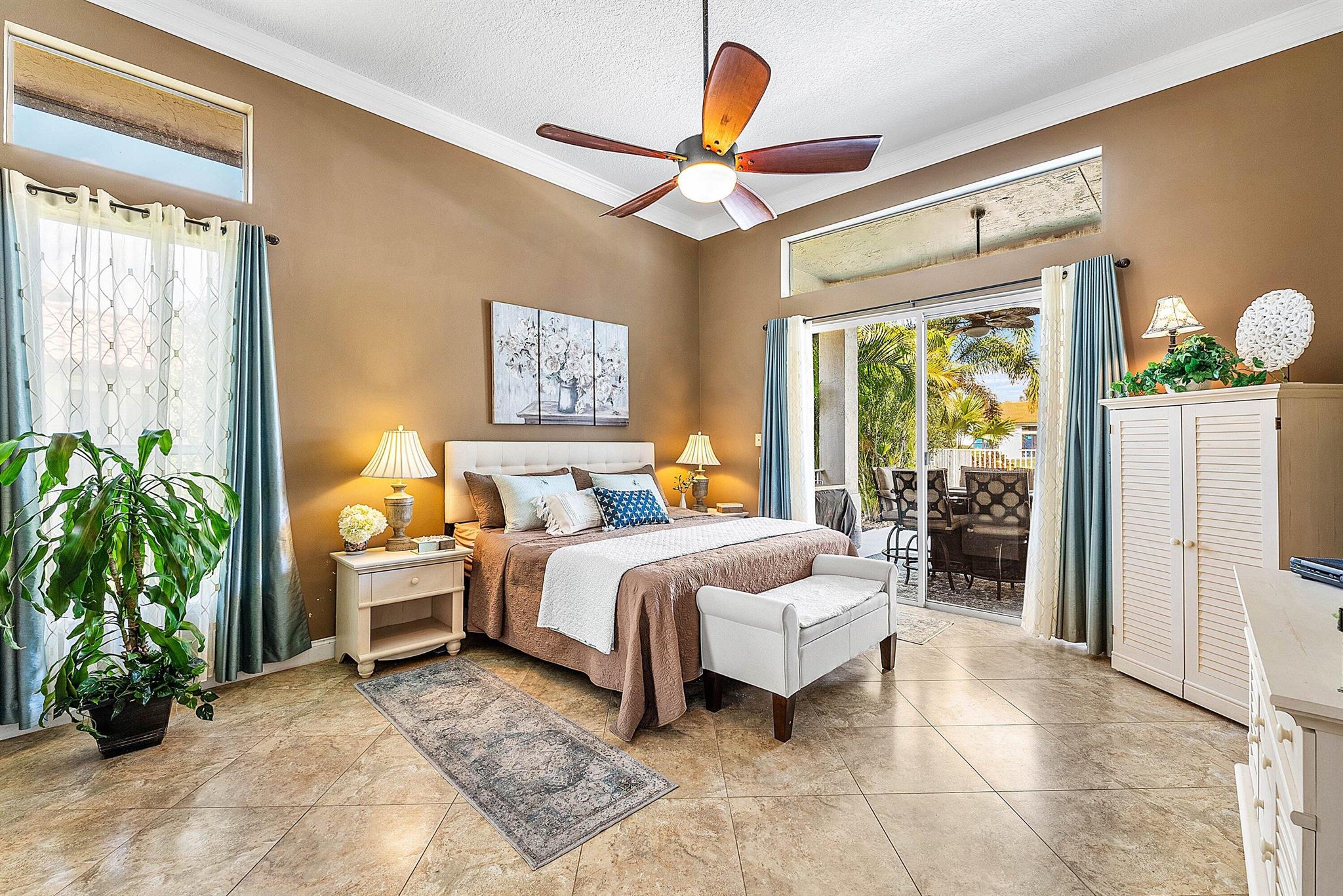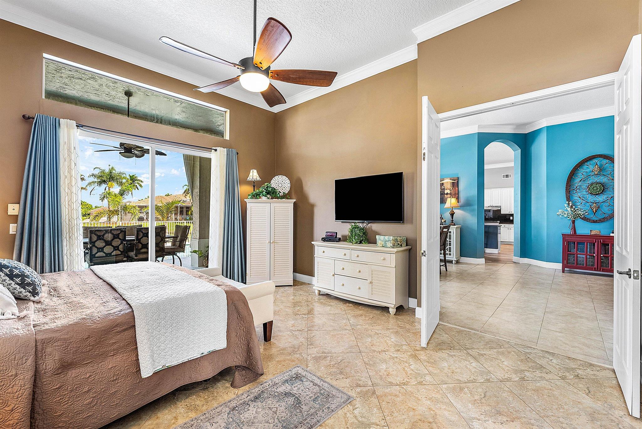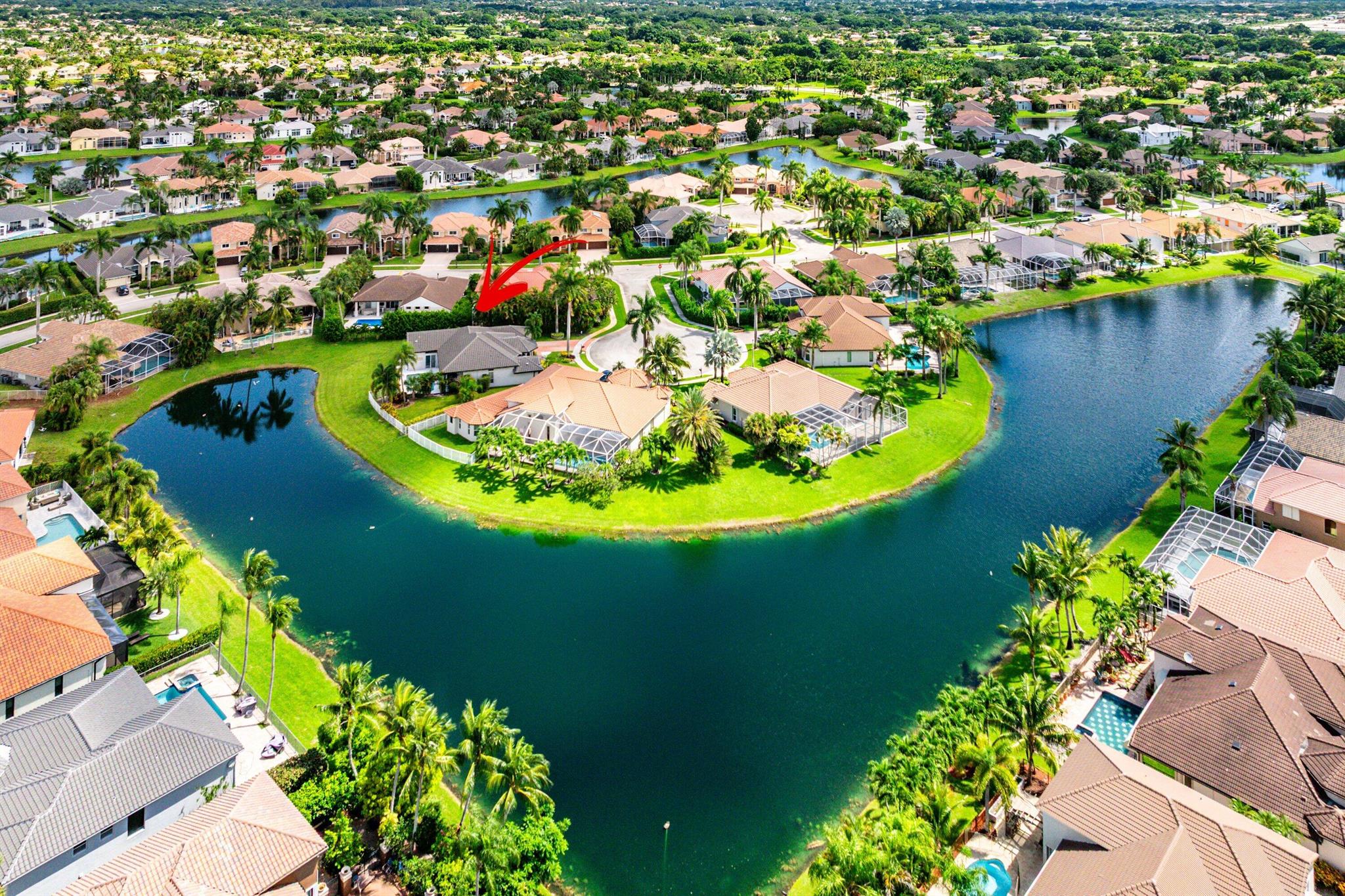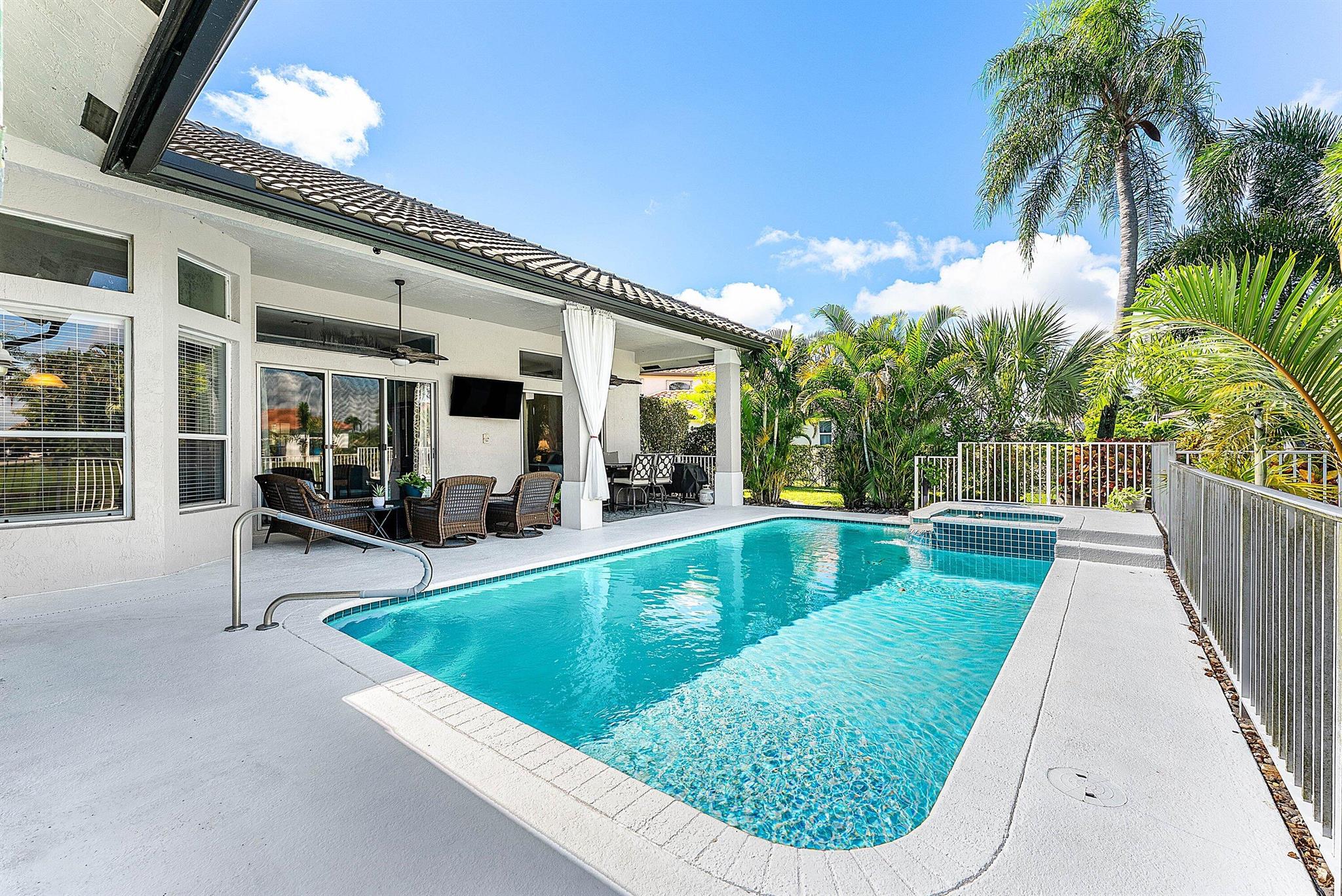 Opportunity to own this popular Cayman V model on highly sought-after oversized, pie-shaped cul-de-sac lakefront lot in gated community. Welcoming double door entry. Volume ceilings, and many updated features throughout the home, roof 2022 - come see! Spacious primary suite opening to upgraded pool and spa, adjacent bedroom can serve as study w/three more bedrooms on the other side. Generously-sized kitchen overlooks spacious family room with breakfast nook - great view of the pool! Expansive covered patio, perfect for relaxing while enjoying the stunning views of the lakefront. Convenient cabana bath. This gated community offers many amenities, including clubhouse with many activities: fitness center, resort-style pool and spa, playground, tennis and basketball courts.