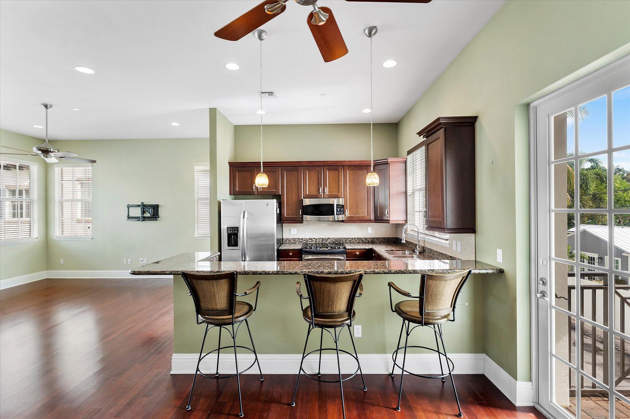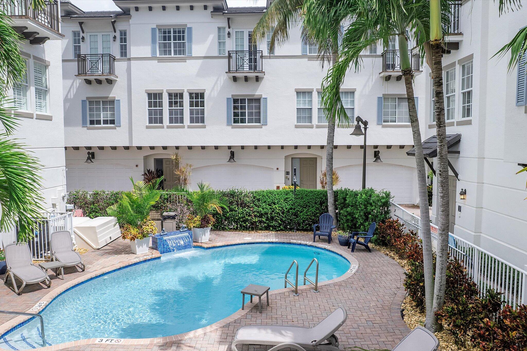 Enjoy the ultimate Delray Beach lifestyle in this beautifully maintained end-unit townhouse, ideally located minutes from Atlantic Avenue's vibrant dining, boutiques, and the beach. As a coveted corner residence, the home is filled with natural light from an abundance of windows and offers rare features not found in other units--including three private balconies, one conveniently located off the kitchen for grilling, and the only second-floor balcony in the community. Overlooking the resort-style pool with its tranquil waterfall, this home blends elegance with ease. The first floor features rich cherry wood flooring, a spacious laundry room, and an oversized garage.