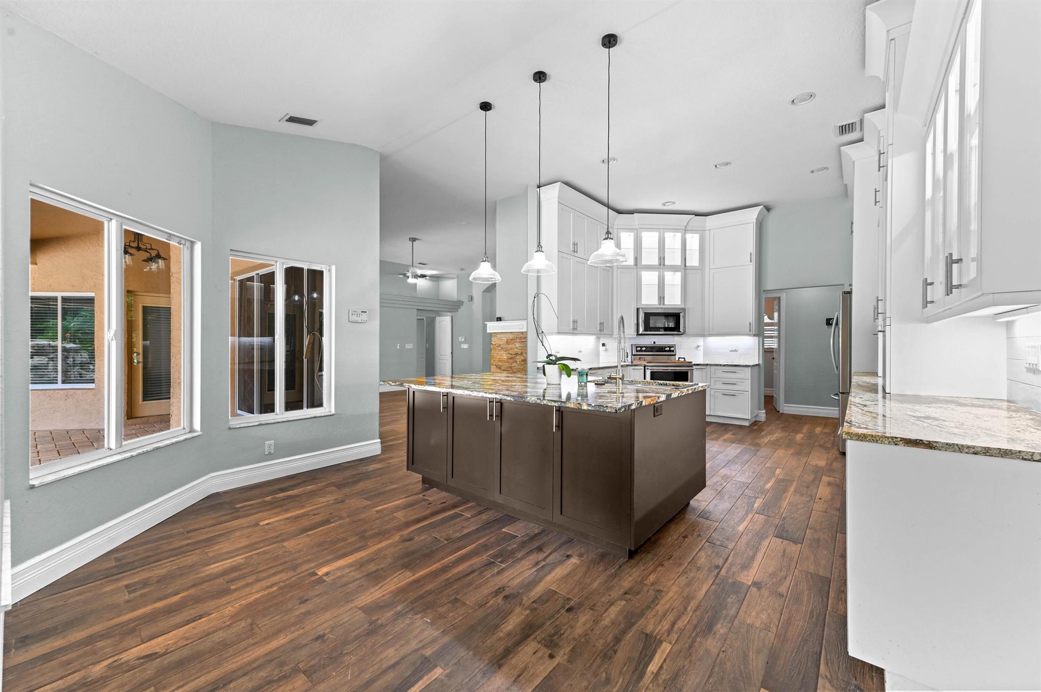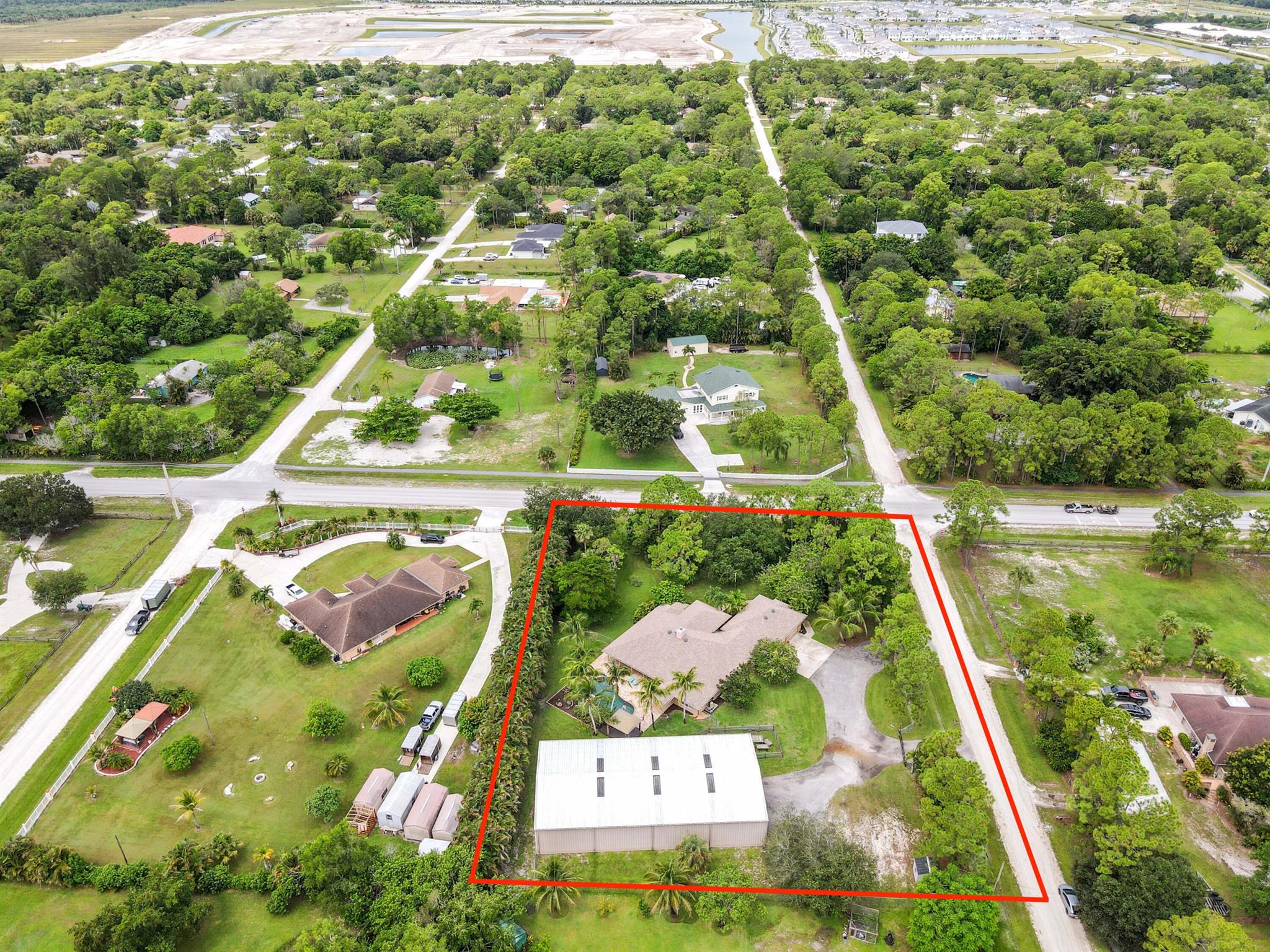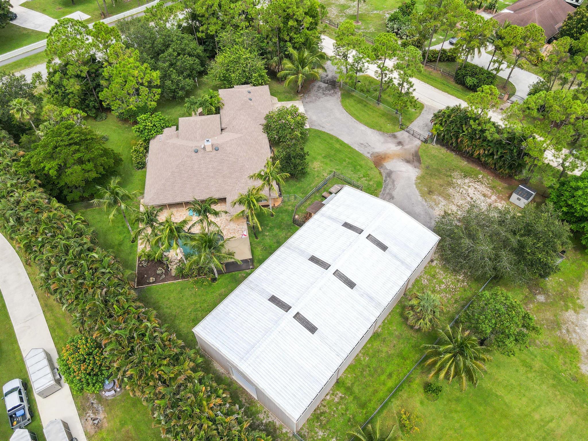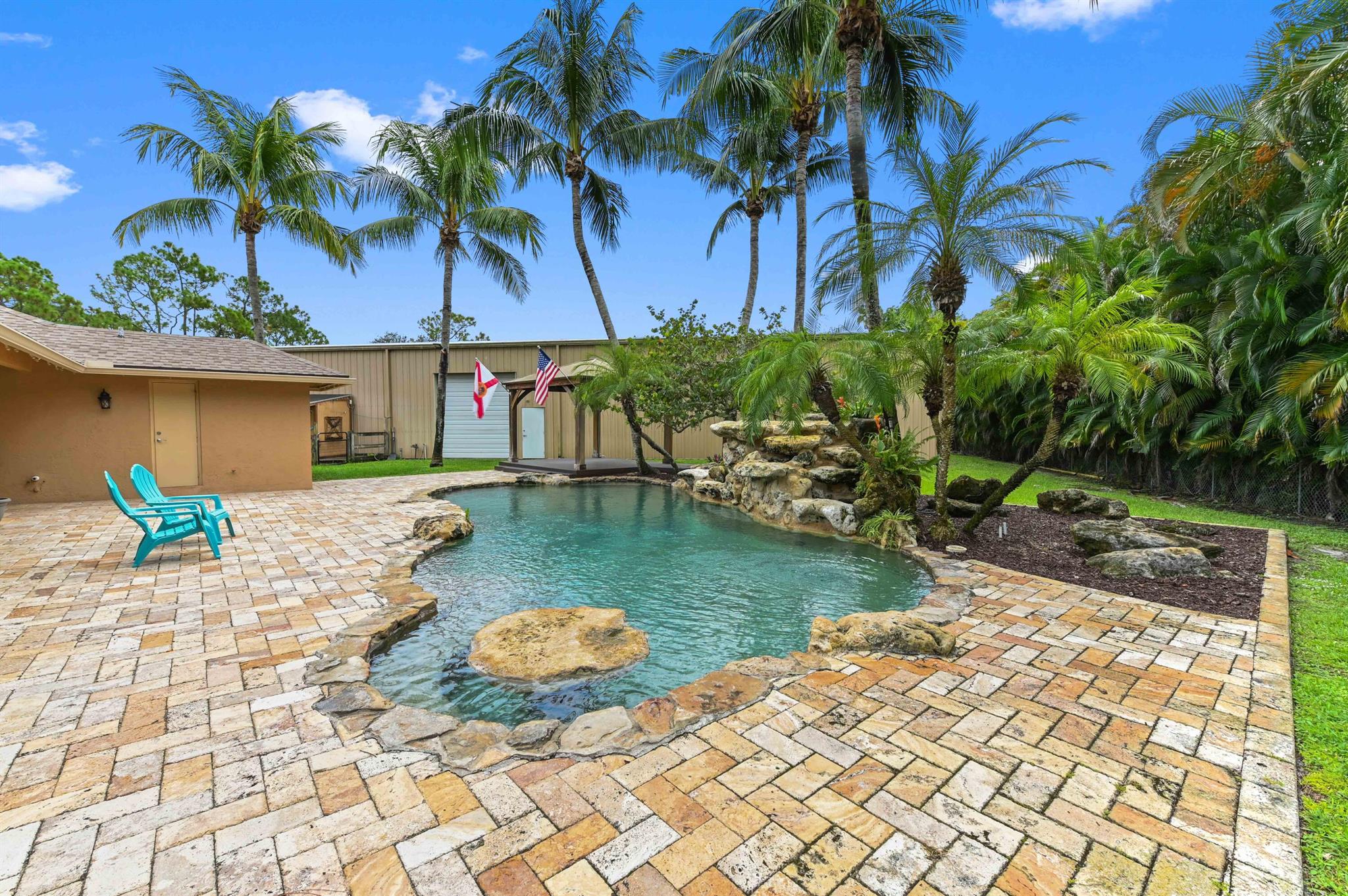 Welcome to this incredible single-family pool home with an oversized attached garage & a huge detached 5,000 sq ft garage/workshop, a true masterpiece of space and serenity, perfectly situated on a prime corner lot spanning 1.75 acres in The Acreage. With a new roof (2023) and no HOA to contend with, you'll enjoy peace of mind along with unparalleled freedom and privacy. This residence features 4 bedrooms and 3 full bathrooms, meticulously designed to offer both comfort and elegance. The spacious and open living area serves as the heart of the home, complete with a cozy fireplace and a sliding door that provides seamless access to the patio.