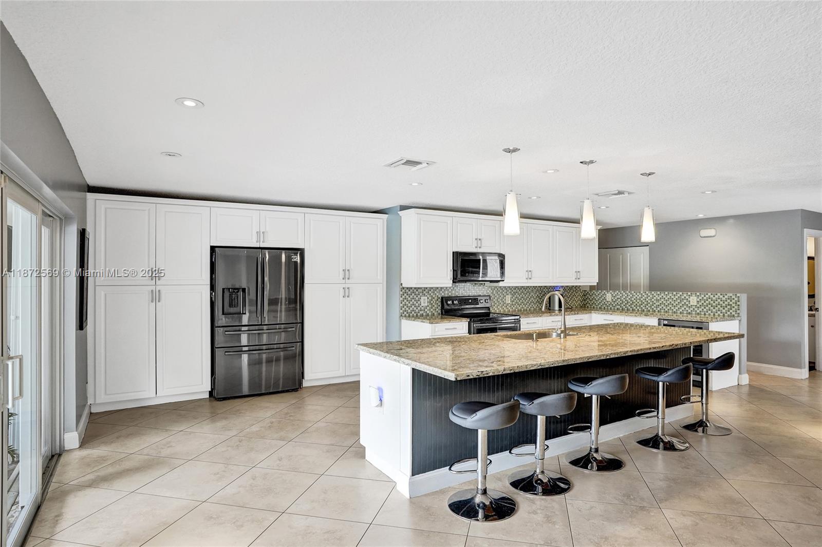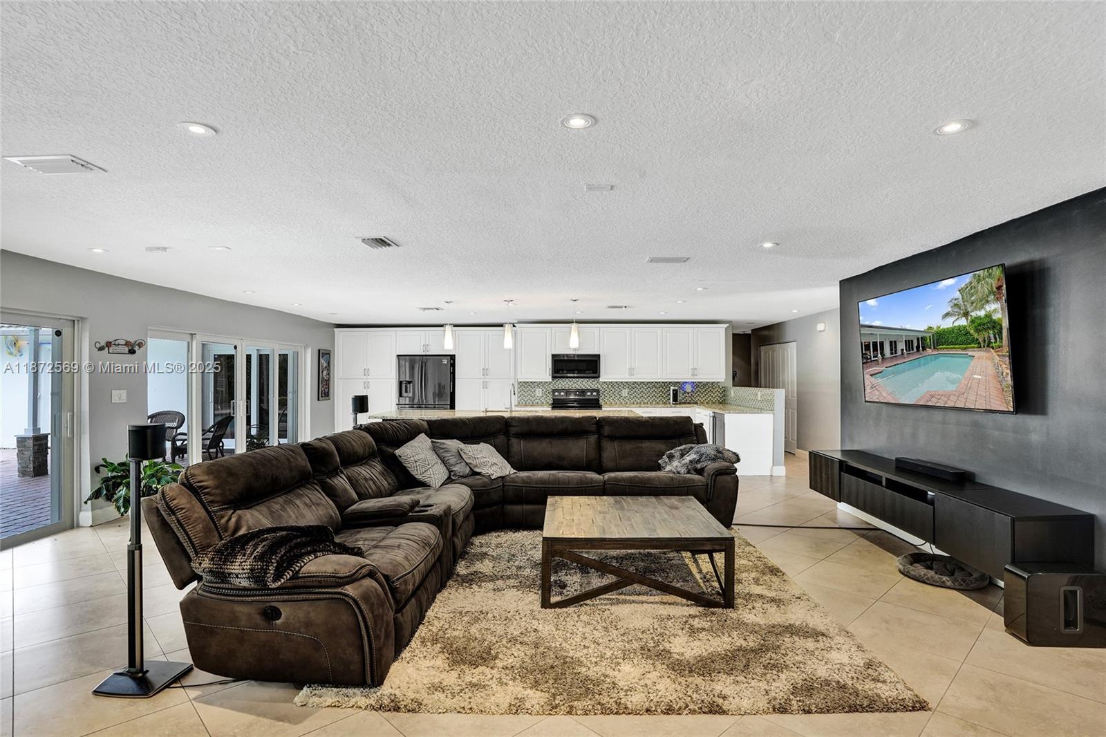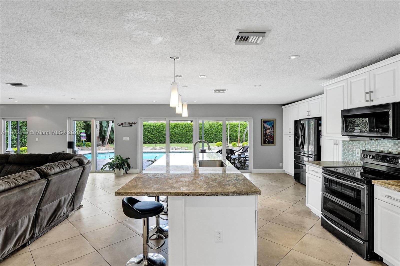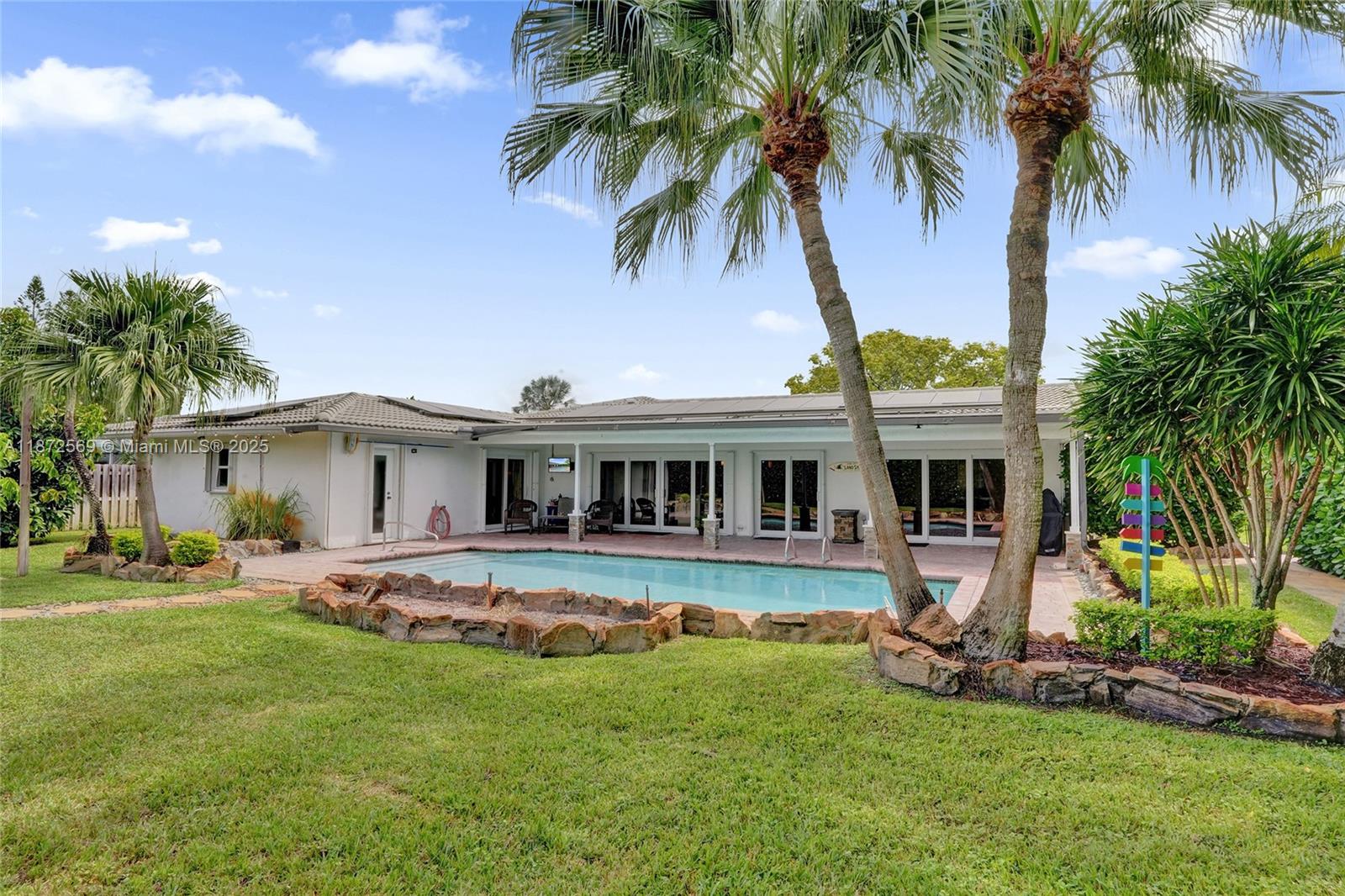 Welcome to your private oasis! This stunning 5 bedroom, 2.5 bath home features an updated open-concept kitchen, expansive living area, perfect for entertaining or relaxing. The huge primary bedroom boasts a walk-in closet and serene pool views, while both bathrooms are upgraded. Main areas shine w/tile flooring & bedrooms feature high quality laminate. Step outside to a backyard paradise w/a large covered patio, sparkling pool & lush greenery. A concrete slab is ideal for a tiki bar or shed in the back as well. Accordion shutters throughout, AC 2021, washer & dryer 2020, water heater 2022 & electrical panel 2024. This home combines beauty, comfort & peace of mind. Centrally located near top schools, restaurants, shops & highways. Solar panels may stay or go! Truly a must see!