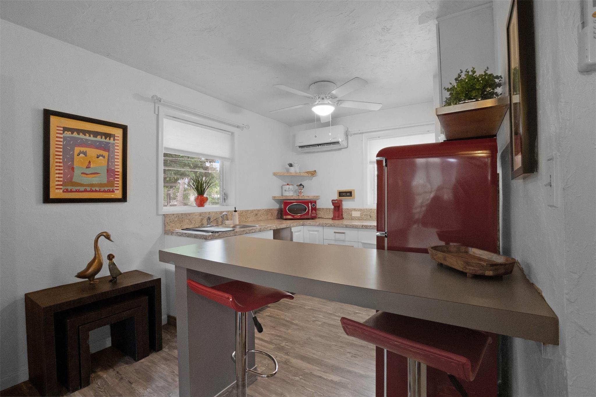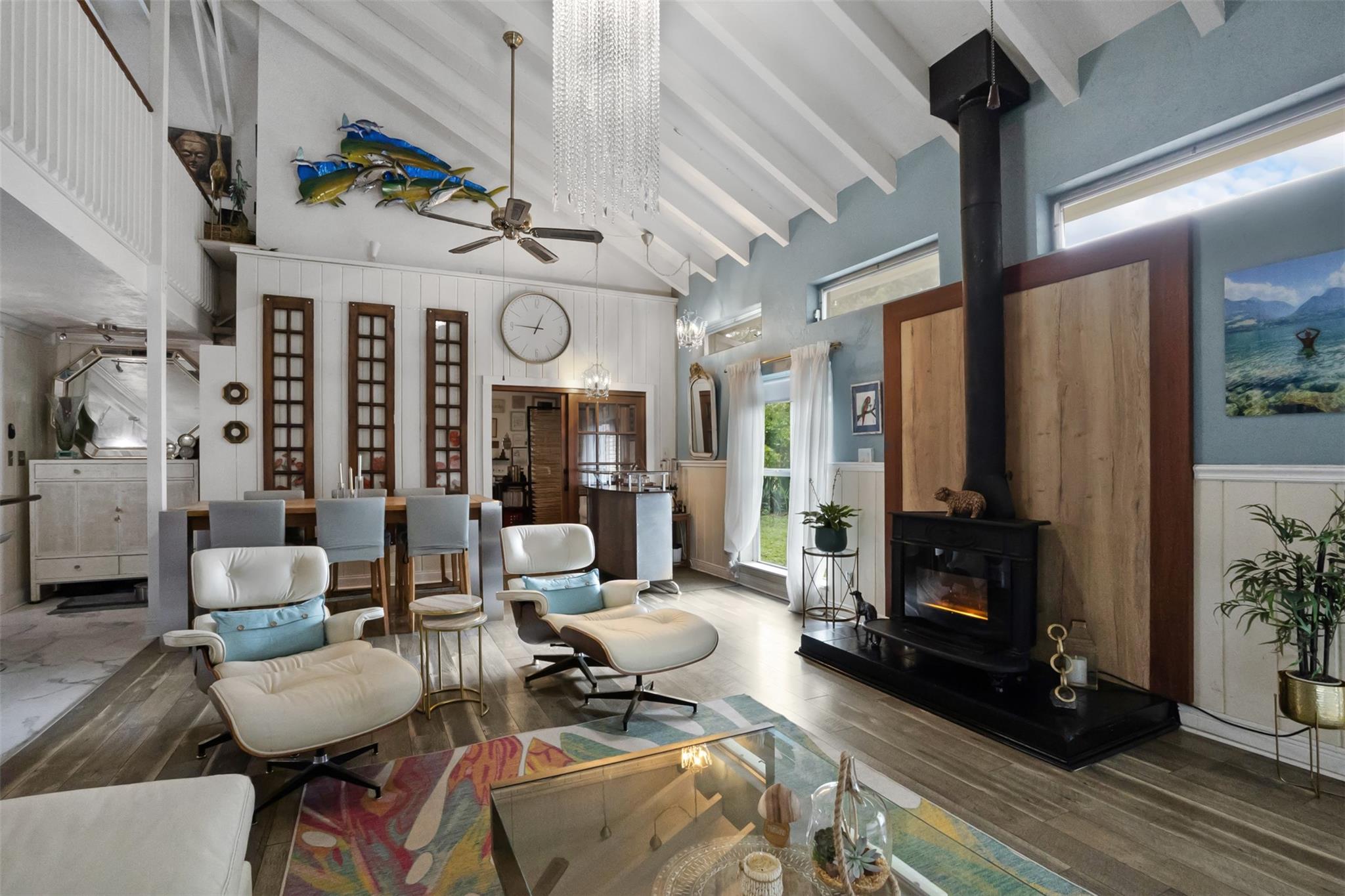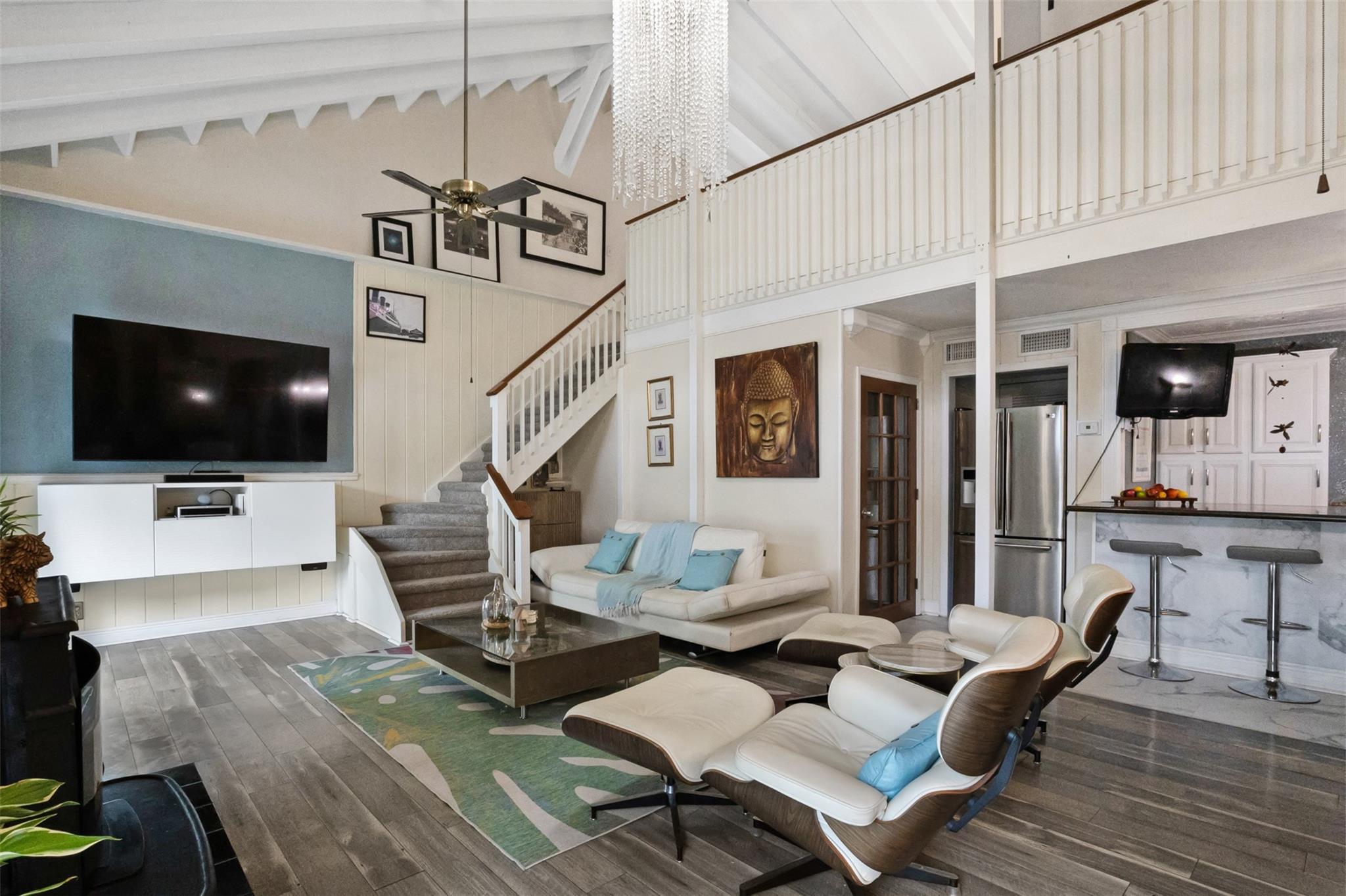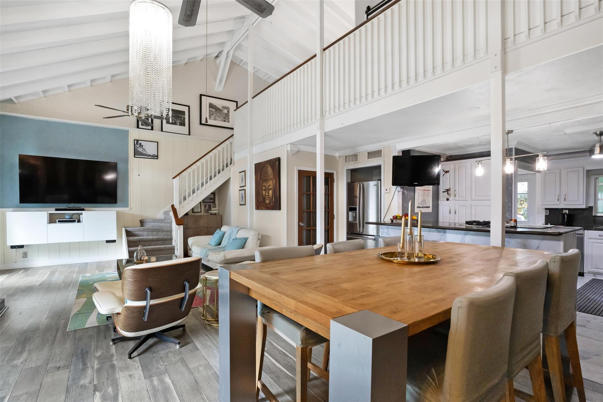 Endless Possibilities. Unique family home provides multiple living scenarios. Main residence has open remodeled white kitchen with countertops and back splash. Newer stainless steel appliances. Romantic fireplace. Island bar & countertop. Very high vaulted ceilings lead to large loft master bedroom with spacious closet remodeled master bedroom. Outdoor second story private patio off master. In-laws one bedroom suite (easily becomes 2 BDR) completely remodeled bath and kitchen. Large outdoor patio with seating. Rear Quarters has completely remodeled kitchen area& bathroom. Private screened patio & yard. Central Quarters has remodeled kitchen & bathrooms. Two Laundry's. Newer W/D. Use for large family living, investment or short/long terms rentals. NO HOA.