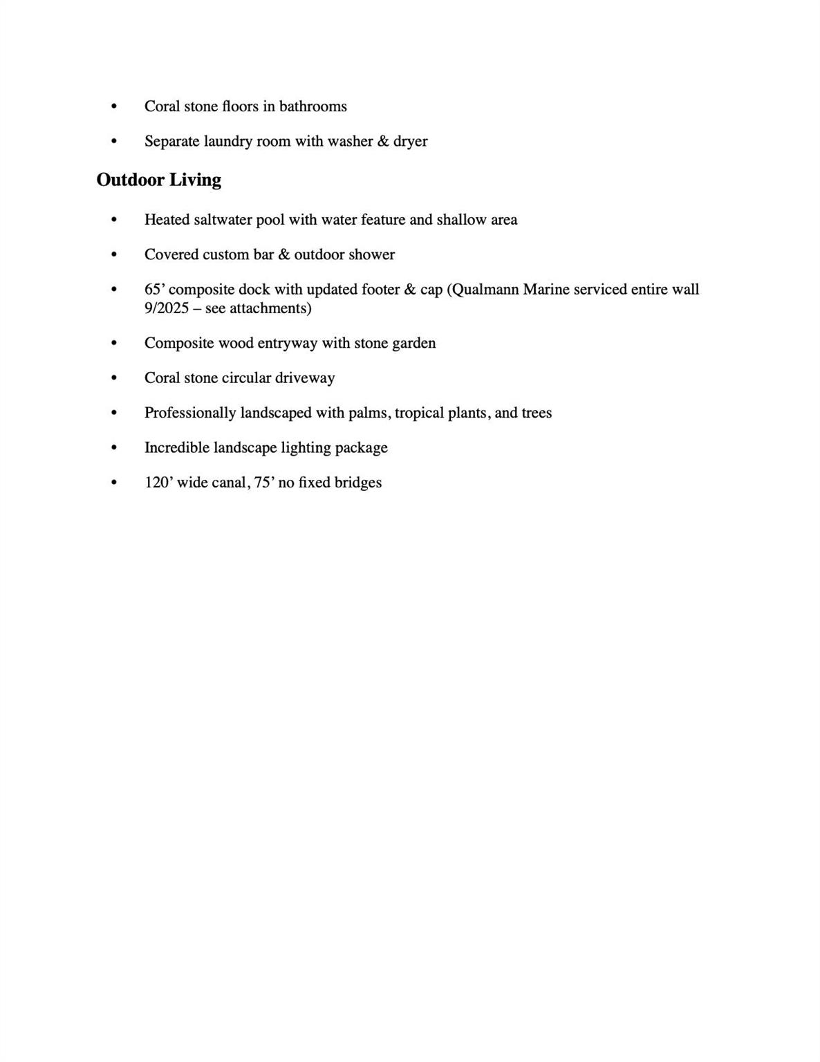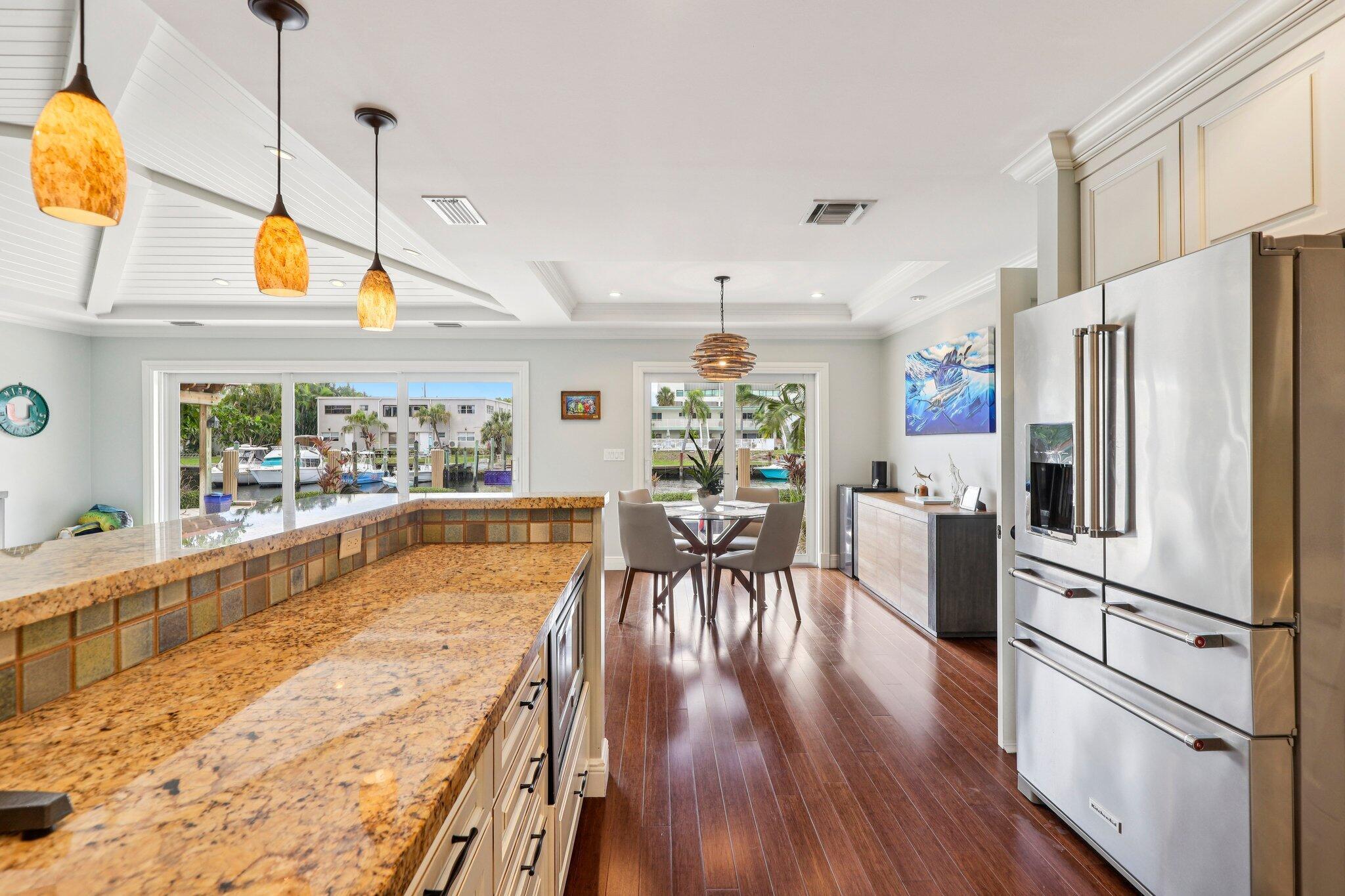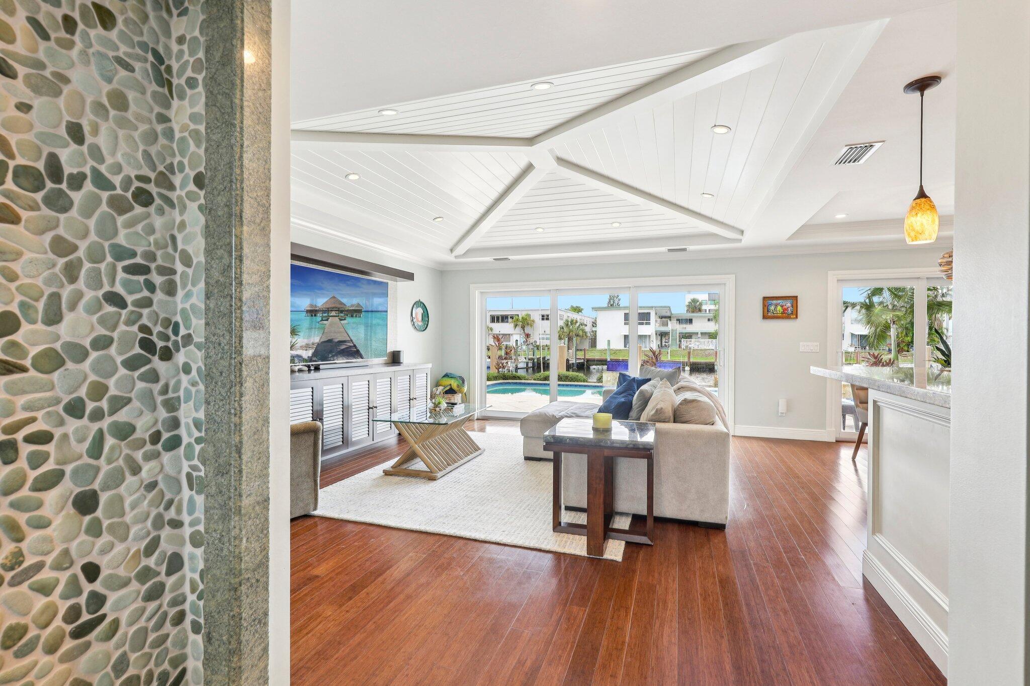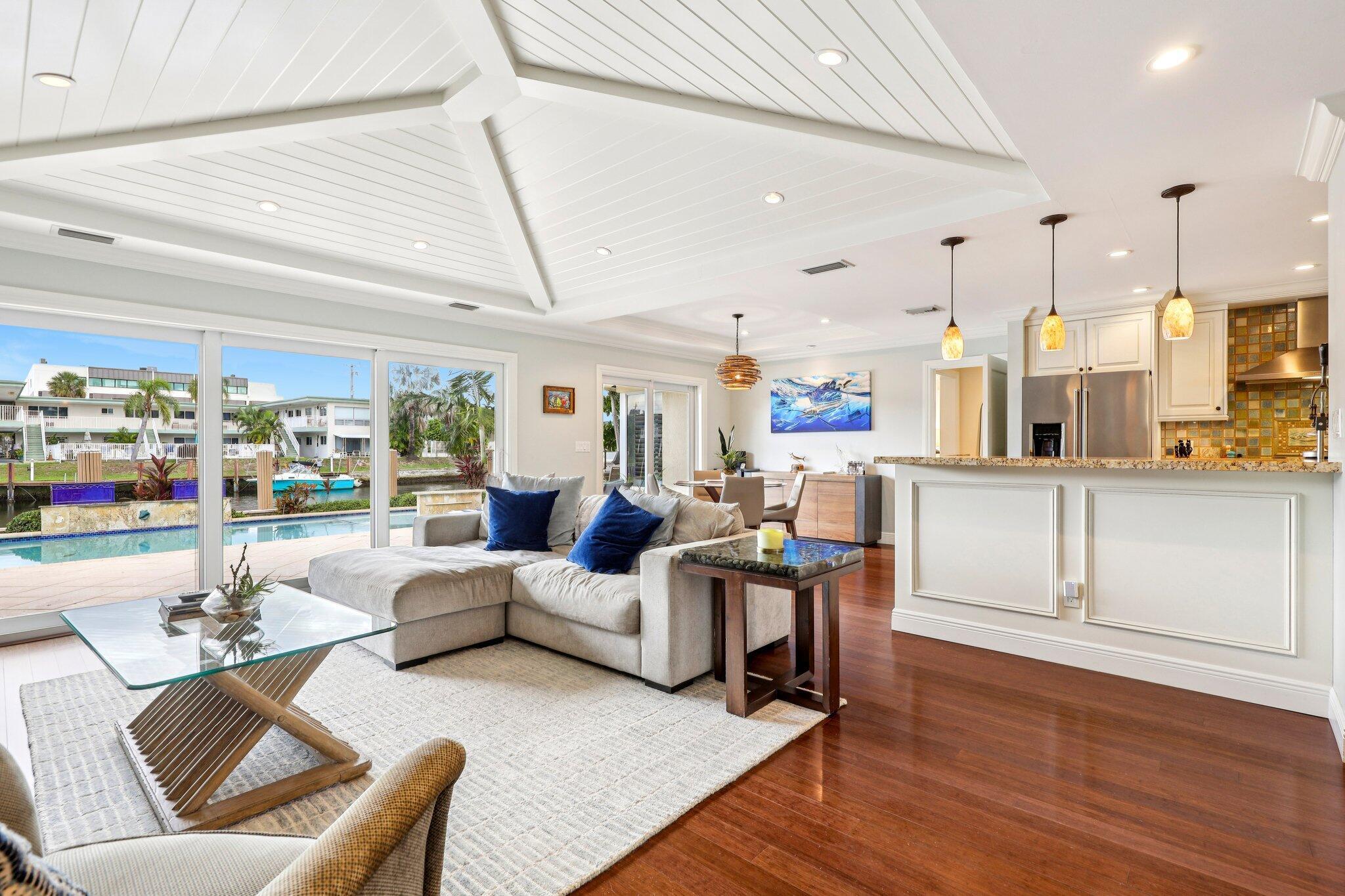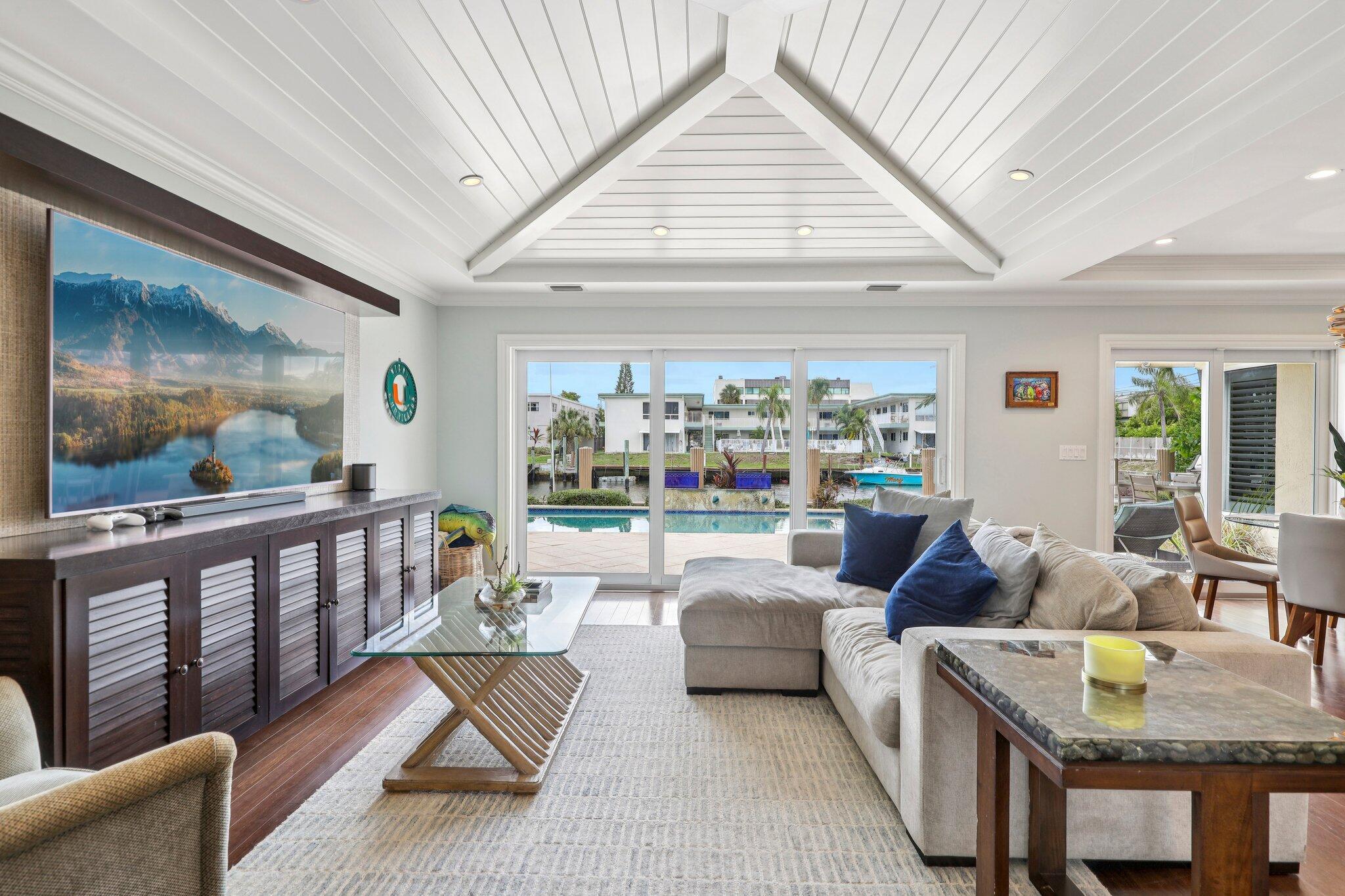 Experience the ultimate in coastal living on a 120' wide southern exposure canal with 75' of premier no fixed bridge waterfront. The closest block to dining & the beach. This private retreat blends elegance and ease. Professionally designed interior showcases vaulted ceilings w/custom woodwork, custom bar, & an open chef's kitchen with breakfast bar, gas cooking, and new stainless appliances (2023). The split floor plan creates seamless flow for living and entertaining. Outdoors, lush landscaping frames a heated saltwater pool, covered bar, and 2021-65' composite dock. Upgrades include AC (2020), Roof, tankless water heater, PVC plumbing, LED lighting, electrical, smart thermostat, and a full-home renovation(2013). Finished with a coral stone drive, incredible landscaping & polished feel.