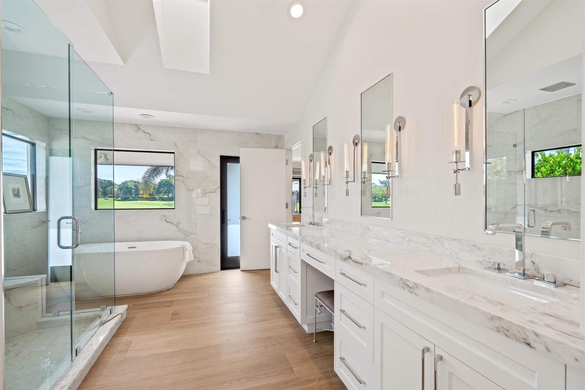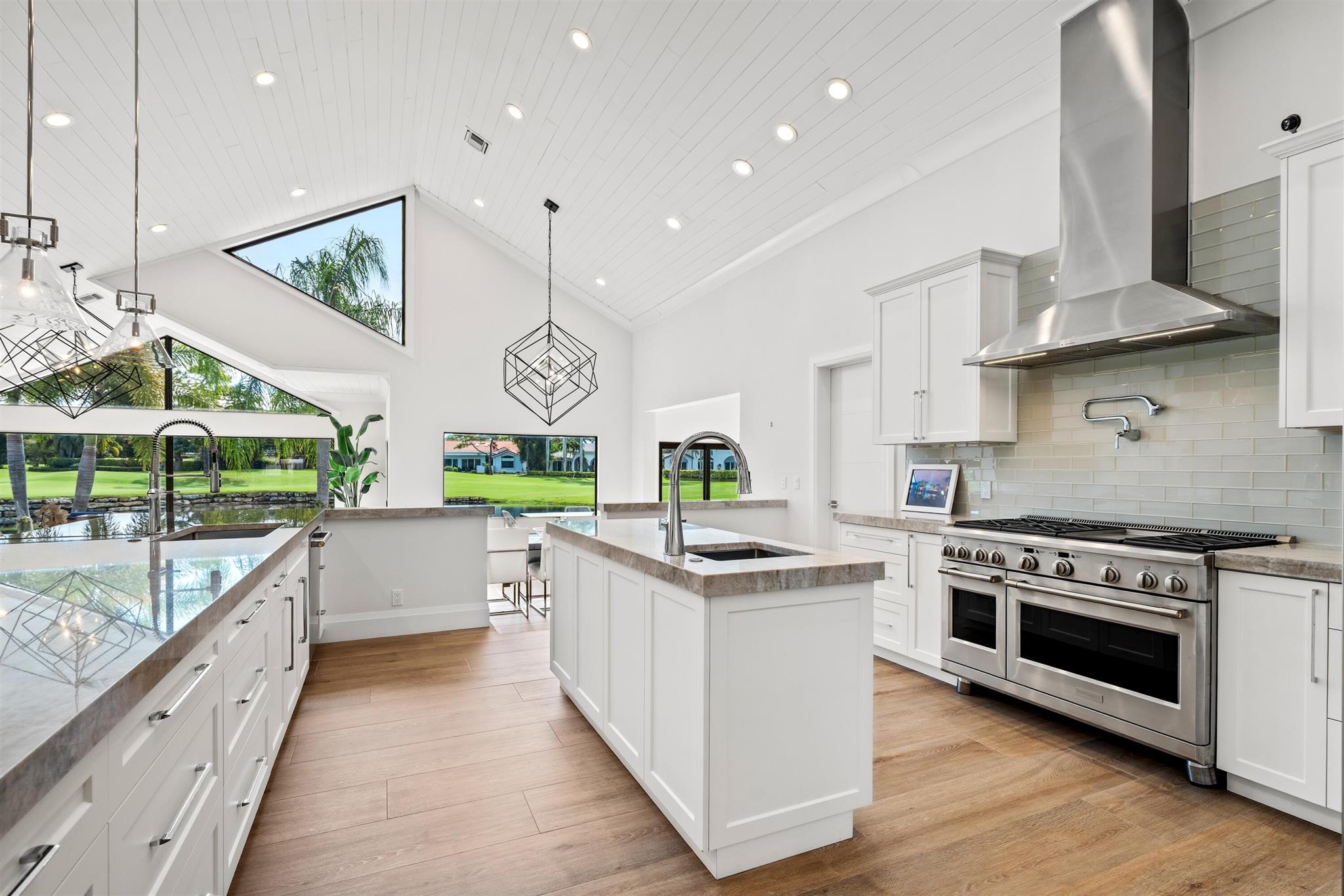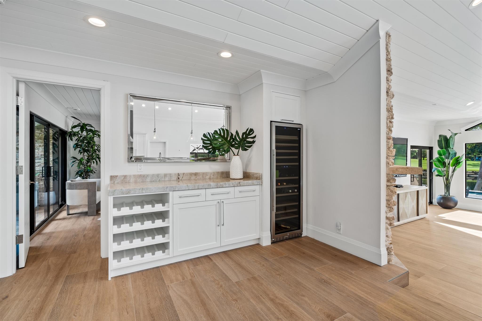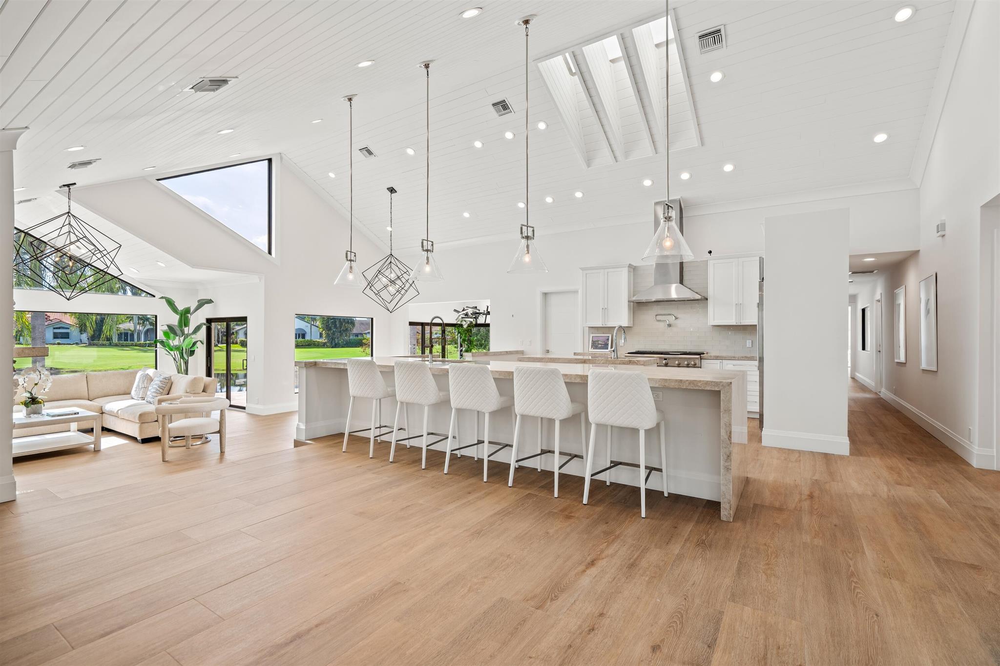 Enveloped within the beauty of its natural setting and defined by luxury, this completely remodeled East Coast style residence captures tranquil panoramic lake and fairway views as well as beautifully manicured fairway vistas from every room. With four bedrooms and spanning 4,714+/- total square feet, details throughout include dramatic tongue-and-groove vaulted ceilings punctuated by skylights, wide-plank washed-oak imported porcelain flooring, and window-walls of impact glass throughout. From the double-door entry, an inviting lounge, with a built-in bar topped by quartzite and featuring a refrigerated wine tower, introduces the dramatic open-floorplan living area of this spectacular residence. The chic great room features tongue and grooved wood vaulted ceiling, a wood-burning