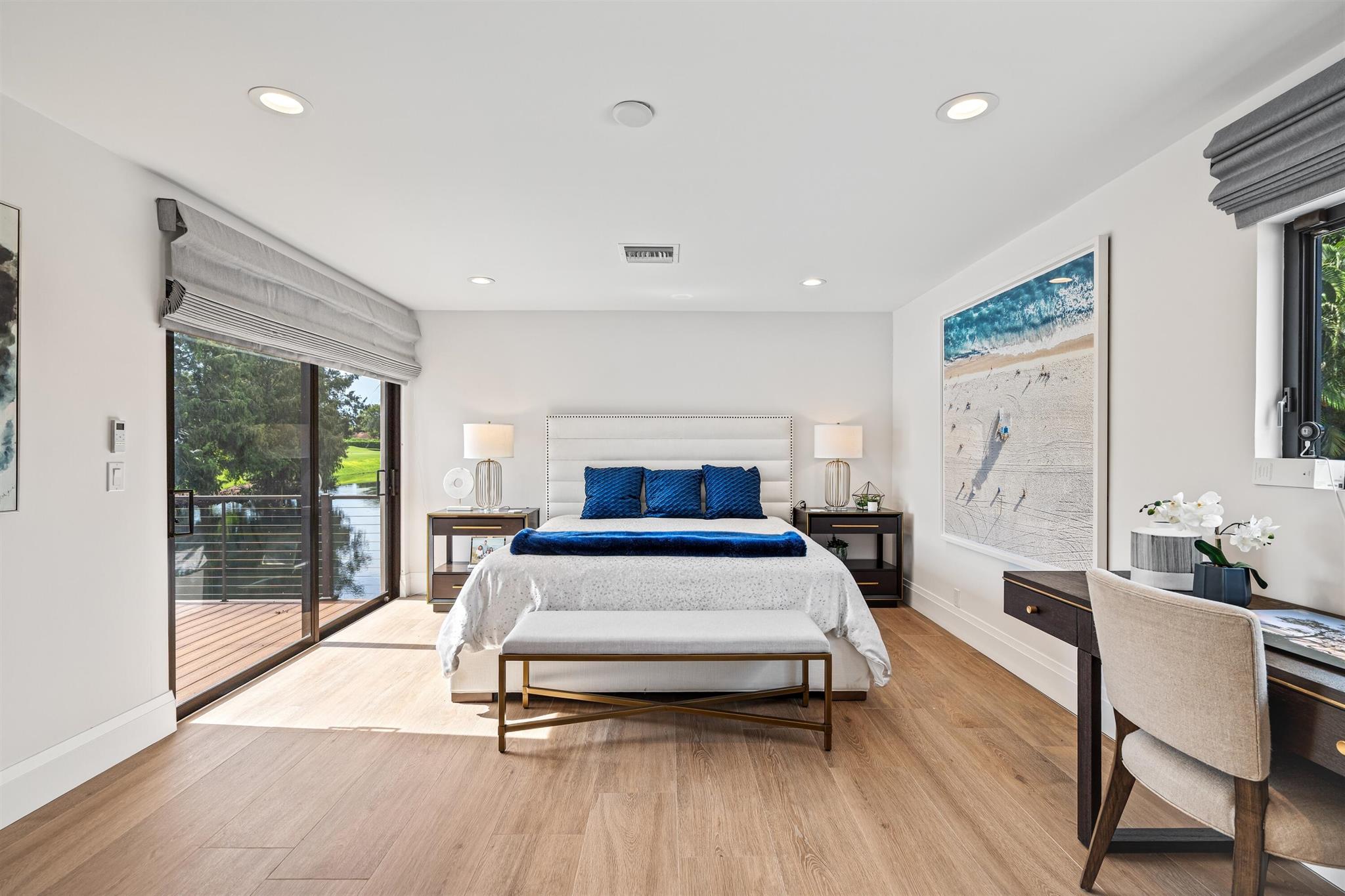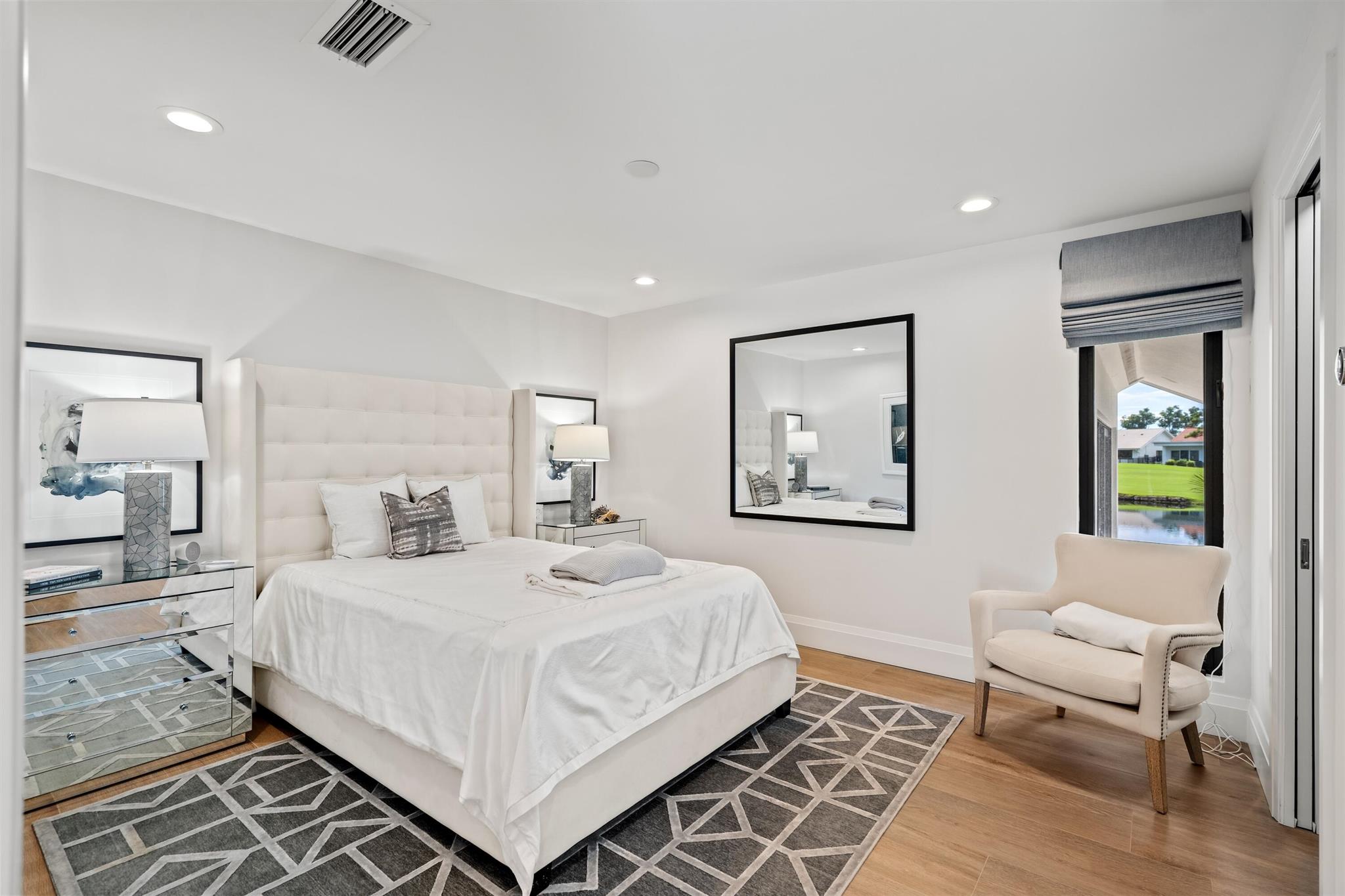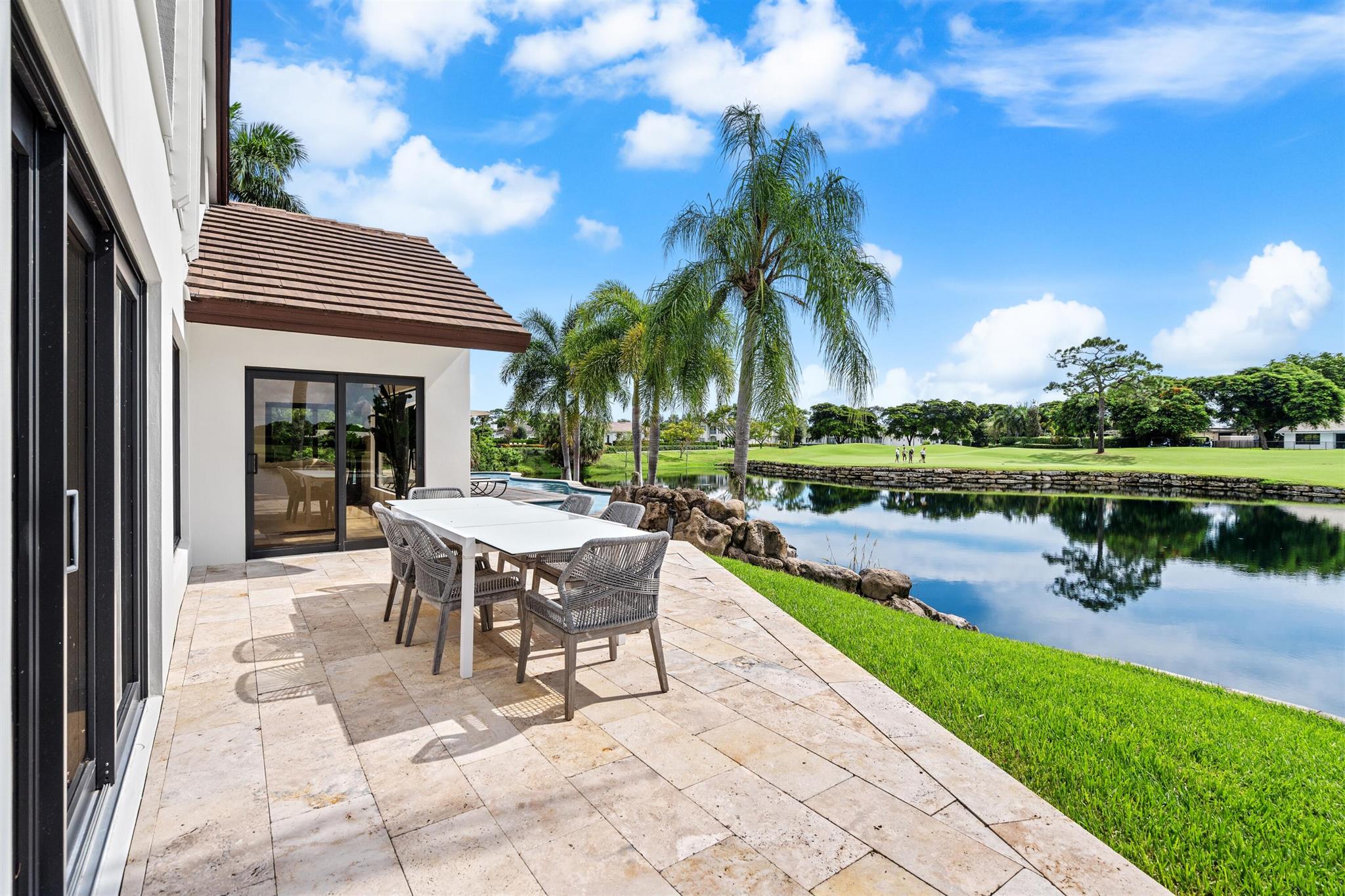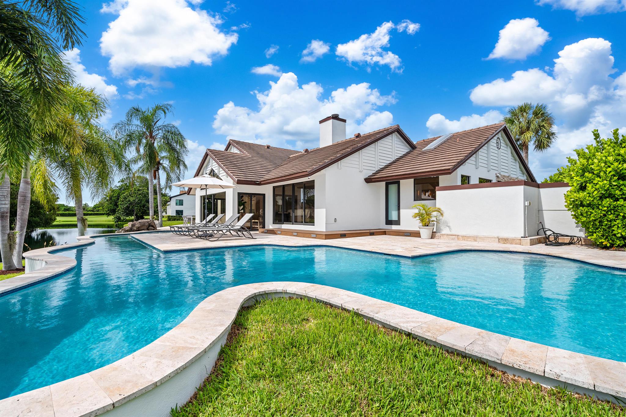 Enveloped within the beauty of its natural setting and defined by luxury, this completely remodeled East Coast style residence captures tranquil panoramic lake and fairway views as well as beautifully manicured fairway vistas from every room. With four bedrooms and spanning 4,714+/- total square feet, details throughout include dramatic tongue-and-groove vaulted ceilings punctuated by skylights, wide-plank washed-oak imported porcelain flooring, and window-walls of impact glass throughout. From the double-door entry, an inviting lounge, with a built-in bar topped by quartzite and featuring a refrigerated wine tower, introduces the dramatic open-floorplan living area of this spectacular residence. The chic great room features tongue and grooved wood vaulted ceiling, a wood-burning