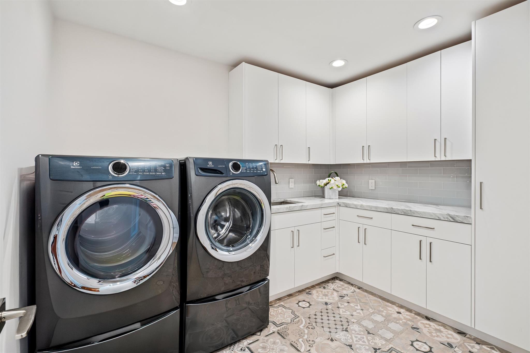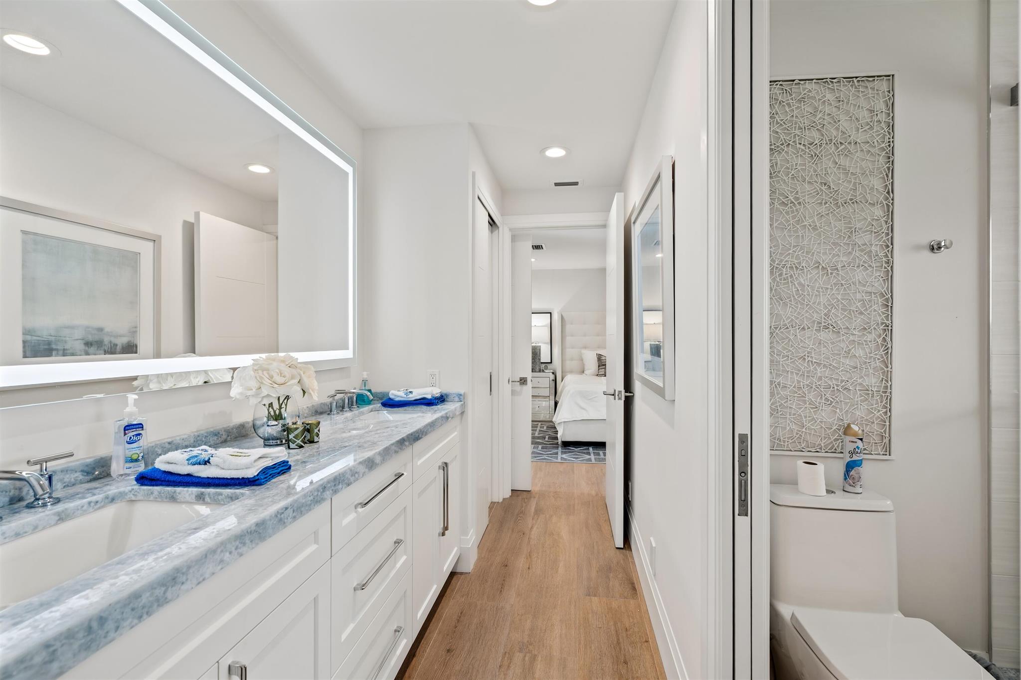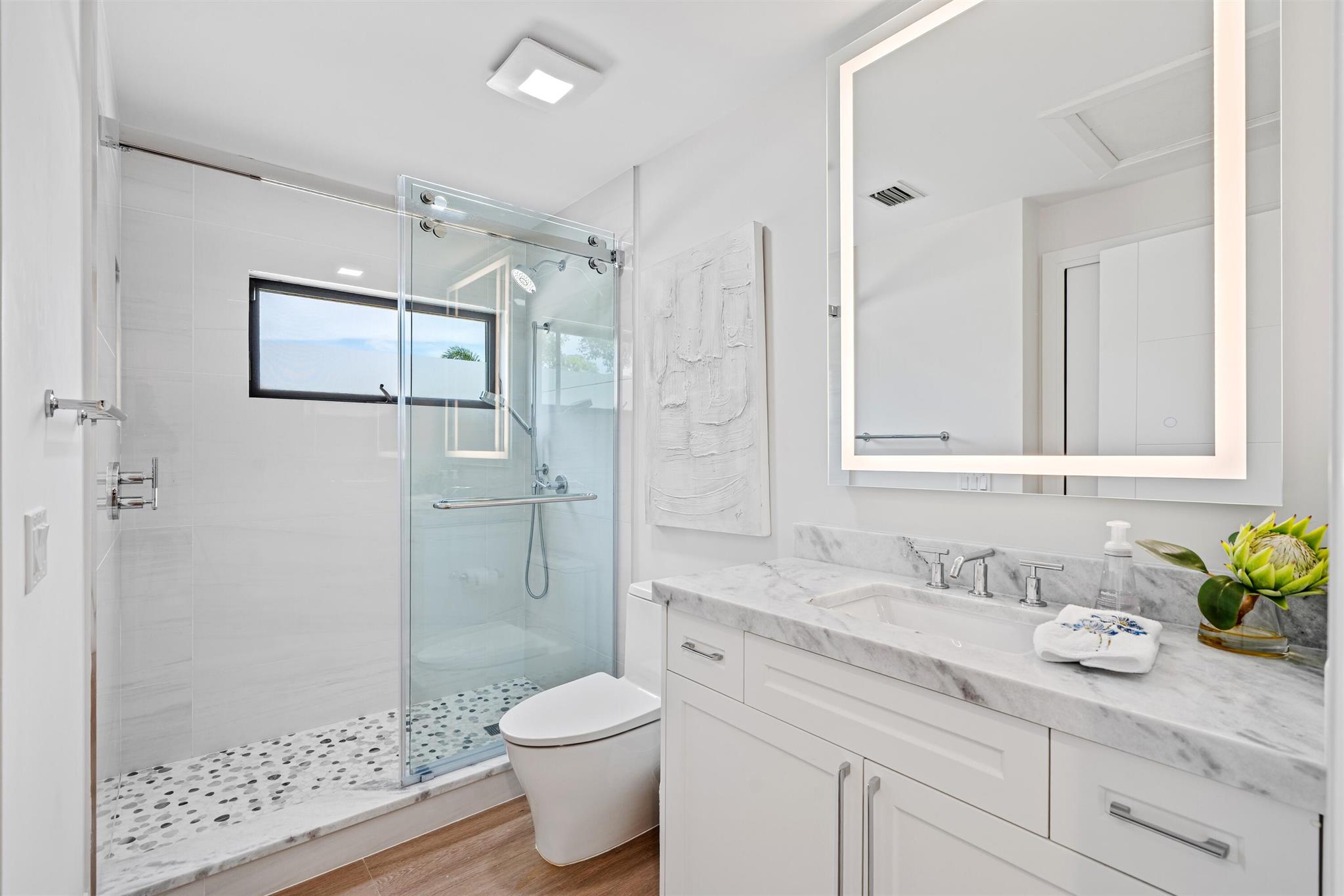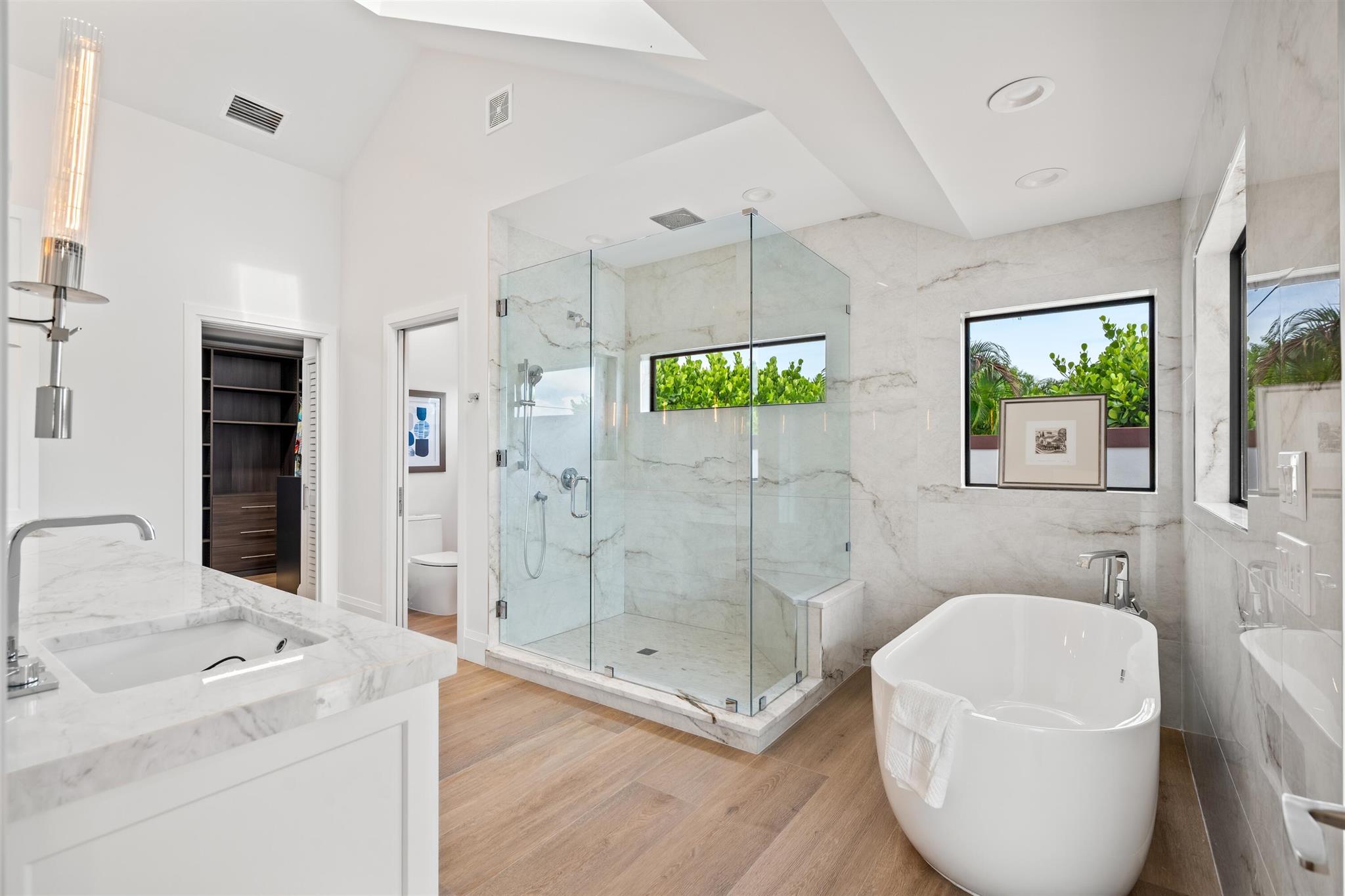 Enveloped within the beauty of its natural setting and defined by luxury, this completely remodeled East Coast style residence captures tranquil panoramic lake and fairway views as well as beautifully manicured fairway vistas from every room. With four bedrooms and spanning 4,714+/- total square feet, details throughout include dramatic tongue-and-groove vaulted ceilings punctuated by skylights, wide-plank washed-oak imported porcelain flooring, and window-walls of impact glass throughout. From the double-door entry, an inviting lounge, with a built-in bar topped by quartzite and featuring a refrigerated wine tower, introduces the dramatic open-floorplan living area of this spectacular residence. The chic great room features tongue and grooved wood vaulted ceiling, a wood-burning
