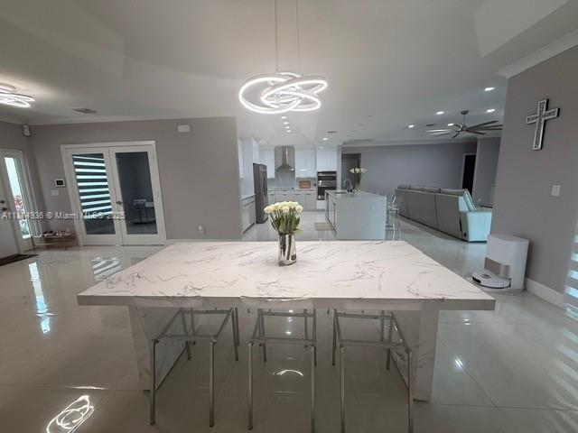 2025 Spacious 5-bedroom, 3-bath home with office and den/family room. with a 5V metal roof, impact windows/doors, and fenced yard. The kitchen and laundry feature 42'' high cabinets, quartz countertops, and a glass backsplash. Porcelain tile enhances main areas; Crown molding, baseboards, and a luxurious primary suite with walk-in closets, designer shower, and free-standing tub . Includes new kitchen stainless steel appliances. Supersized circular driveway, covered patio, and gutters. Move-in ready!