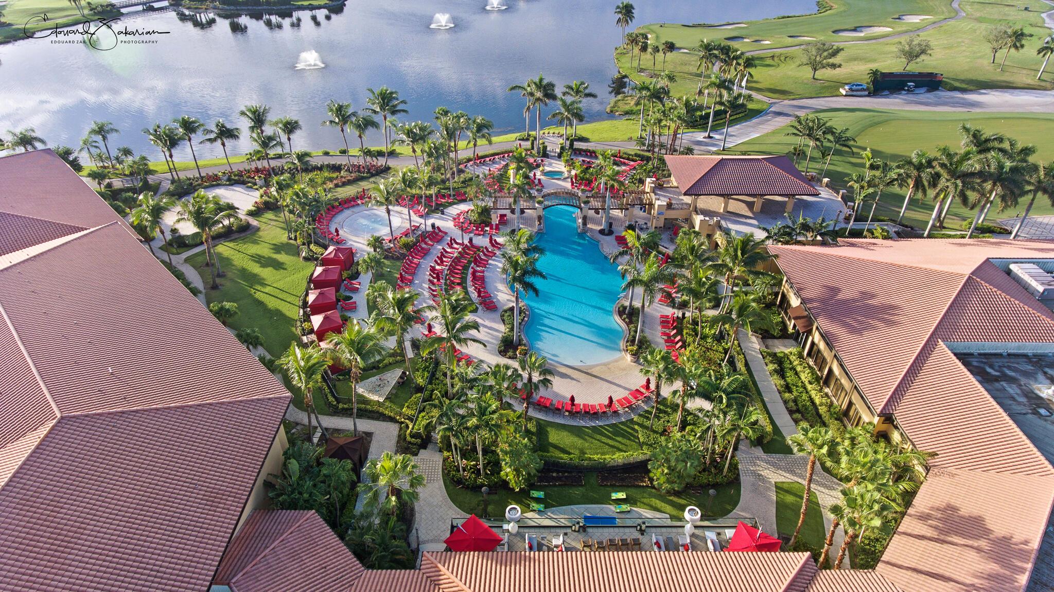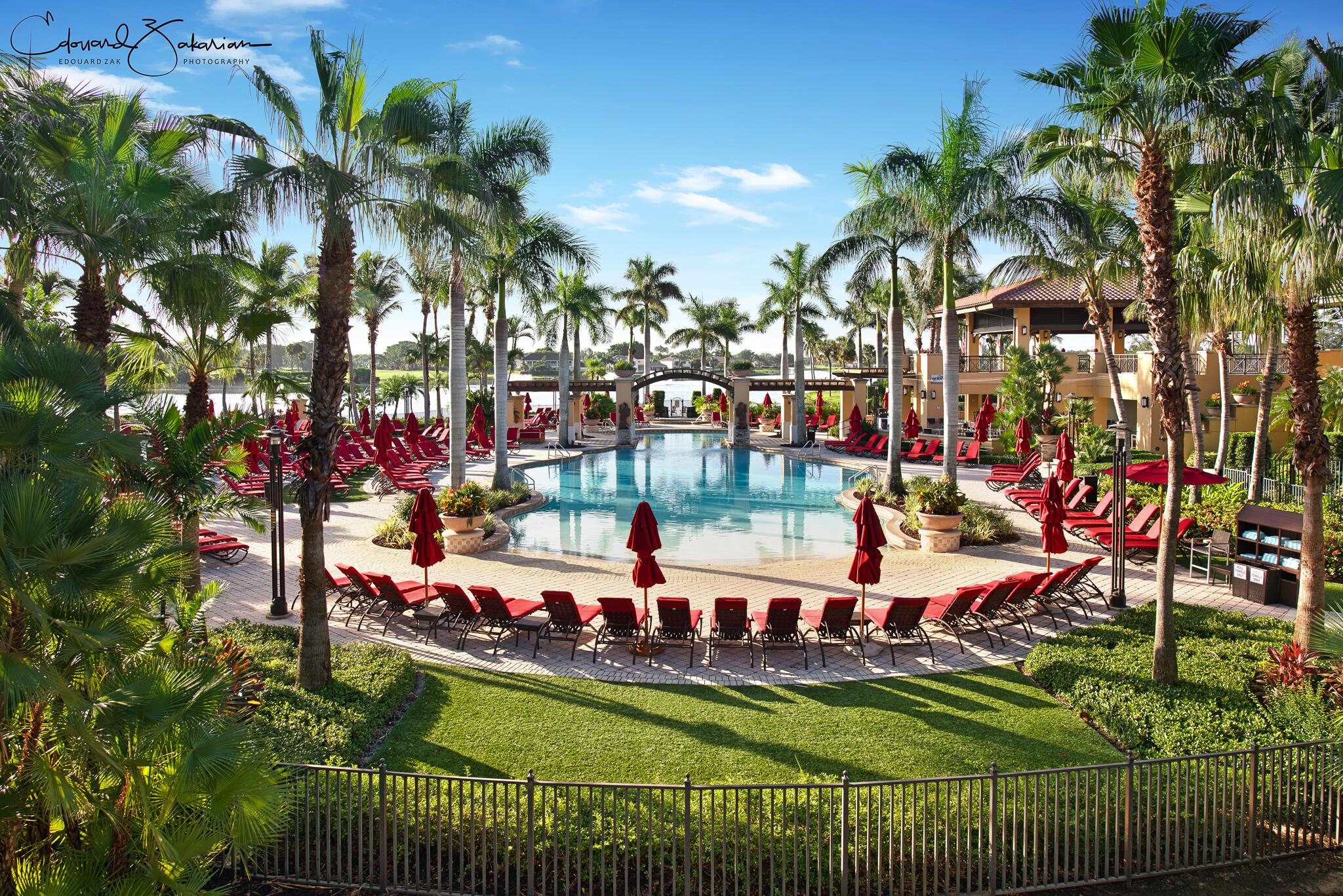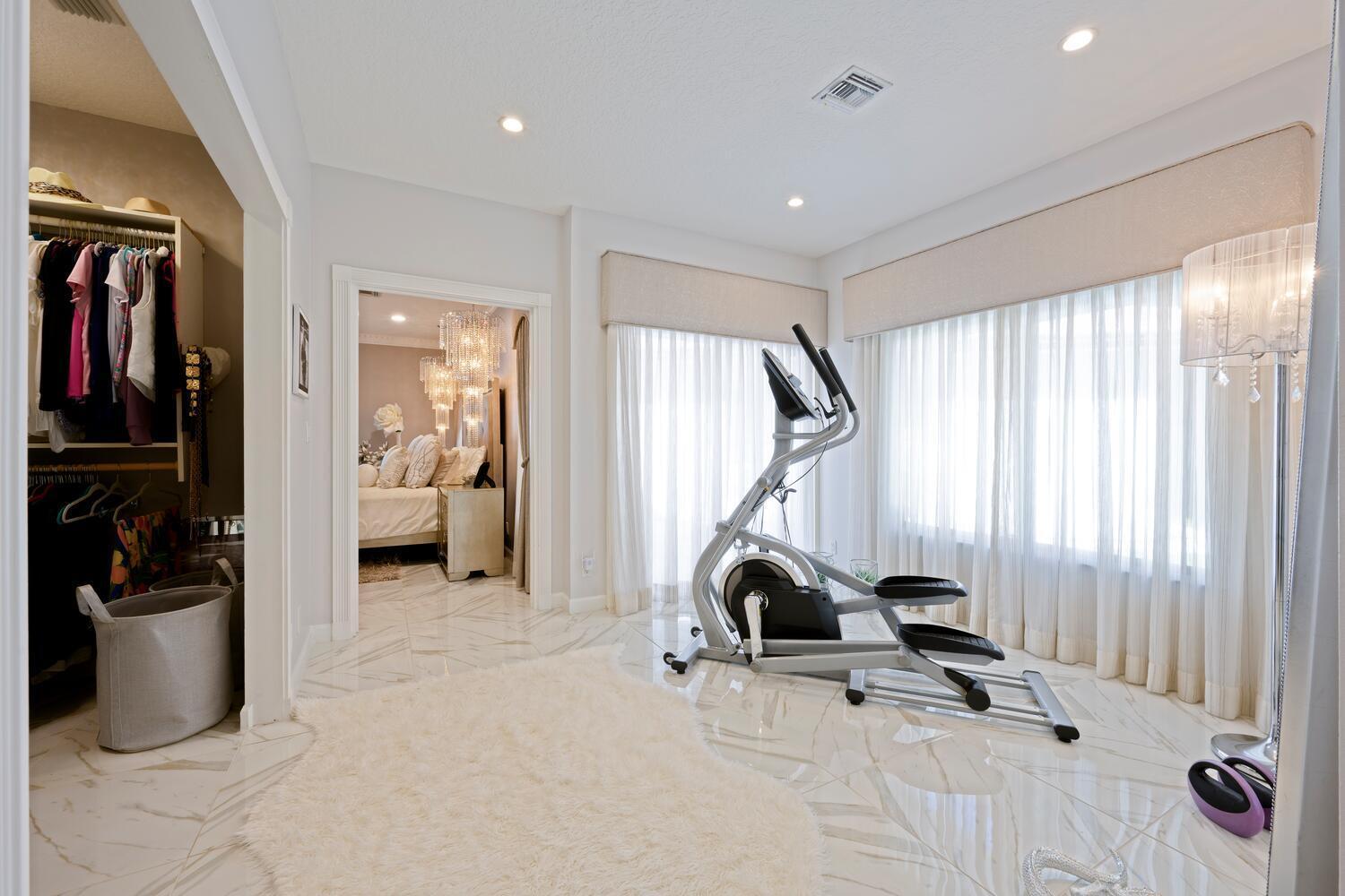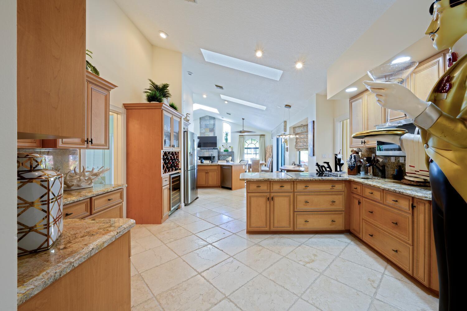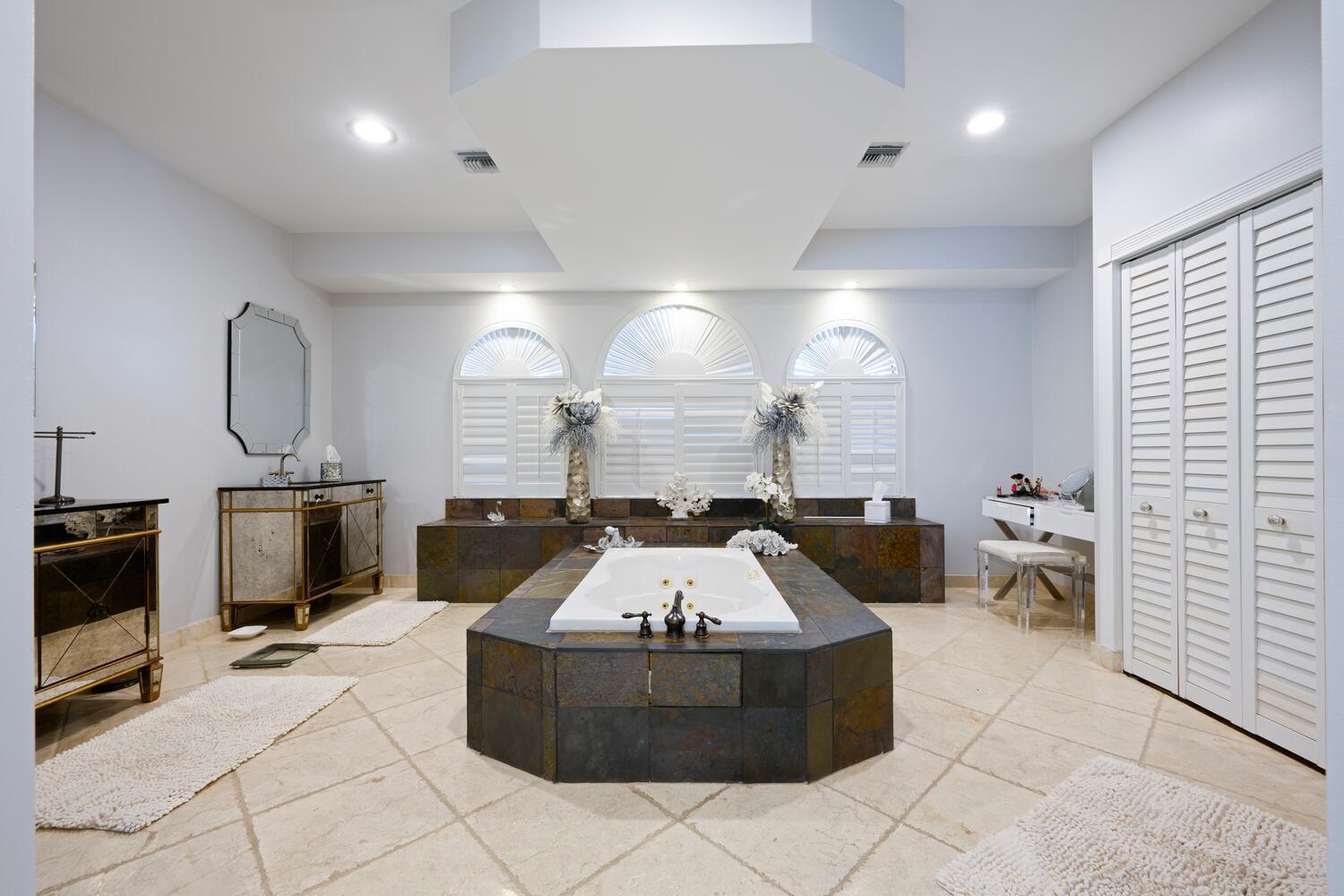 Discover luxury living in the heart of PGA National's prestigious Marlwood. Perfectly situated on the 13th hole of The Match Course, this elegant 5-bedroom, 3 full bath 2 half bath estate (including a private casita) blends timeless design with resort-style amenities offering the ultimate in South Florida living.The main residence features 4 bedrooms, 2 full bath and 2 half baths, with a thoughtfully designed layout ideal for entertaining. A custom wood front door with glass accents welcomes you into marble-clad living spaces, a sunken living room with sliders to the pool, custom wall coverings, designer lighting, recessed lighting, and skylights. A tranquil water feature and artful details, including sculptures that convey, enhance the home's serene ambiance.