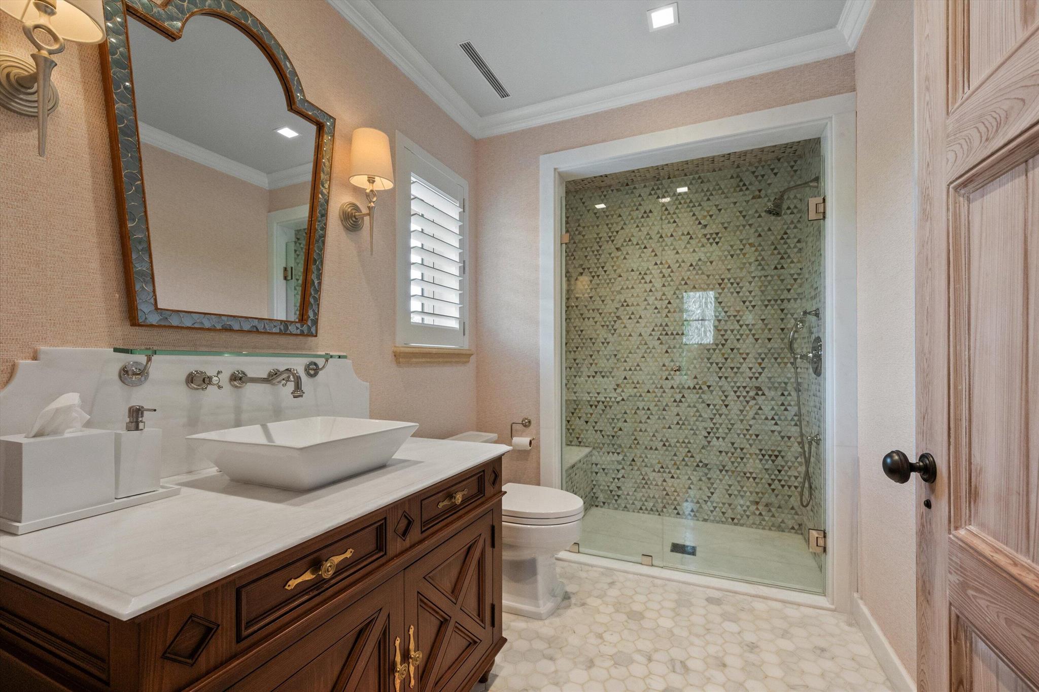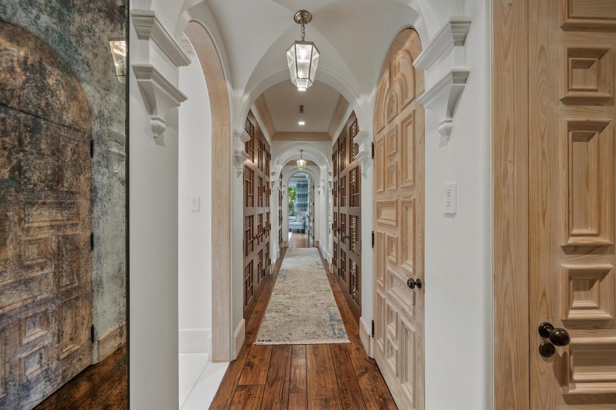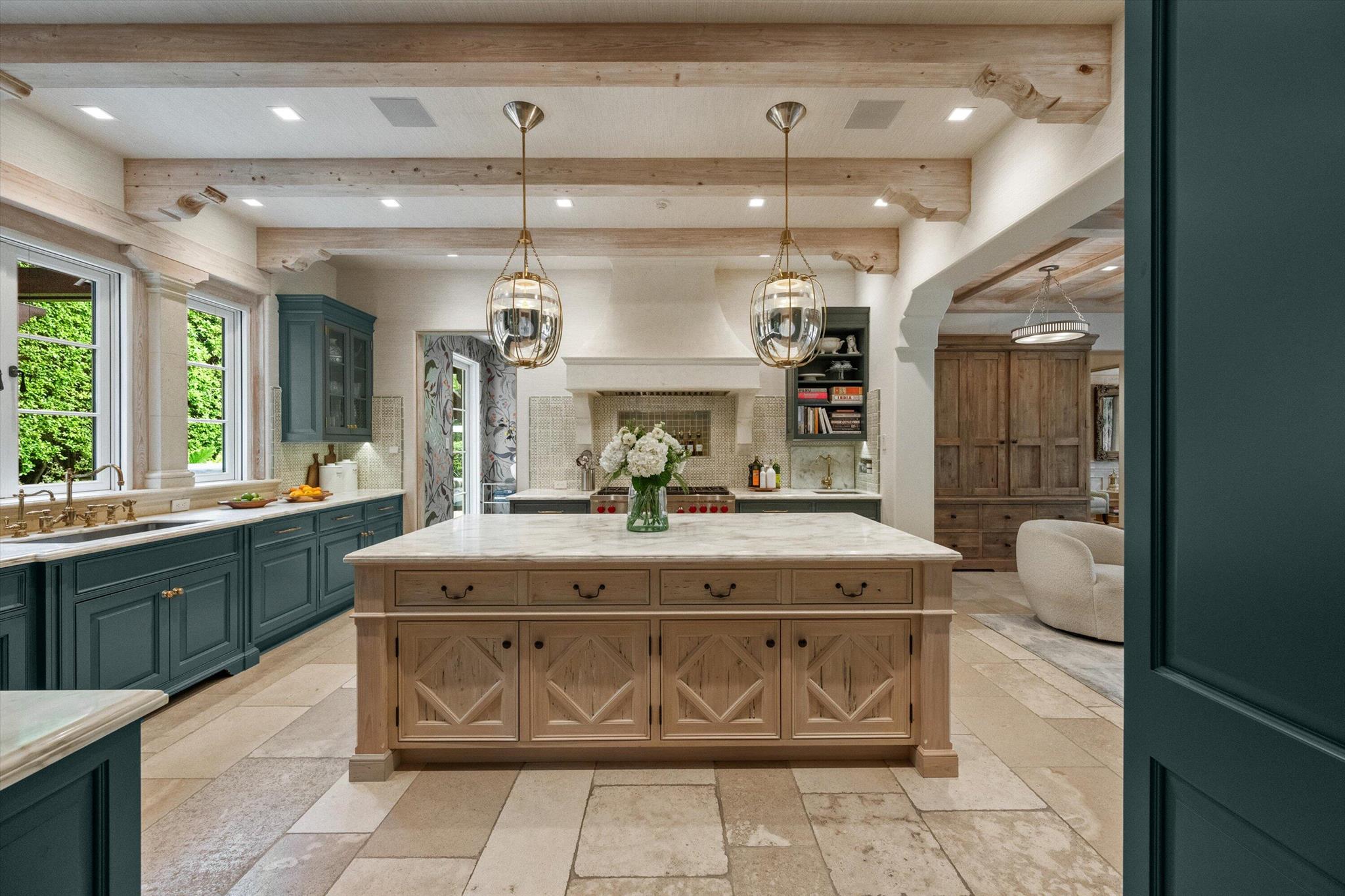 Stunning ocean block, custom 4-bedroom, 4.2-bath home spans 6,030 sq. ft. and showcases timeless elegance with modern luxury. Designed by Thomas Kirchhoff, the residence features a first-floor master suite, study, and a chef's kitchen with a center island opening to a spacious family room and screened loggia overlooking a lush yard, pool/spa, and cabana bath. Upstairs offers three en-suite bedrooms, a sitting room, a wet bar, laundry, and a large terrace--perfect for guests. High end finishes include extensive pecky cypress woodwork, custom millwork, 10-foot ceilings, a wine wall with a 450-bottle fridge, two gas fireplaces, multiple fountains, and a two-car garage. Deeded beach access and a full house generator complete this exceptional offering.