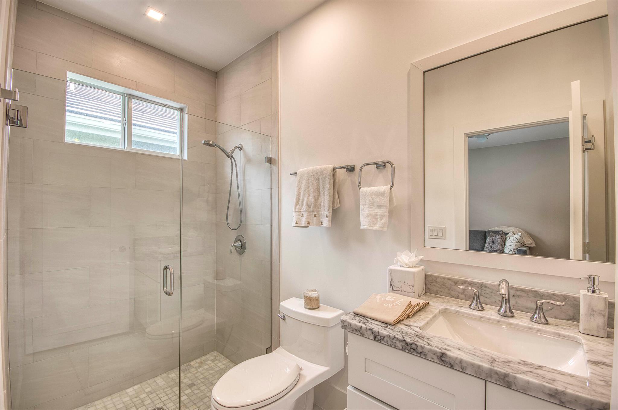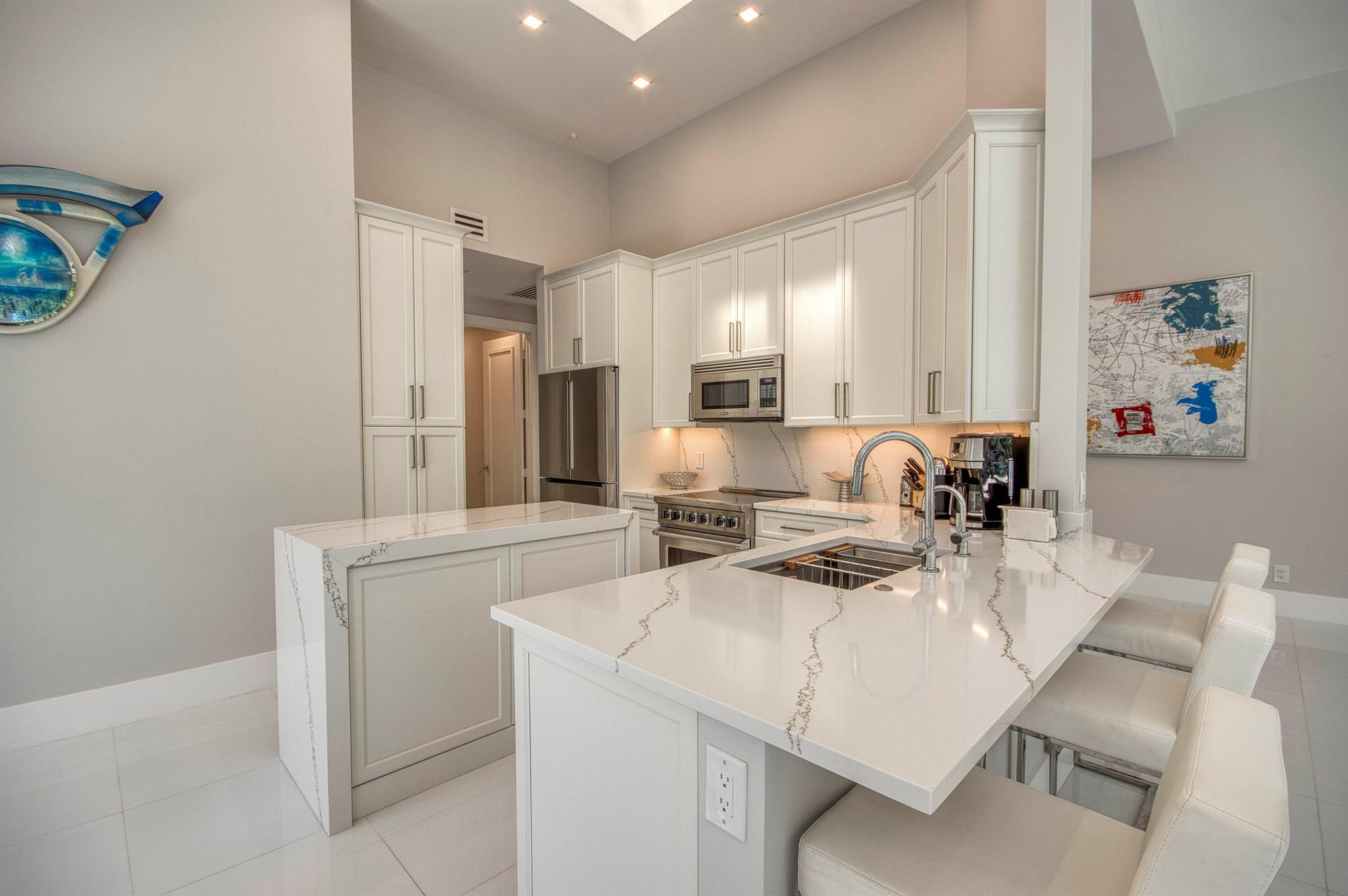 Experience elevated living in this stunning, bright, and beautifully fully renovated custom patio home, thoughtfully designed where impeccable craftsmanship meets modern elegance. Freshly painted and flooded with natural light, the open, spacious floor plan seamlessly blends indoor comfort with open views of the private pool and golf course. At the heart of the home is a stunning bespoke kitchen featuring custom cabinetry, premium appliances, stone countertops and center island, designer backsplash, and a waterfall island, perfectly capturing sophisticated style. Additional interior enhancements include smooth-finish ceilings, LED recessed lighting throughout, updated door hardware, Mirage hardwood flooring, Minka Aire ceiling fans, new closet doors in all bedrooms, an imported Spazio