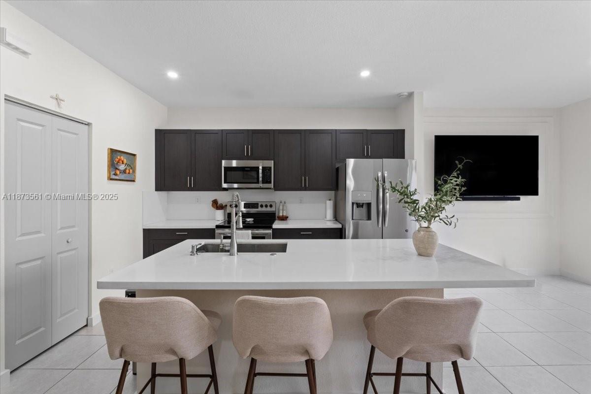 Welcome to this beautifully maintained 3-bedroom, 2.5-bath twin home in the sought-after Campo Bello community in Homestead. This move-in-ready home features quartz countertops, stainless steel appliances, a remodeled powder room, tile flooring on the first floor, and carpet upstairs. Crown moldings and a warm color palette add charm throughout. The garage is converted into a versatile flex space perfect as a playroom, office, or gym. The private backyard includes a spacious tiki hut ideal for entertaining or relaxing. Though attached, the layout and privacy feel like a single-family home. Community amenities include a pool, fitness center, clubhouse, and playgrounds. Conveniently located near top-rated schools, shopping, dining, and major highways.