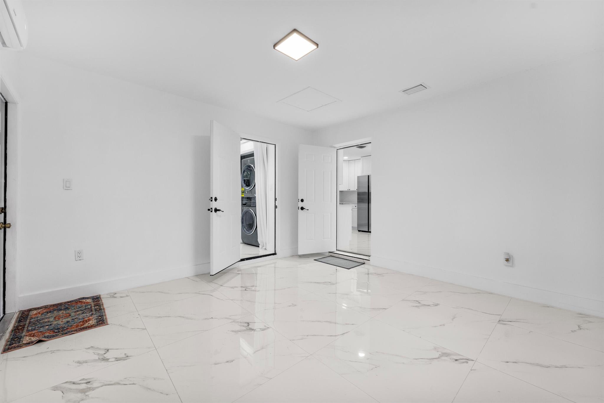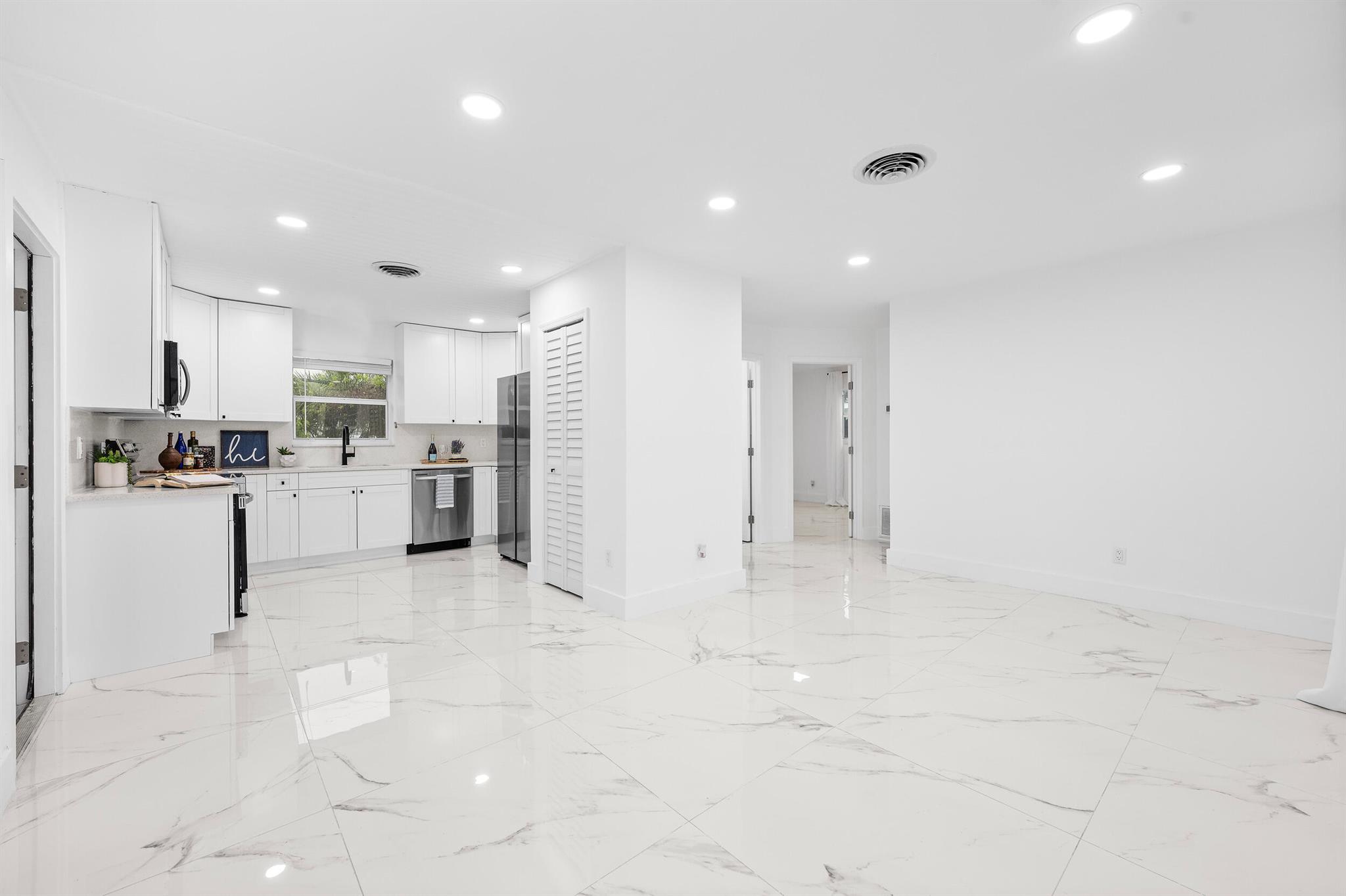 Modern, renovated 3-bedroom, 2-bathroom Jensen Beach home close to the surf with opportunity to rent half as an Accessory-Dwelling Unit (ADU) or Mother-In-Law Quarters! Updated kitchen with custom-wood-soft-close cabinets, ivory-quartz countertops and backsplash and new stainless appliances. Open-concept, 1,106-square-feet, with marble-porcelain-tile and impact-front door providing extra light. Sleek, black accessories include modern lighting, faucets and knobs. Large-main bedroom with private-entrance has en-suite bathroom - black-marble-tile shower with glass door, wooden vanity and lighted mirror. New stainless-stackable washer and dryer. That space has side-entrance door and private door to main house. Could be rented as studio to pay mortgage. Airbnb and mid-term .
