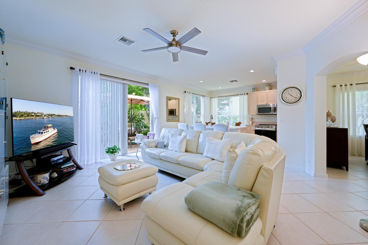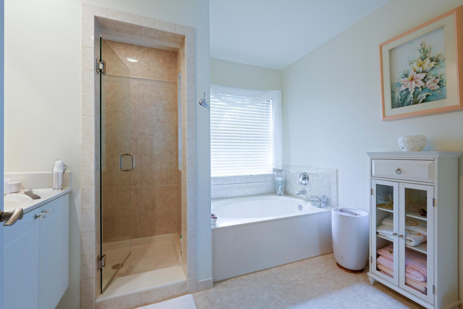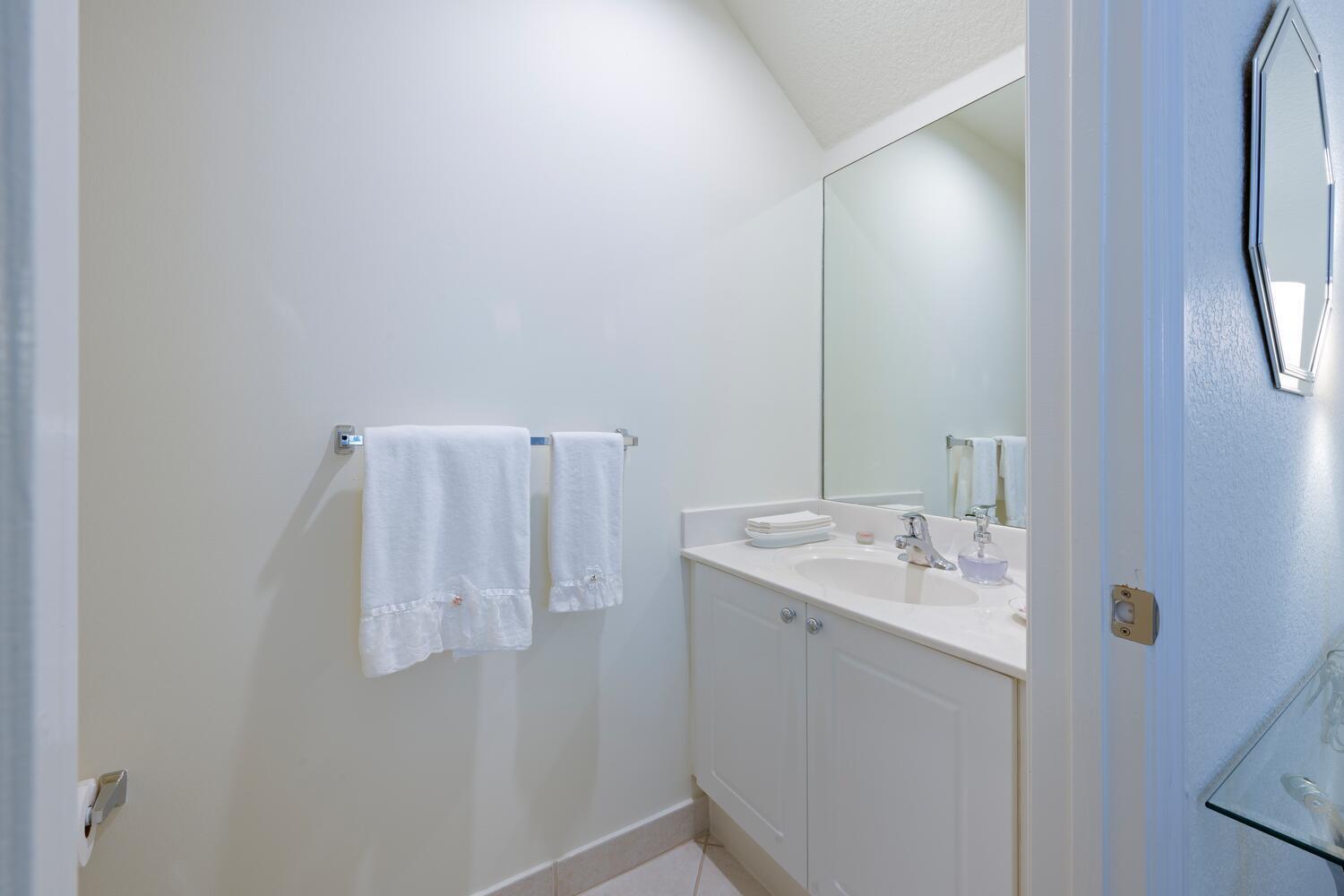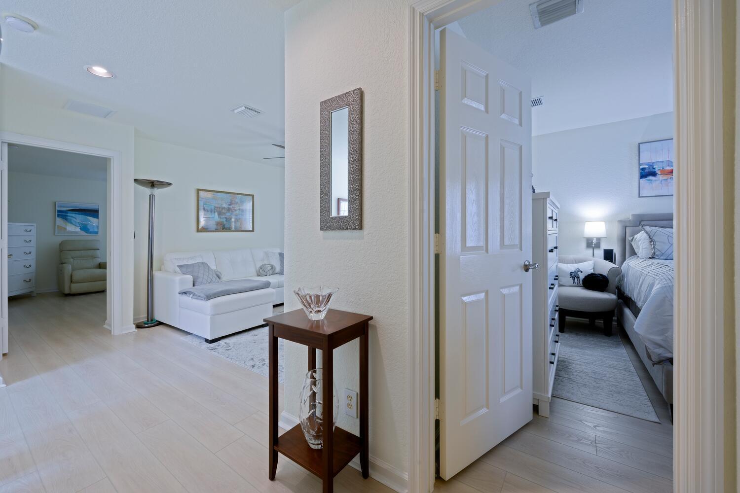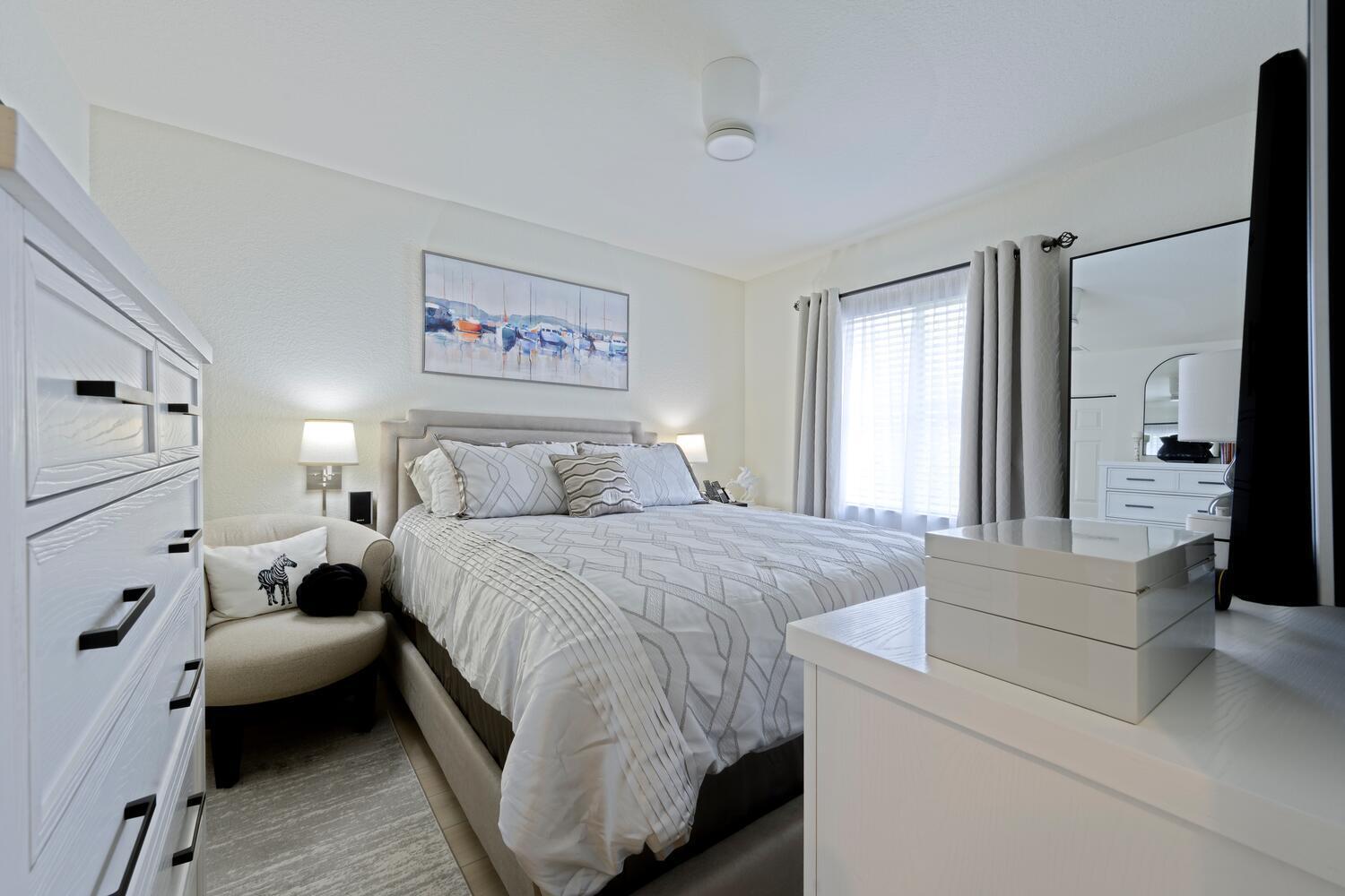 Welcome to this hidden gem nestled in the highly sought-after Lakes of Laguna. This stunning 4-bedroom, 2.5-bathroom home offers a private retreat and is perfect for entertaining or accommodating a large family. This home has a spacious layout featuring multiple gathering areas both upstairs and downstairs, inside and outside.Step into the large, light-filled living room, highlighted by a classy chandelier, wall sconces, and abundant natural light from oversized windows. Accordion hurricane shutters throughout provide both safety and convenience. The formal dining area is a showpiece, featuring a custom chandelier framed by a stylish ceiling soffit that adds depth and architectural character to the space. Beautiful tile floors downstairs, recently refreshed grout, and classy