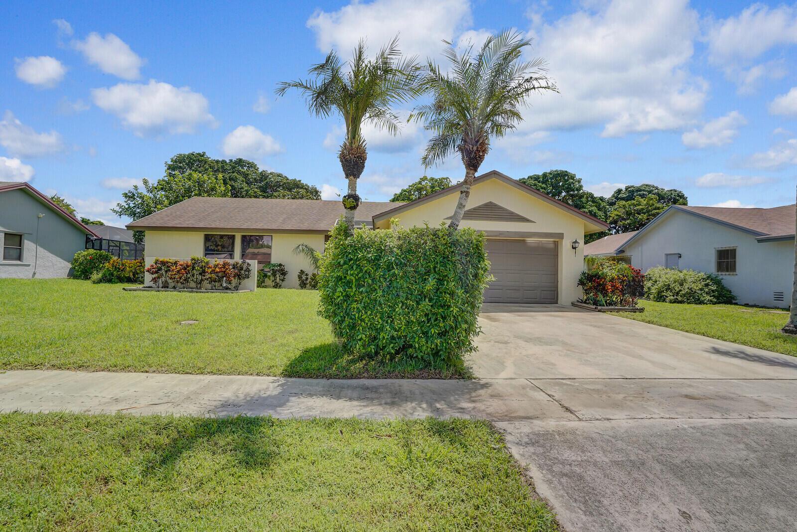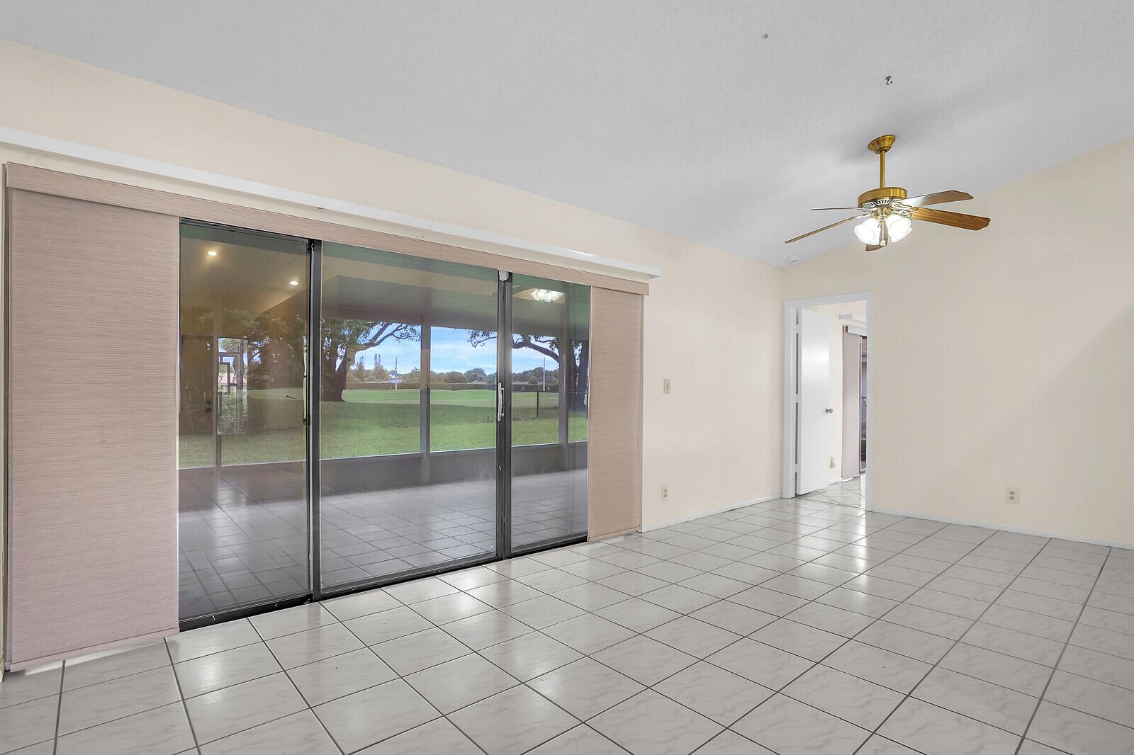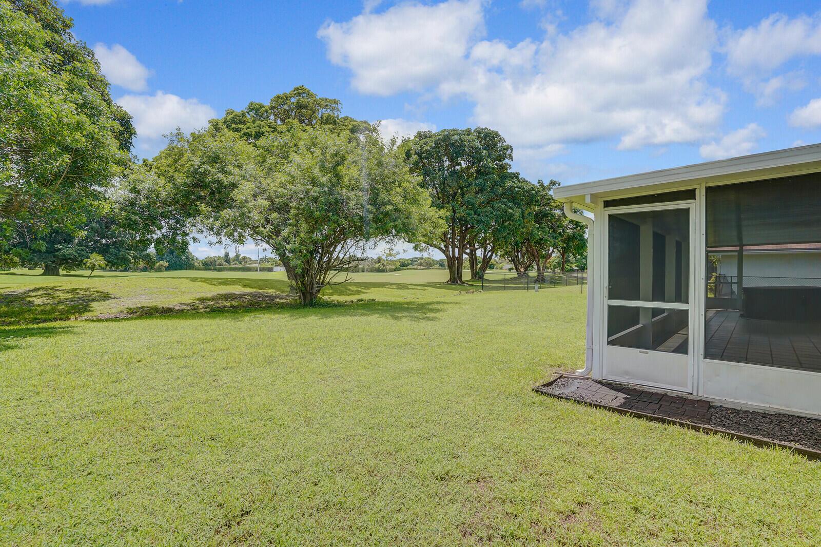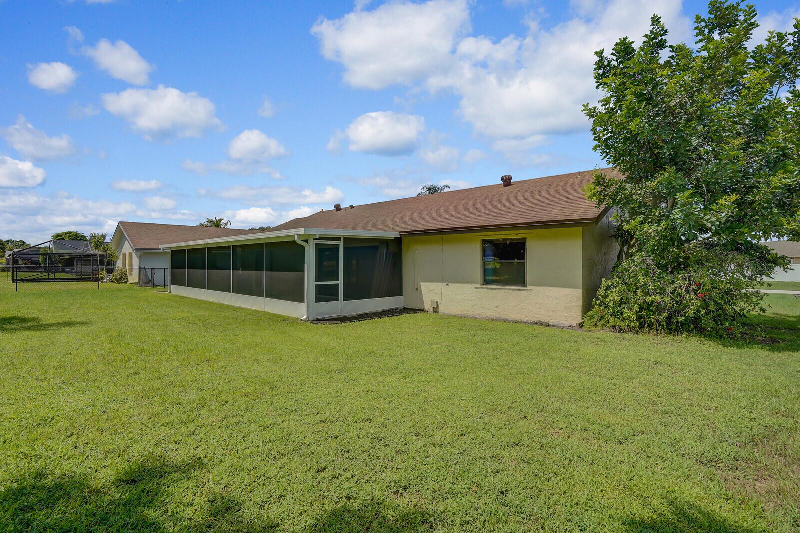 Incredible VALUE! Superb views are seen from this 'RARE'' 3-bedroom, 2-bath, 2-car garage, PLUS BONUS ROOM DEN/OFFICE, (can easily become a 4th BEDROOM by adding a closet) one-story single-family home directly on the Palm Beach County Southwinds Golf course. Large and private backyard with a covered and screened patio almost the full width of the home! The roof was installed 7/17/2020, A/C installed 9/14/2024 and upgraded kitchen cabinets with solid surface countertops. Living areas are fully tiled! INCREDIBLY LOW HOA just $75 MONTHLY. Newly upgraded community lighted amenities include pool, Gathering place, playground area, tennis, pickleball and basketball courts. Highly rated schools. No membership or dues required to play on the Palm Beach County Golf Course. Just pay and play