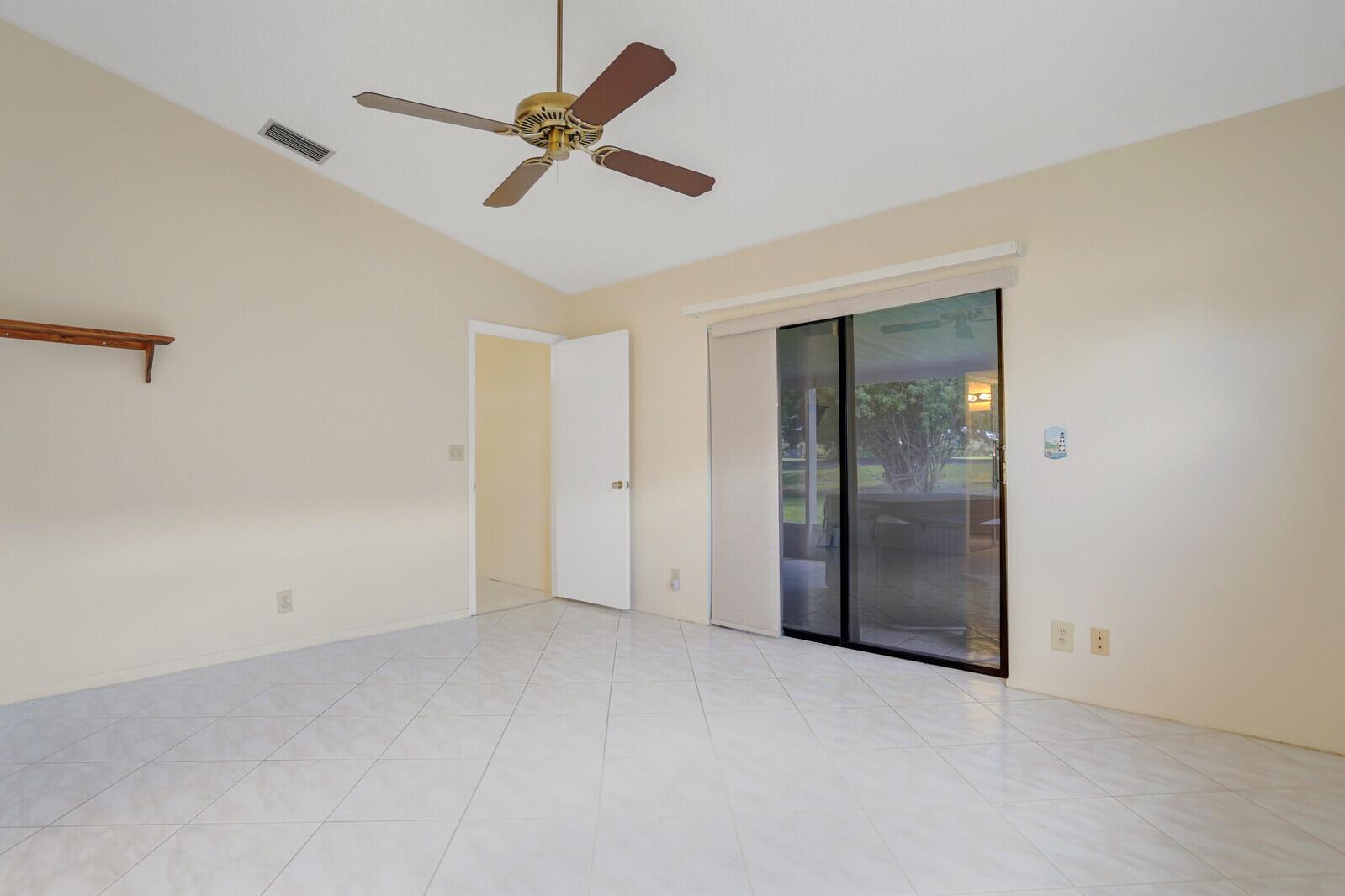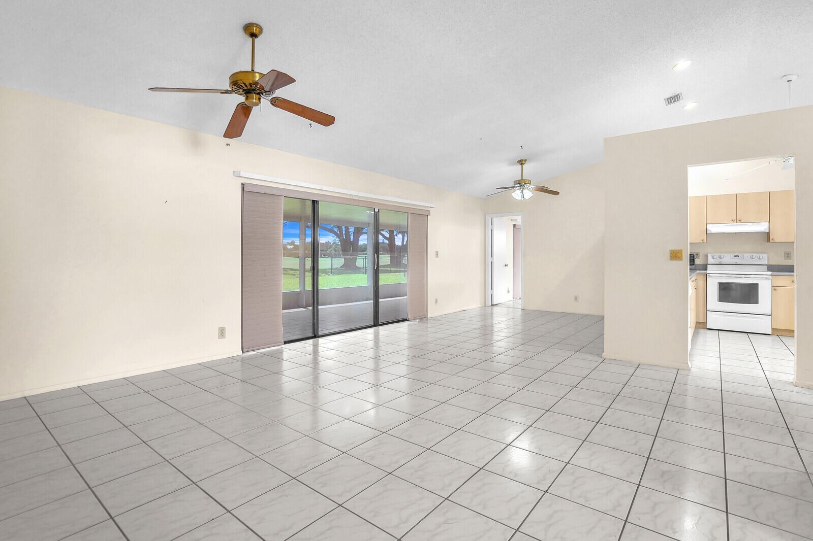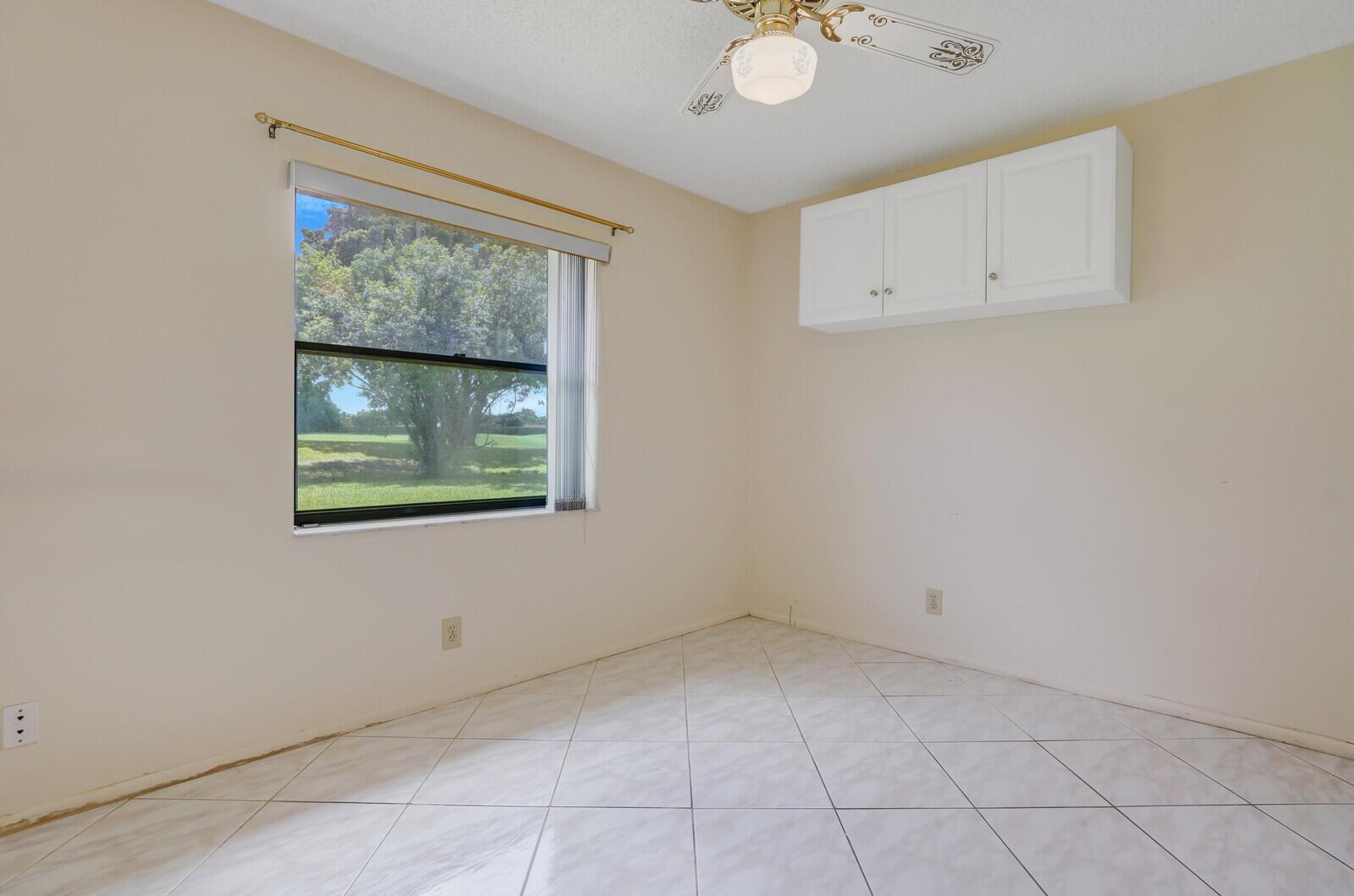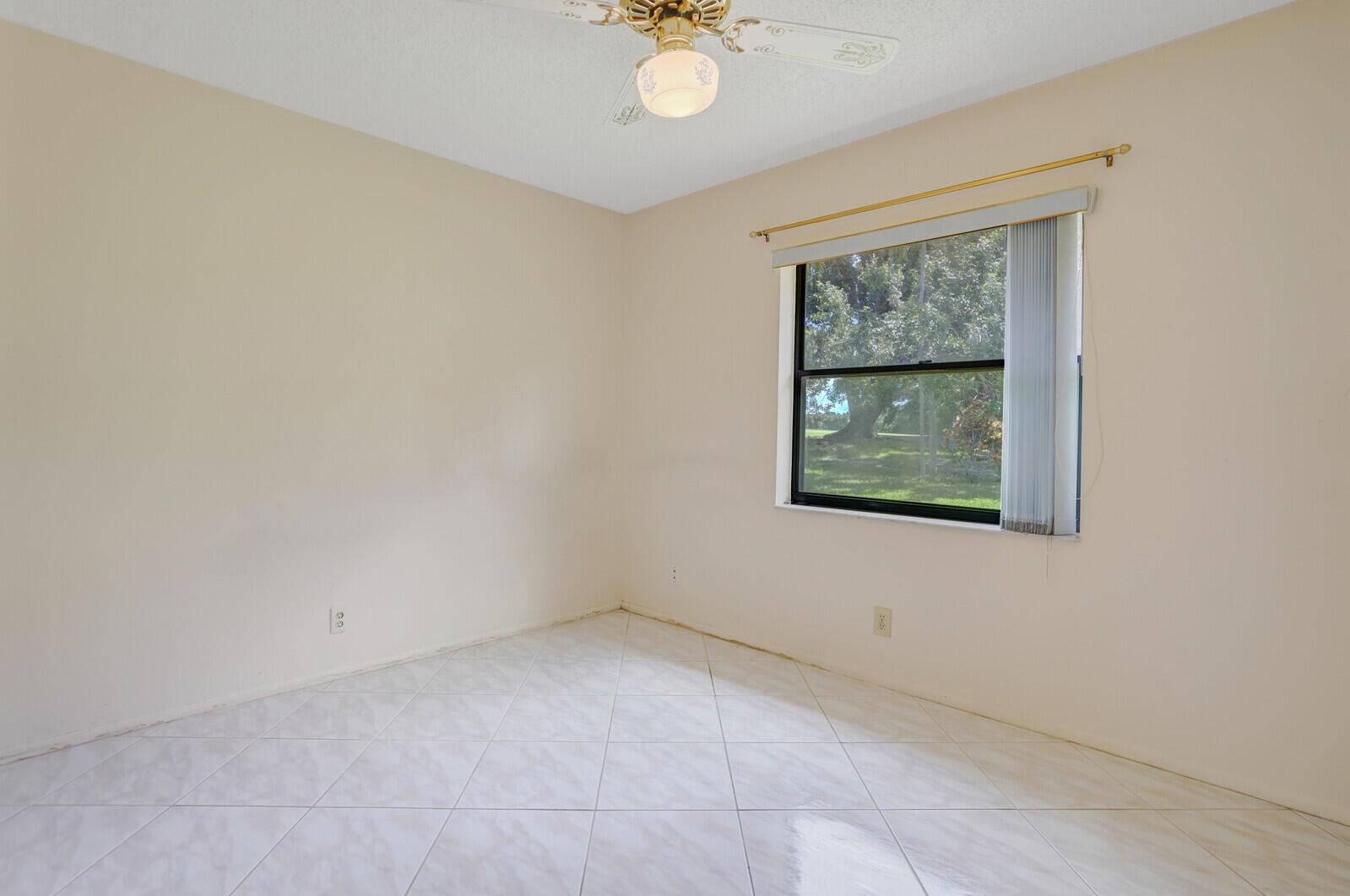Incredible VALUE! Superb views are seen from this 'RARE'' 3-bedroom, 2-bath, 2-car garage, PLUS BONUS ROOM DEN/OFFICE, (can easily become a 4th BEDROOM by adding a closet) one-story single-family home directly on the Palm Beach County Southwinds Golf course. Large and private backyard with a covered and screened patio almost the full width of the home! The roof was installed 7/17/2020, A/C installed 9/14/2024 and upgraded kitchen cabinets with solid surface countertops. Living areas are fully tiled! INCREDIBLY LOW HOA just $75 MONTHLY. Newly upgraded community lighted amenities include pool, Gathering place, playground area, tennis, pickleball and basketball courts. Highly rated schools. No membership or dues required to play on the Palm Beach County Golf Course. Just pay and play